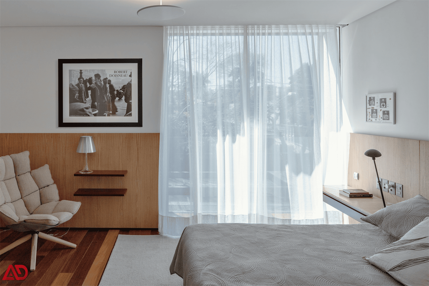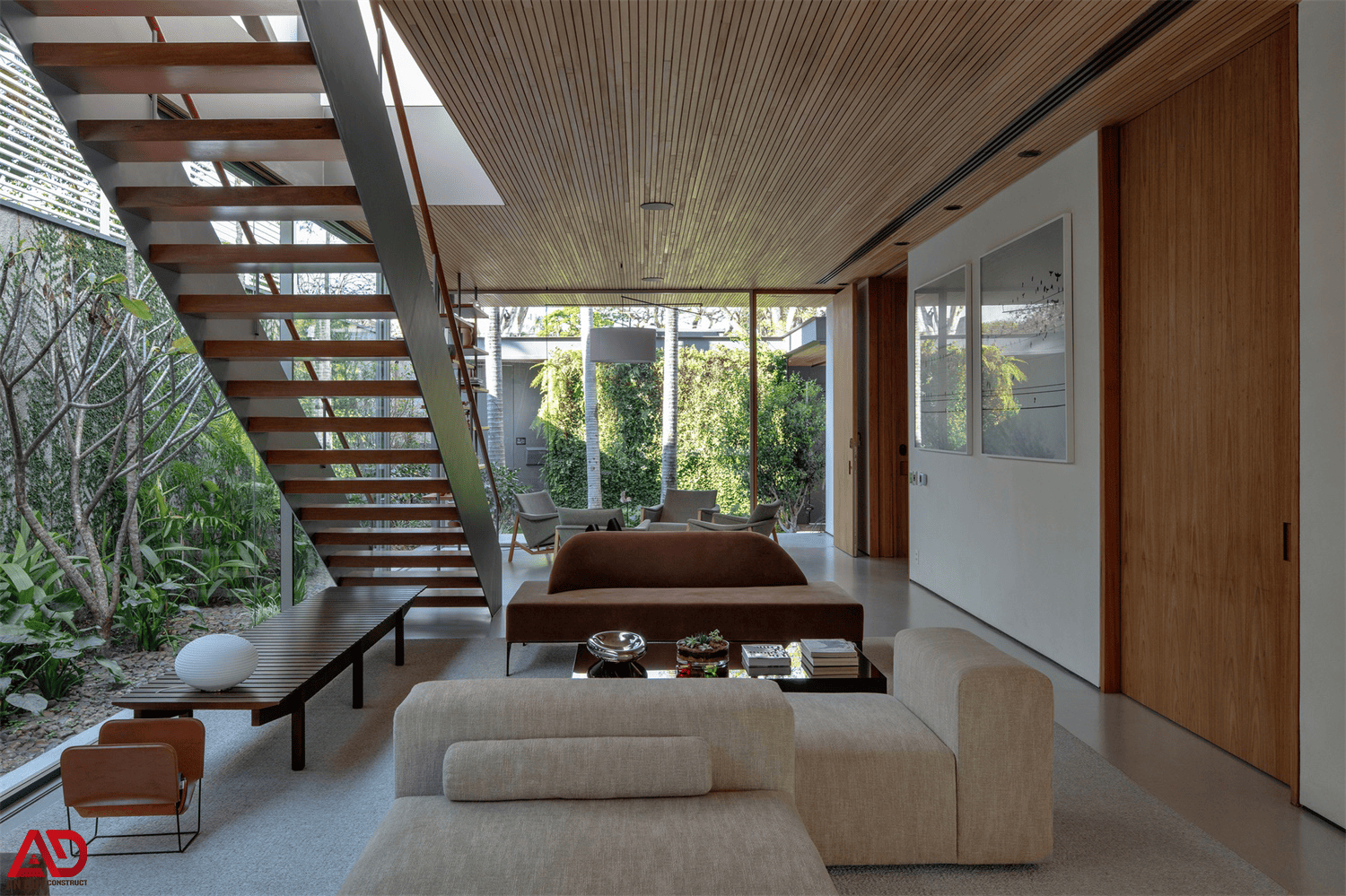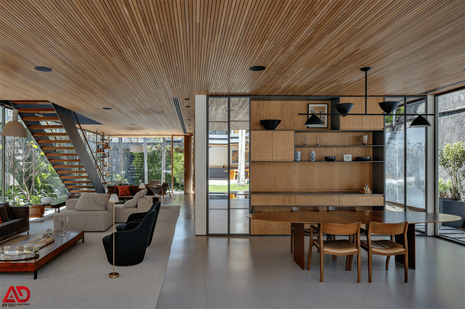 Tổng thể không gian gây ấn tượng mạnh bởi hệ trần gỗ lam chạy xuyên suốt, mang lại cảm giác ấm áp, sang trọng và tạo chiều sâu cho toàn bộ nội thất. Bên cạnh đó, các mảng kính lớn được khai thác tối đa để đón ánh sáng tự nhiên, mở rộng tầm nhìn ra khu vườn xanh mát, từ đó tạo nên một không gian sống thư thái, gần gũi thiên nhiên.