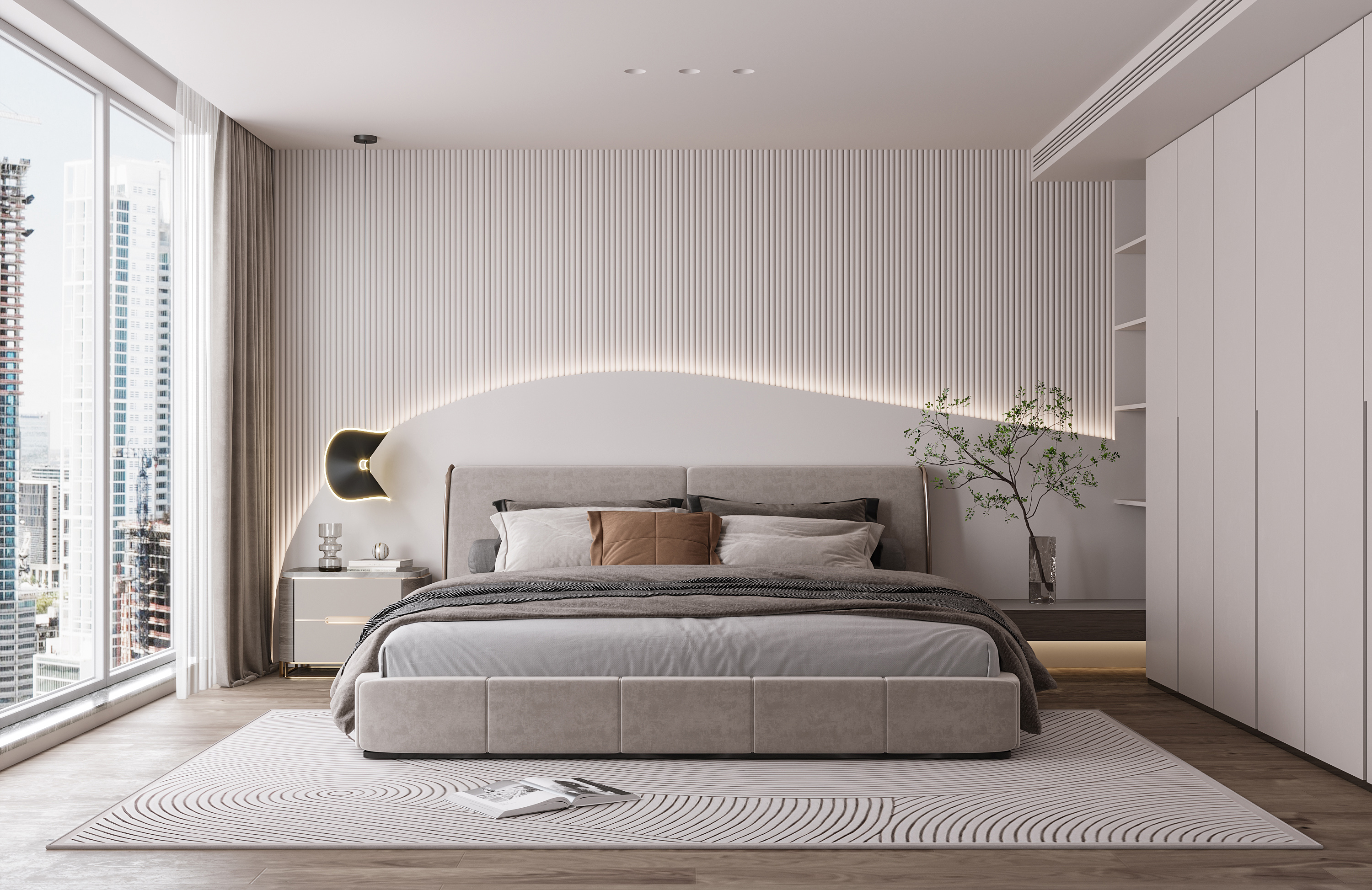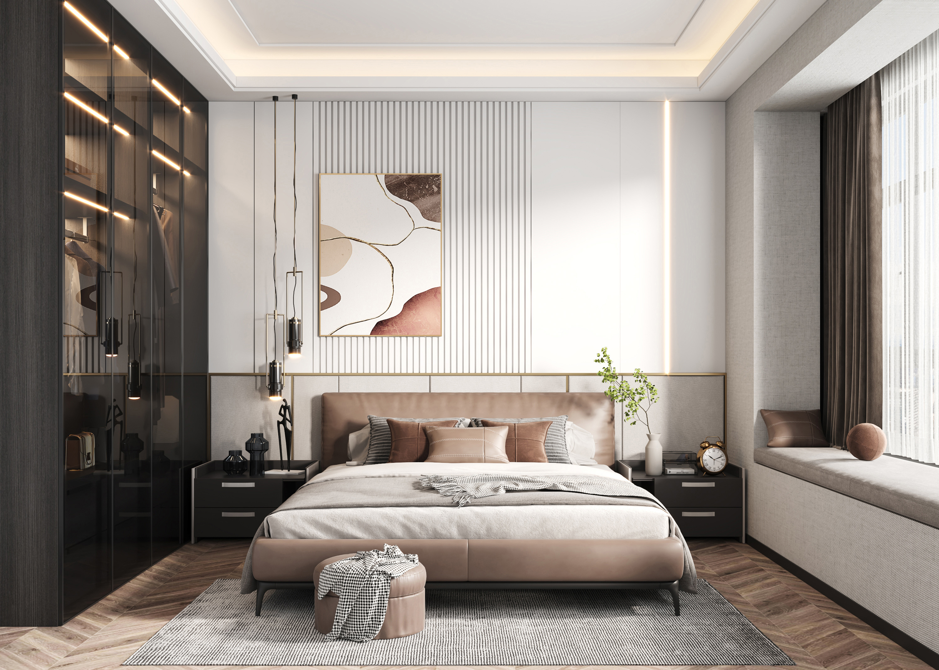 Trong nhiều mẫu phòng ngủ hiện đại, khu vực đầu giường chính là trung tâm thị giác của cả không gian. Chỉ cần xử lý tốt vách đầu giường bằng lam dọc, panel bọc nệm, tranh nghệ thuật hoặc đường hắt sáng, căn phòng đã có thể tạo được dấu ấn rất riêng.