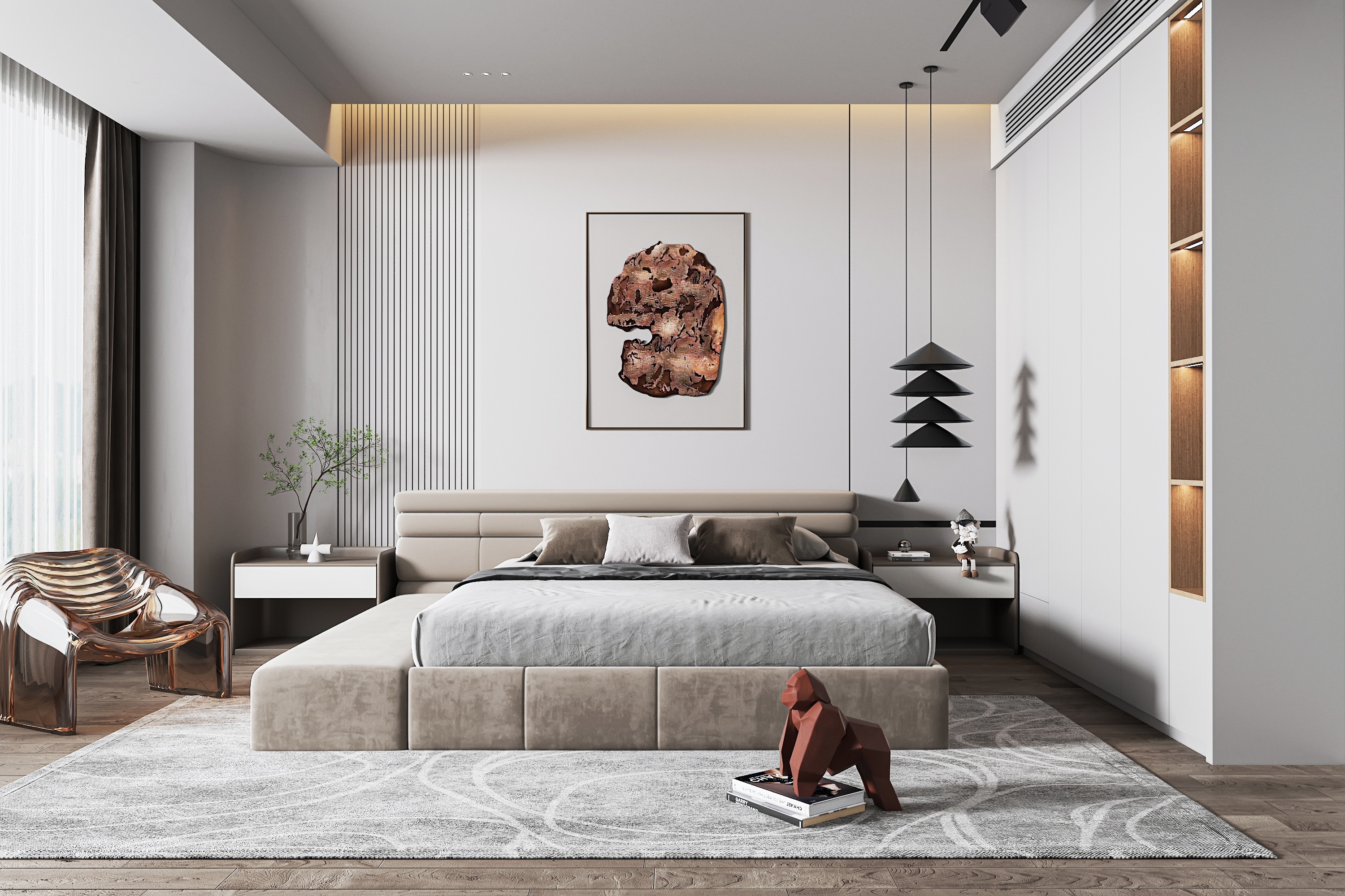 Bên cạnh đó, ánh sáng cũng đóng vai trò quan trọng trong việc tạo bầu không khí. Ánh sáng tự nhiên từ cửa sổ lớn giúp căn phòng thoáng hơn vào ban ngày, còn đèn thả, đèn đầu giường và đèn hắt trần giúp tăng chiều sâu vào buổi tối. Kết hợp cùng vật liệu như gỗ, kính, nỉ, kim loại hay đá vân nhẹ, phòng ngủ sẽ trở nên sang trọng và có điểm nhấn rõ ràng hơn.