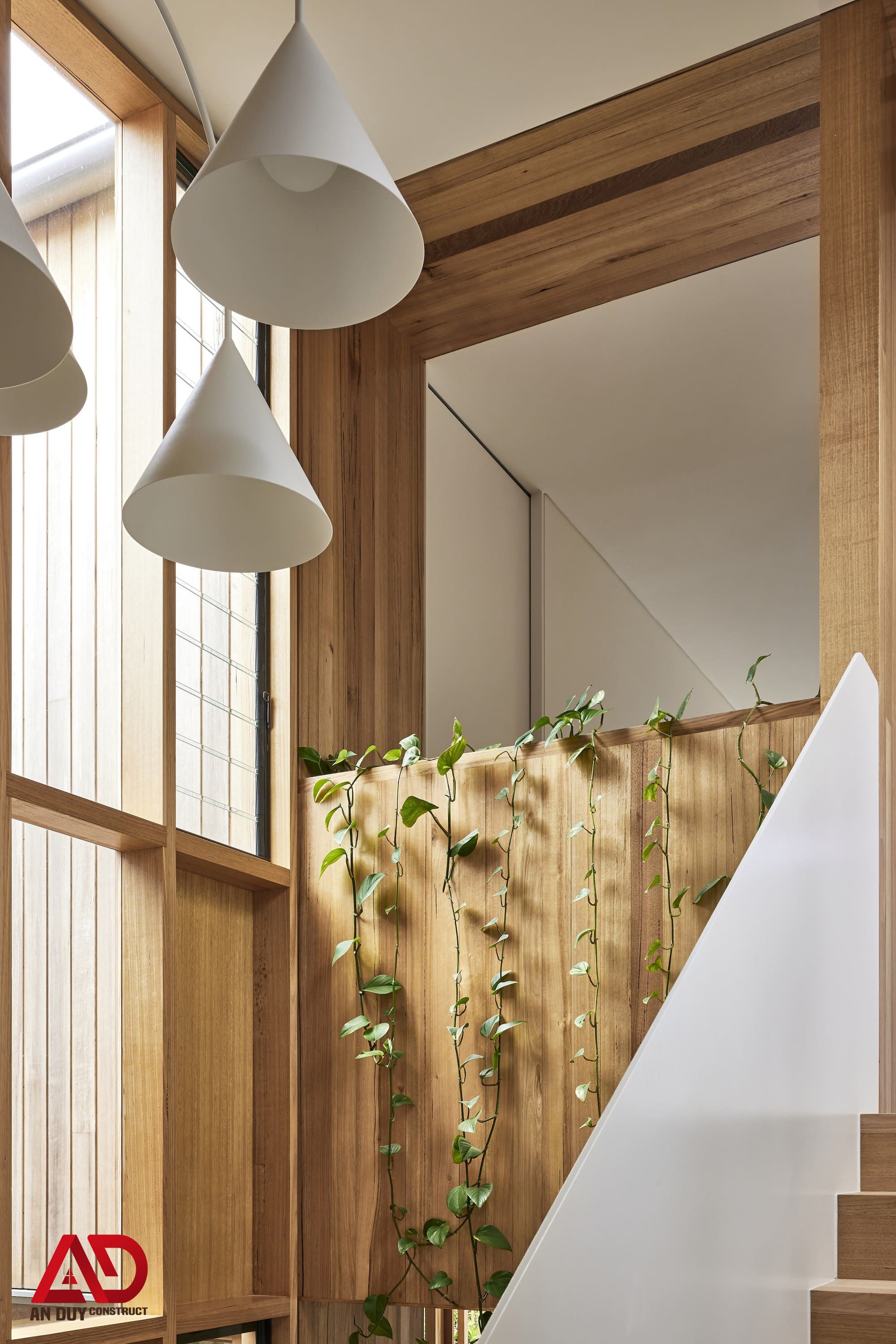 Điểm đặc biệt rất đáng giá trong công trình là cách đưa thiên nhiên vào nội thất. Những dây cây xanh rủ mềm từ tầng trên xuống không chỉ là điểm nhấn thị giác mà còn làm dịu vật liệu cứng như bê tông, kính và đá. Ánh sáng tự nhiên len qua các khung cửa gỗ lớn tạo nên hiệu ứng thay đổi liên tục trong ngày, khiến ngôi nhà luôn sống động và có chiều sâu.