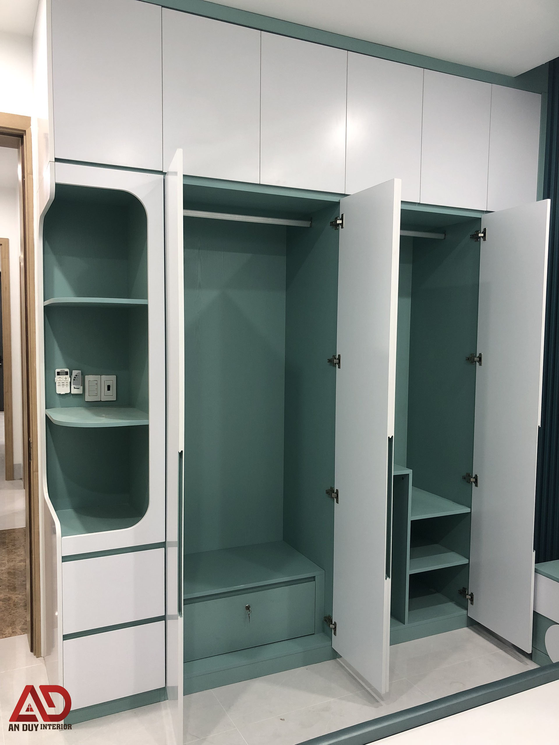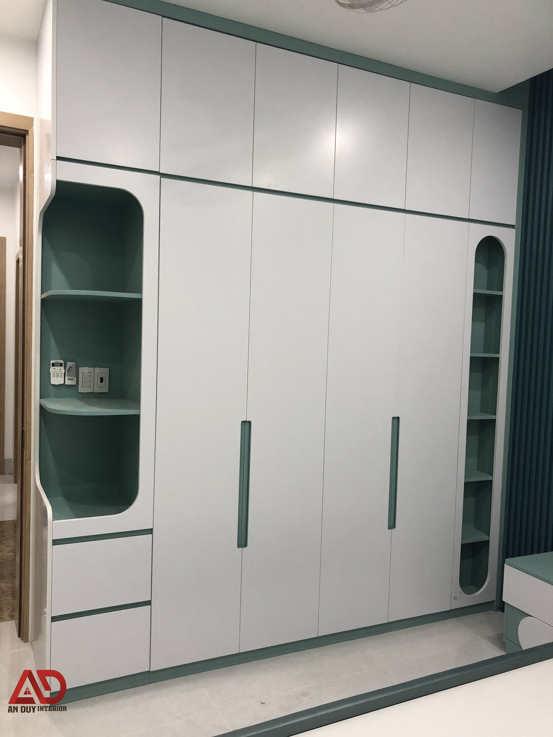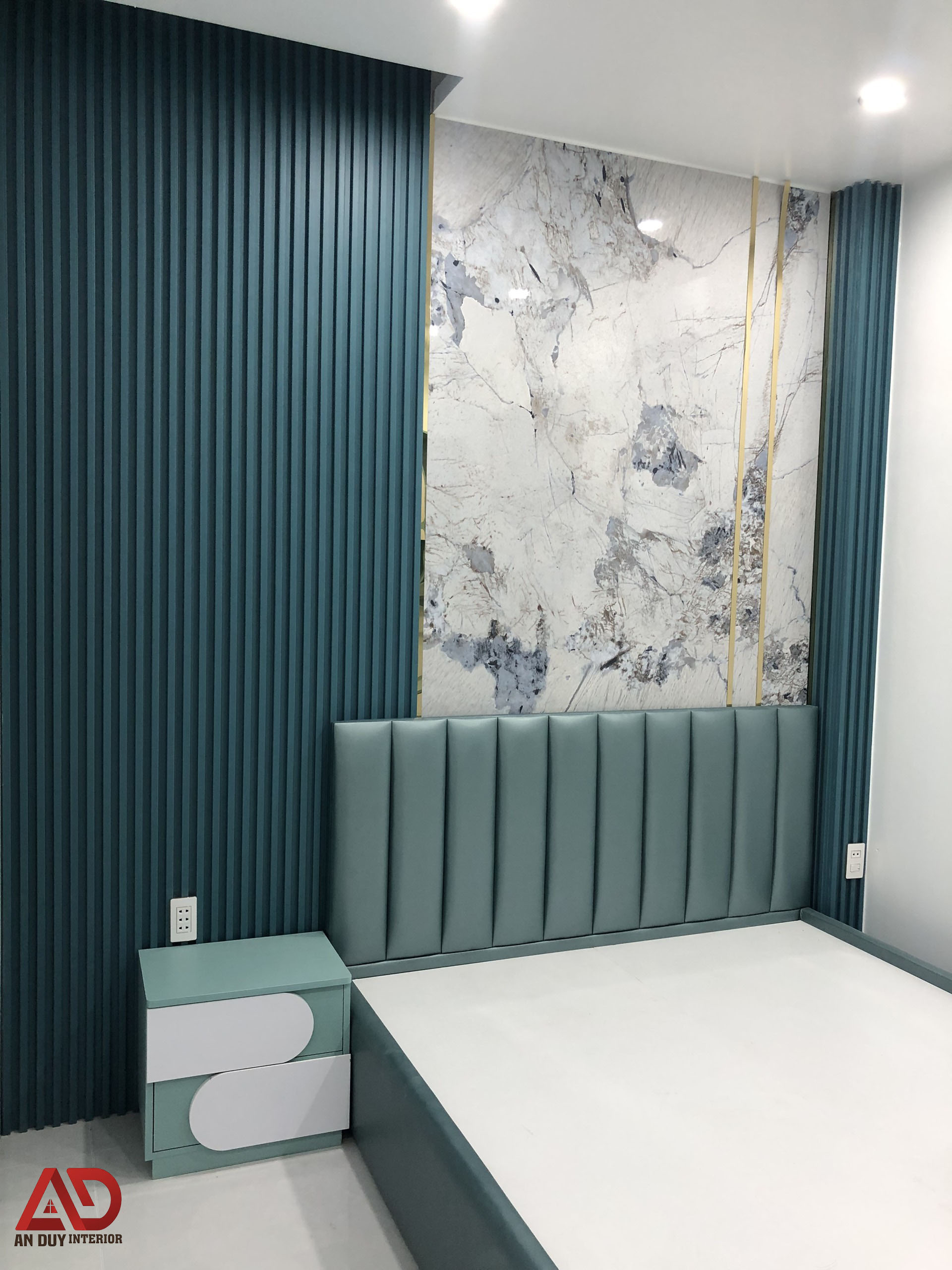Một trong những khu vực nổi bật nhất của công trình là phòng ngủ tông xanh ngọc, nơi An Duy Interior tạo nên sự khác biệt bằng cách phối hợp mảng ốp lam dọc, đầu giường bọc nệm và vách trang trí vân đá đầy tính thẩm mỹ. Tổng thể mang lại cảm giác trẻ trung, thư giãn nhưng vẫn rất sang trọng. Tông xanh ngọc không quá chói, ngược lại giúp không gian mềm mại hơn, tạo sự dễ chịu cho khu vực nghỉ ngơi.