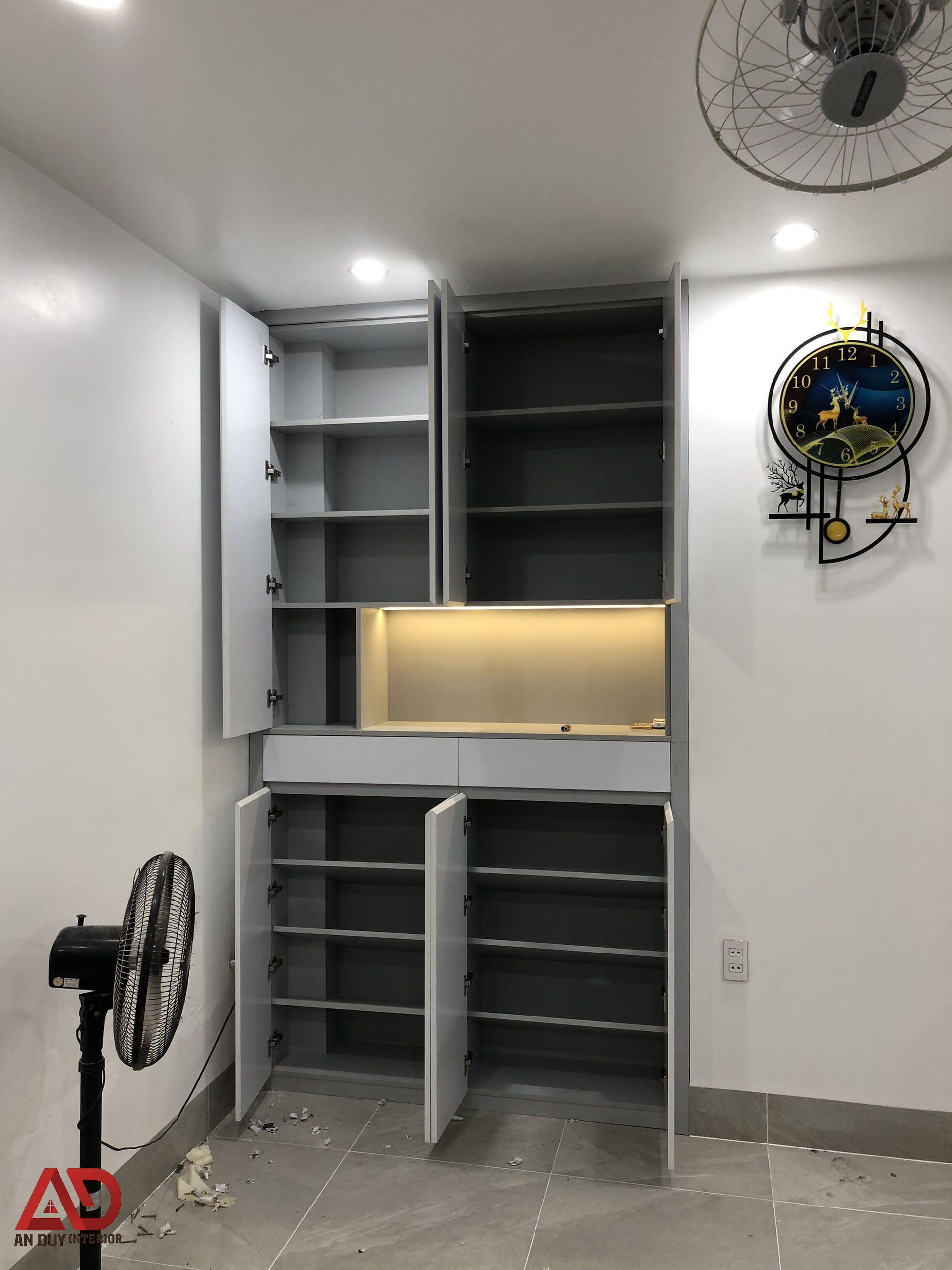 Ngoài những không gian chính, công trình còn có hệ tủ lưu trữ đa năng với thiết kế cánh mở, nhiều ngăn chia khoa học và khoang hở có đèn led. Đây là giải pháp lưu trữ thông minh, vừa giúp nhà cửa gọn gàng hơn vừa tạo nên sự chỉn chu cho tổng thể nội thất.