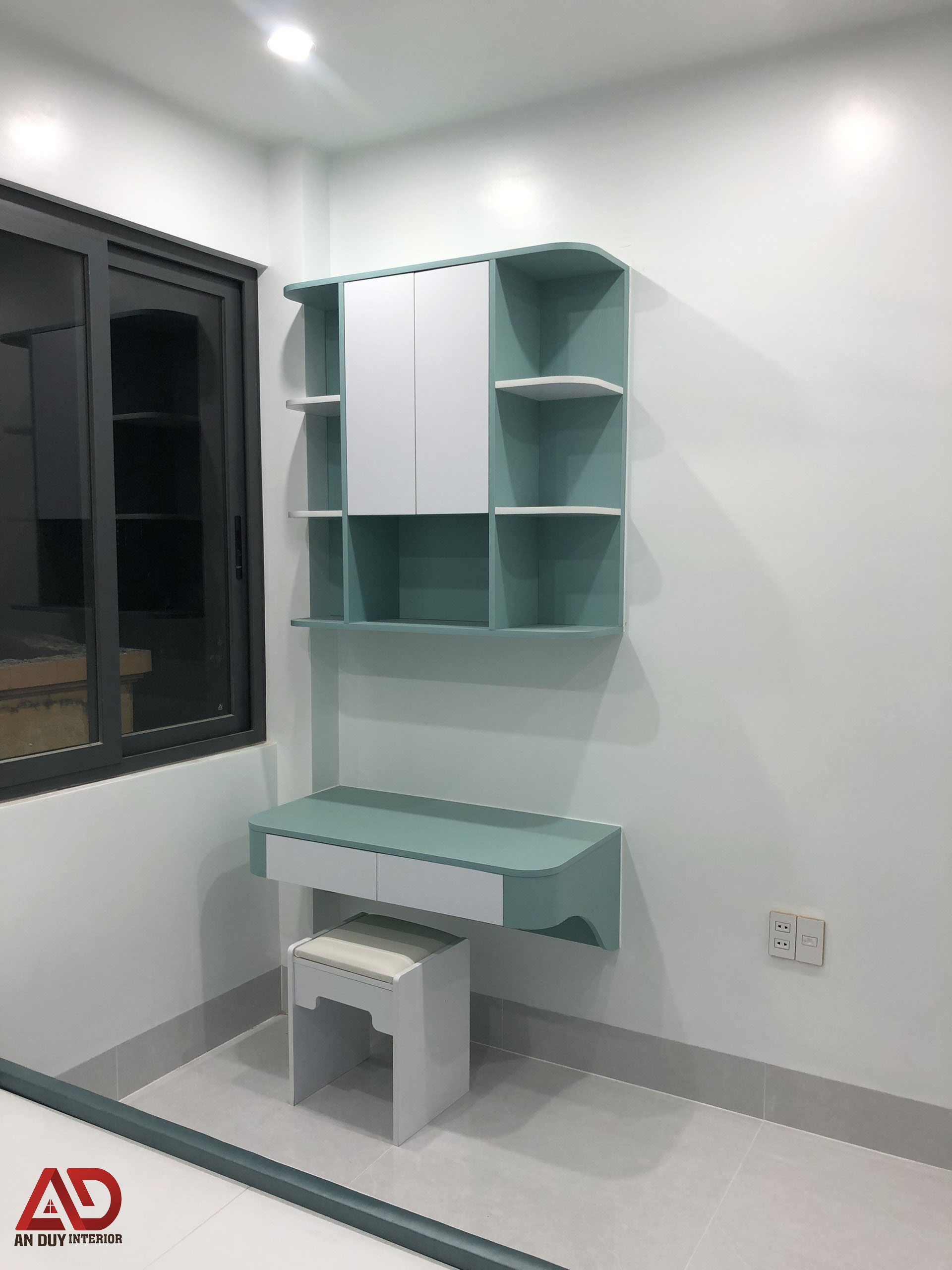 Bên cạnh đó, khu vực bàn trang điểm treo tường được thiết kế nhỏ gọn nhưng vẫn đầy đủ công năng, kết hợp cùng hệ tủ treo mở phía trên để tăng tính tiện dụng. Đây là giải pháp rất phù hợp với nhà phố hiện đại, nơi mọi khu vực đều cần được tính toán kỹ để tối ưu diện tích sử dụng mà vẫn giữ được tính thẩm mỹ.