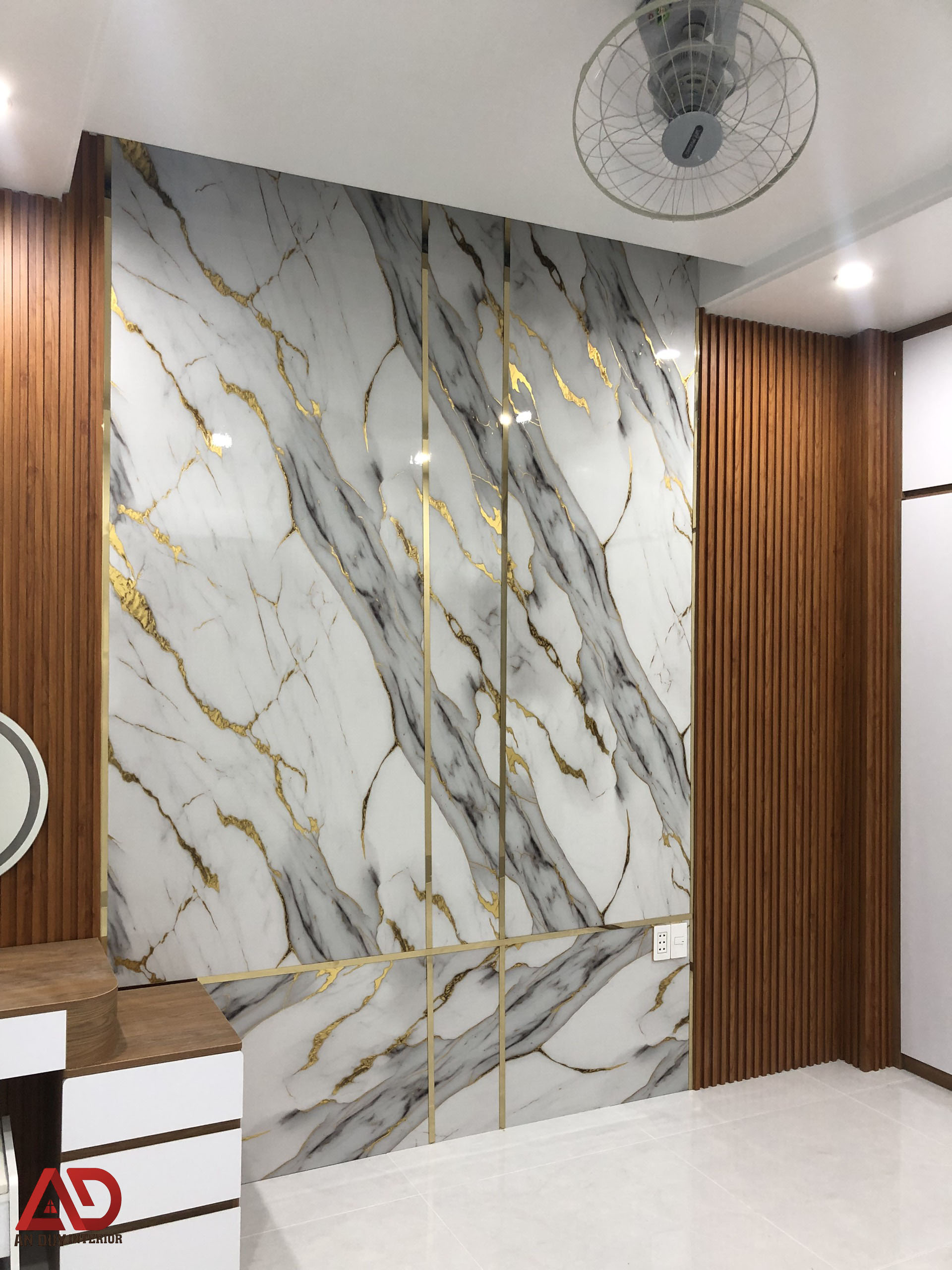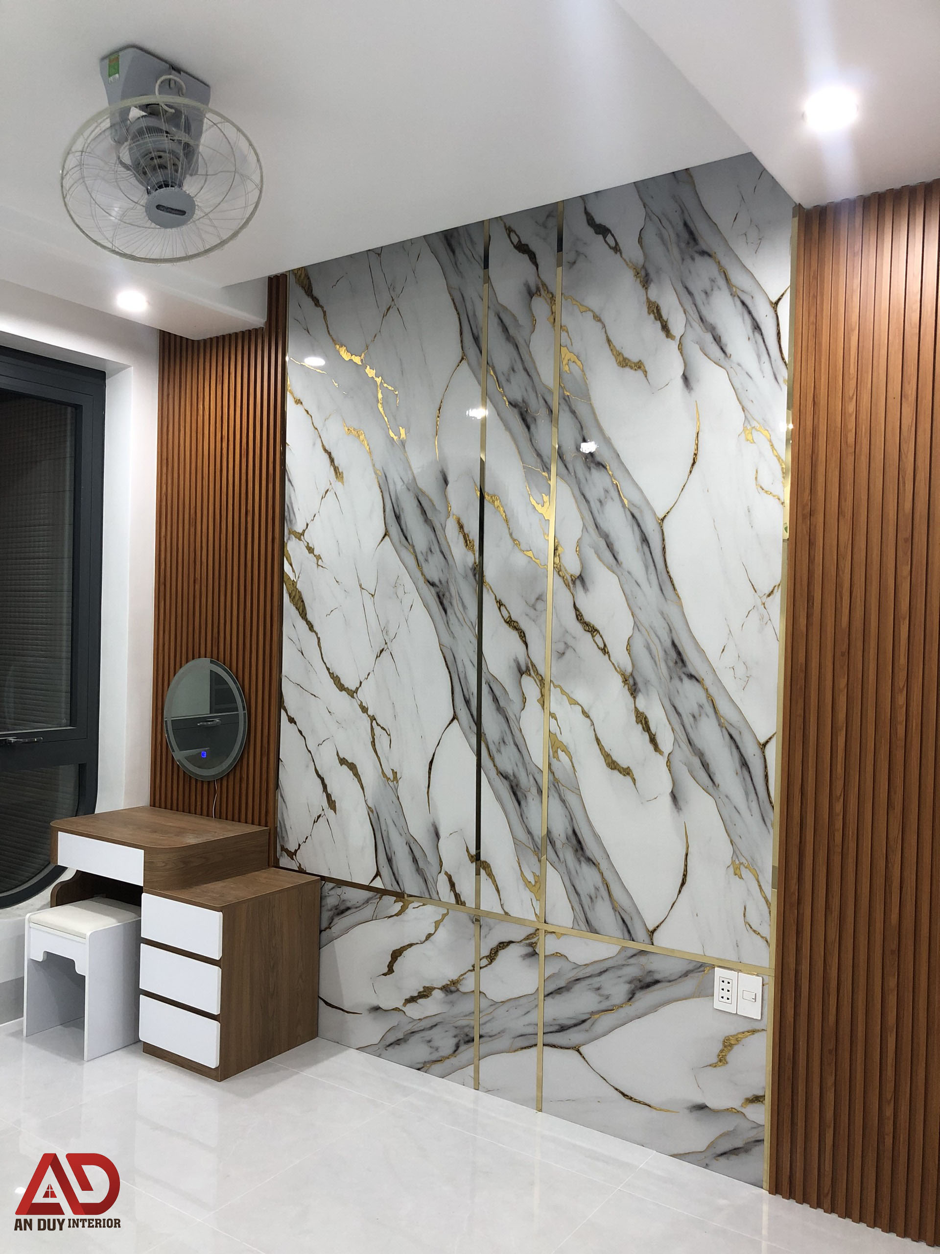 Ở một phòng ngủ khác, công trình sử dụng vách đá vân mây phối lam gỗ làm điểm nhấn phía sau khu bàn trang điểm và khu vực tủ áo. Sự kết hợp giữa vân đá, nẹp kim loại và lam gỗ tạo nên hiệu ứng sang trọng, hiện đại và có chiều sâu. Đây là kiểu xử lý nội thất được nhiều gia chủ yêu thích vì vừa bền về thẩm mỹ, vừa tạo cảm giác cao cấp cho không gian.