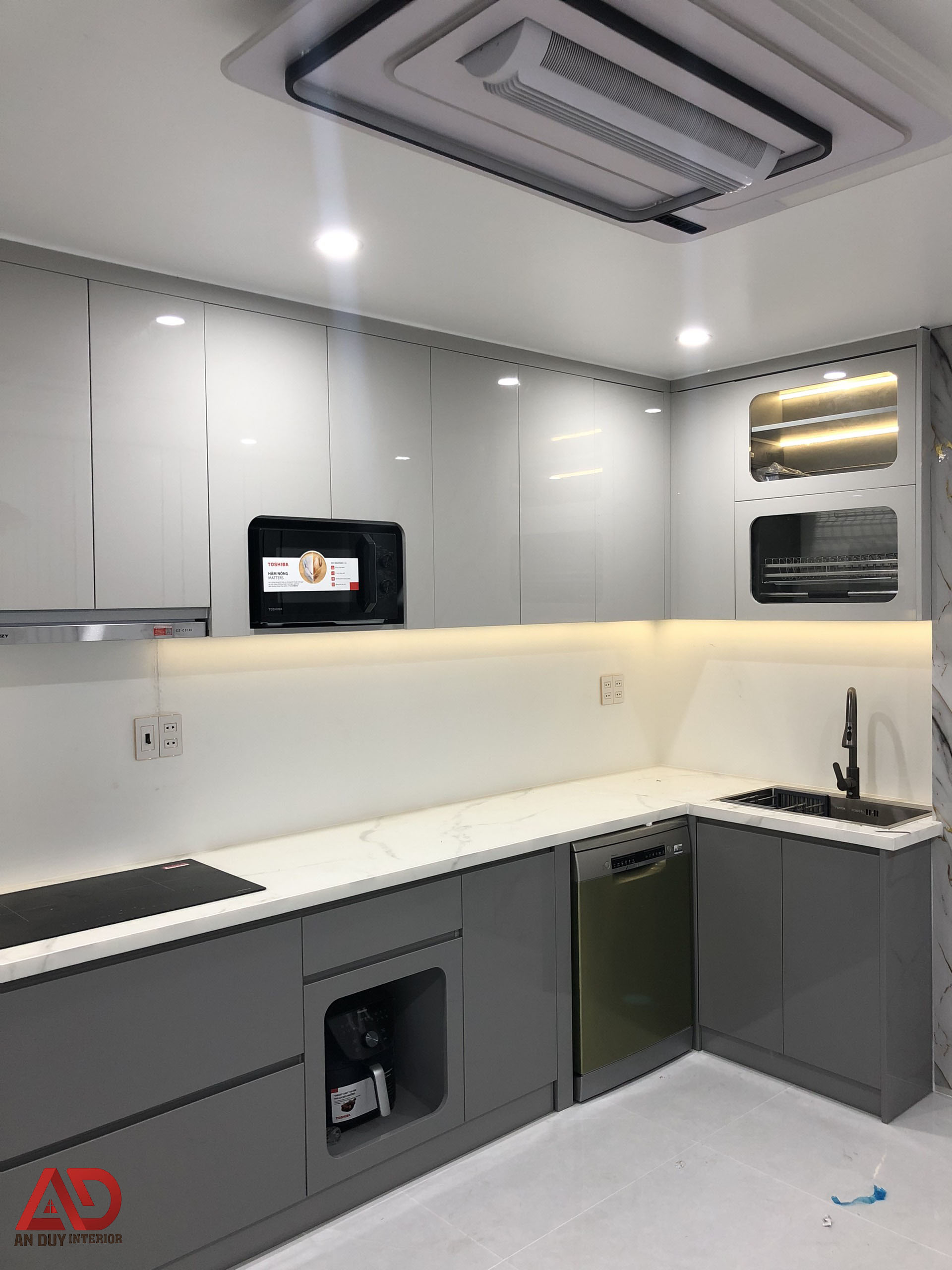 Khu vực bếp được triển khai theo dạng bếp chữ L hiện đại, sử dụng cánh tủ màu xám bóng phối mặt bếp sáng, mang lại cảm giác sạch sẽ và tinh gọn. Hệ tủ trên dưới bố trí khoa học, tích hợp thêm khoang để lò vi sóng, máy rửa chén và giá úp chén âm tủ, đáp ứng tốt nhu cầu sử dụng hằng ngày của gia đình. Ánh sáng led hắt dưới tủ giúp khu bếp thêm phần ấm cúng và dễ thao tác hơn trong sinh hoạt thực tế.
