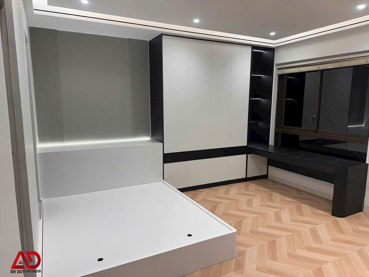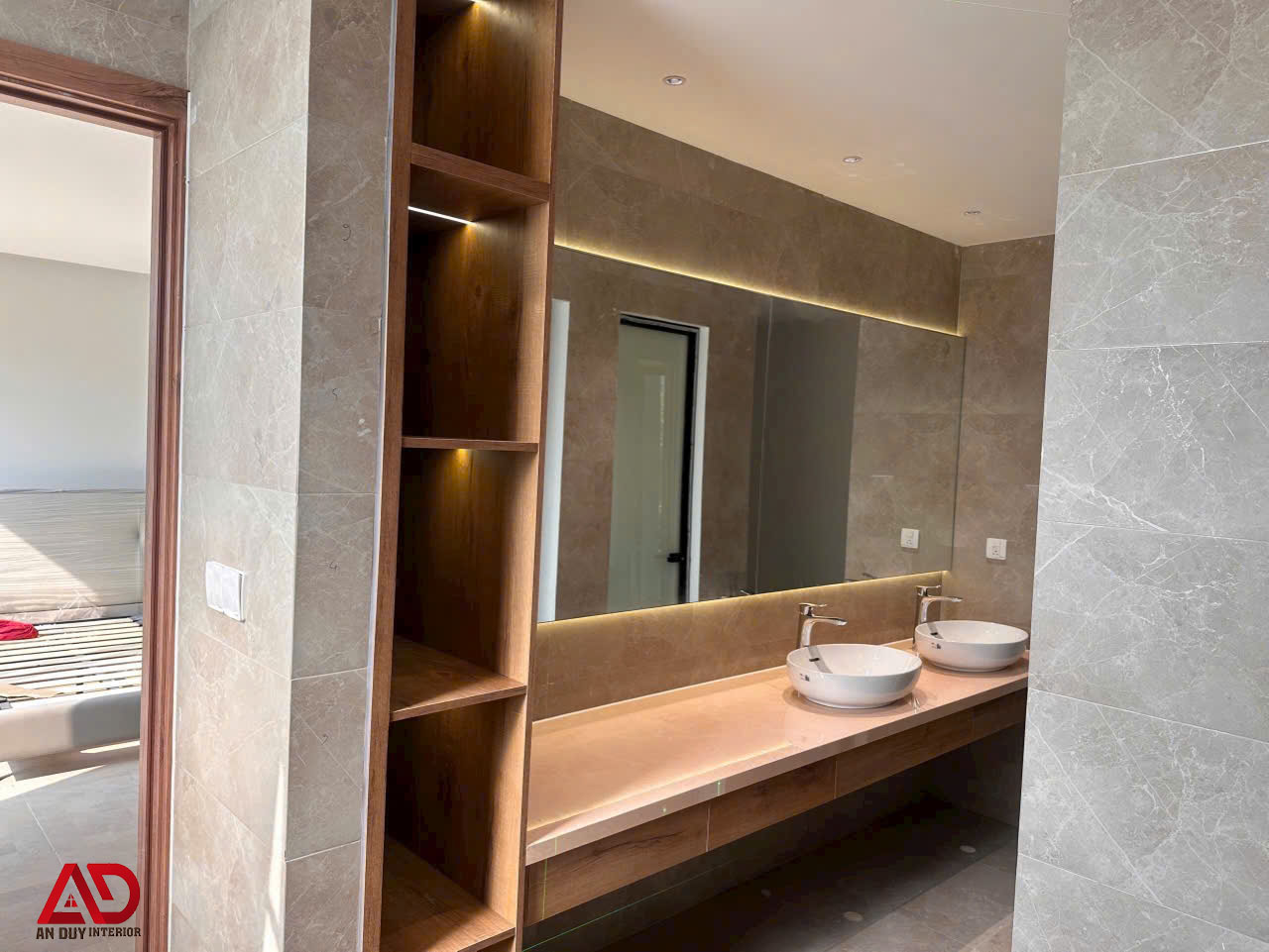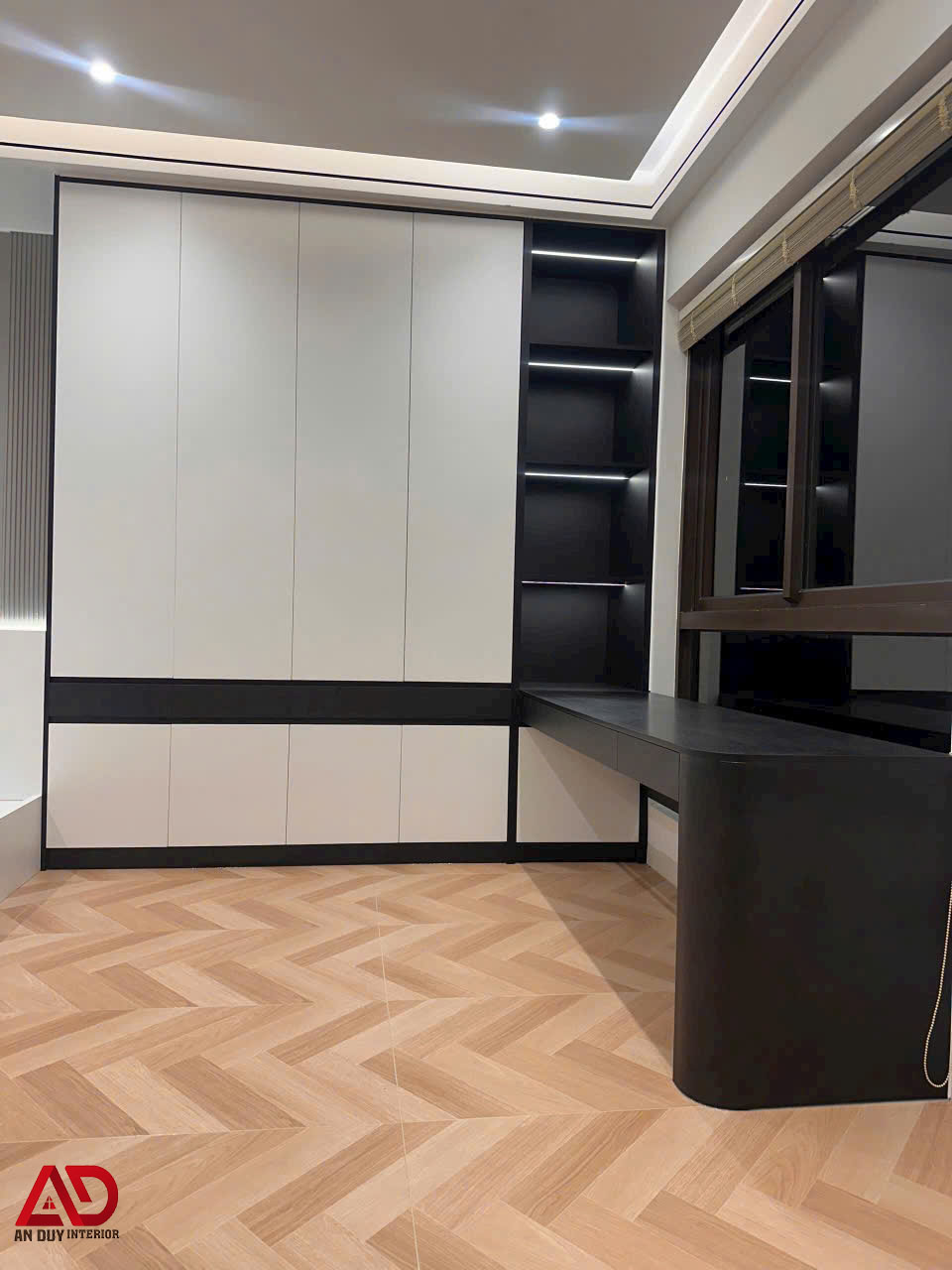 Điểm nổi bật của công trình nằm ở sự đồng bộ trong từng khu vực: từ tủ gầm cầu thang, tủ console trang trí, phòng ngủ hiện đại với giường bục và tủ áo lớn, khu bếp tích hợp bàn đảo, hệ tủ lưu trữ thông minh, cho đến không gian lavabo đá và gỗ. Mỗi chi tiết đều được An Duy Interior chăm chút kỹ lưỡng để vừa đảm bảo thẩm mỹ, vừa tối ưu công năng sử dụng cho gia chủ.