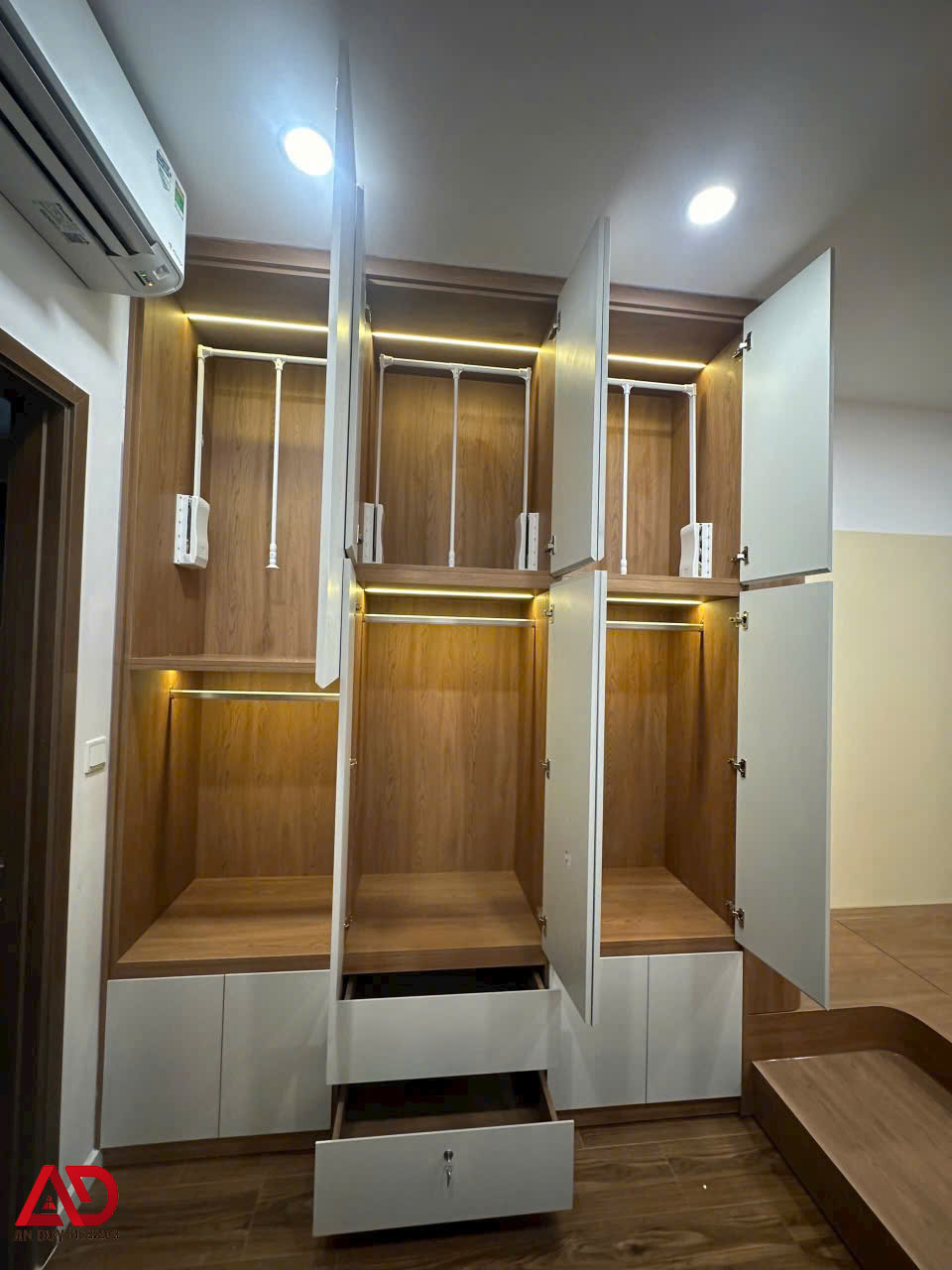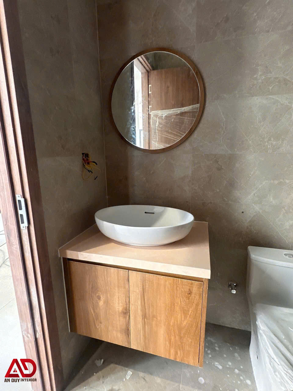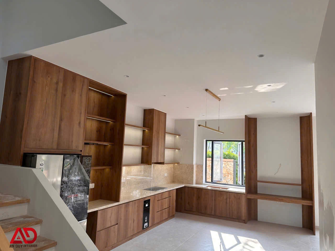 Điểm nổi bật của công trình nằm ở sự đồng bộ trong từng khu vực: từ tủ gầm cầu thang, tủ console trang trí, phòng ngủ hiện đại với giường bục và tủ áo lớn, khu bếp tích hợp bàn đảo, hệ tủ lưu trữ thông minh, cho đến không gian lavabo đá và gỗ. Mỗi chi tiết đều được An Duy Interior chăm chút kỹ lưỡng để vừa đảm bảo thẩm mỹ, vừa tối ưu công năng sử dụng cho gia chủ.