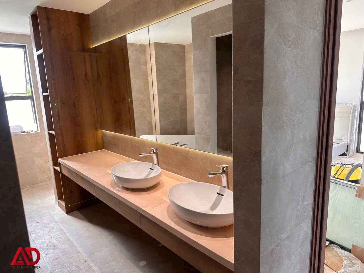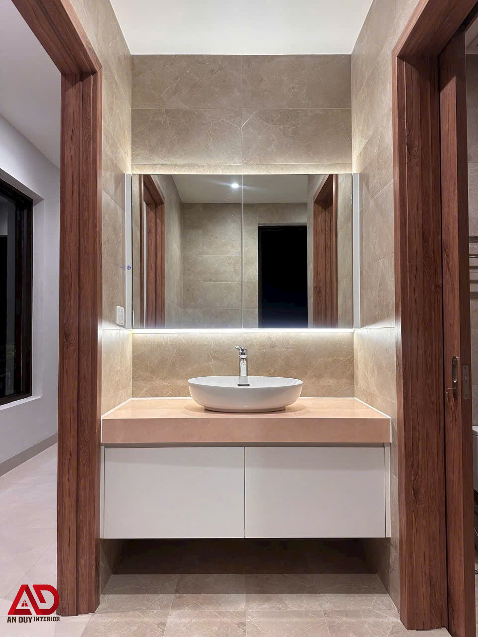 Không gian lavabo được hoàn thiện theo phong cách khách sạn cao cấp với mặt đá sáng, chậu rửa đặt bàn, gương lớn tích hợp đèn LED hắt sáng và hệ tủ dưới lavabo gọn gàng. Khu vực này sử dụng gạch tông nâu xám sang trọng kết hợp gỗ ấm, tạo cảm giác thư giãn, sạch sẽ và đẳng cấp.