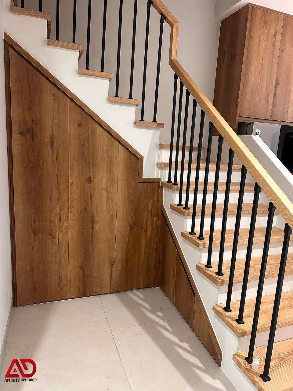 Ngay từ khu vực giao thông trong nhà, phần gầm cầu thang đã được xử lý khéo léo thành hệ tủ lưu trữ phẳng, vừa gọn gàng vừa tăng tính thẩm mỹ cho không gian. Mảng gỗ chạy theo độ dốc cầu thang tạo cảm giác liền mạch, chắc chắn và giúp khu vực này không bị bỏ trống lãng phí.