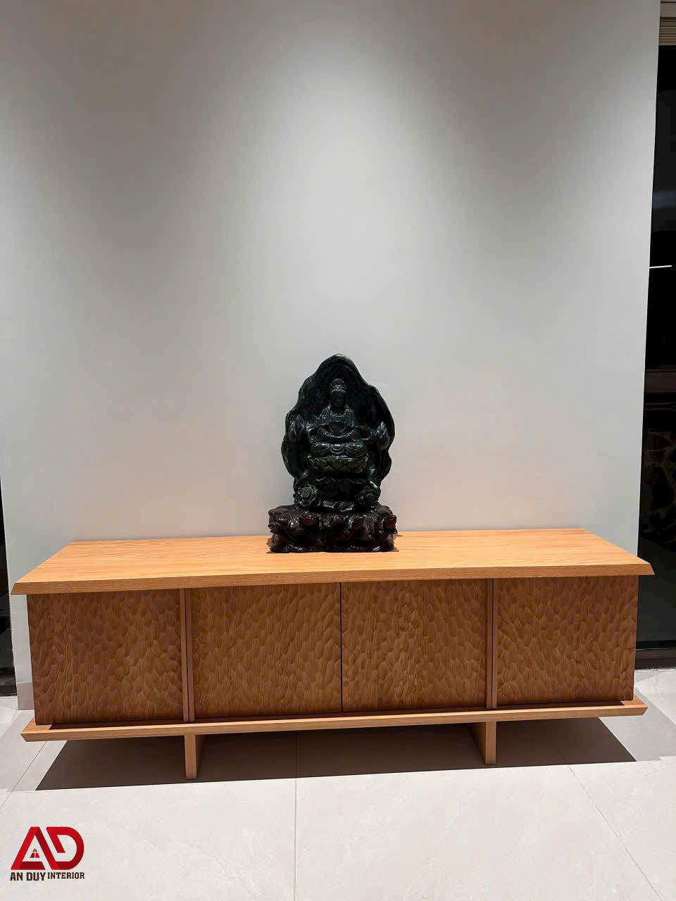 Công trình sử dụng thêm tủ console gỗ kiểu dáng tối giản nhưng nổi bật ở bề mặt cánh tủ có chiều sâu thẩm mỹ. Đây là chi tiết giúp khu vực tiếp đón hoặc sinh hoạt chung thêm phần tinh tế. Khi kết hợp cùng vật phẩm trang trí, bình hoa hoặc tượng decor, không gian trở nên có điểm nhấn rõ ràng mà không cần quá nhiều chi tiết rườm rà.