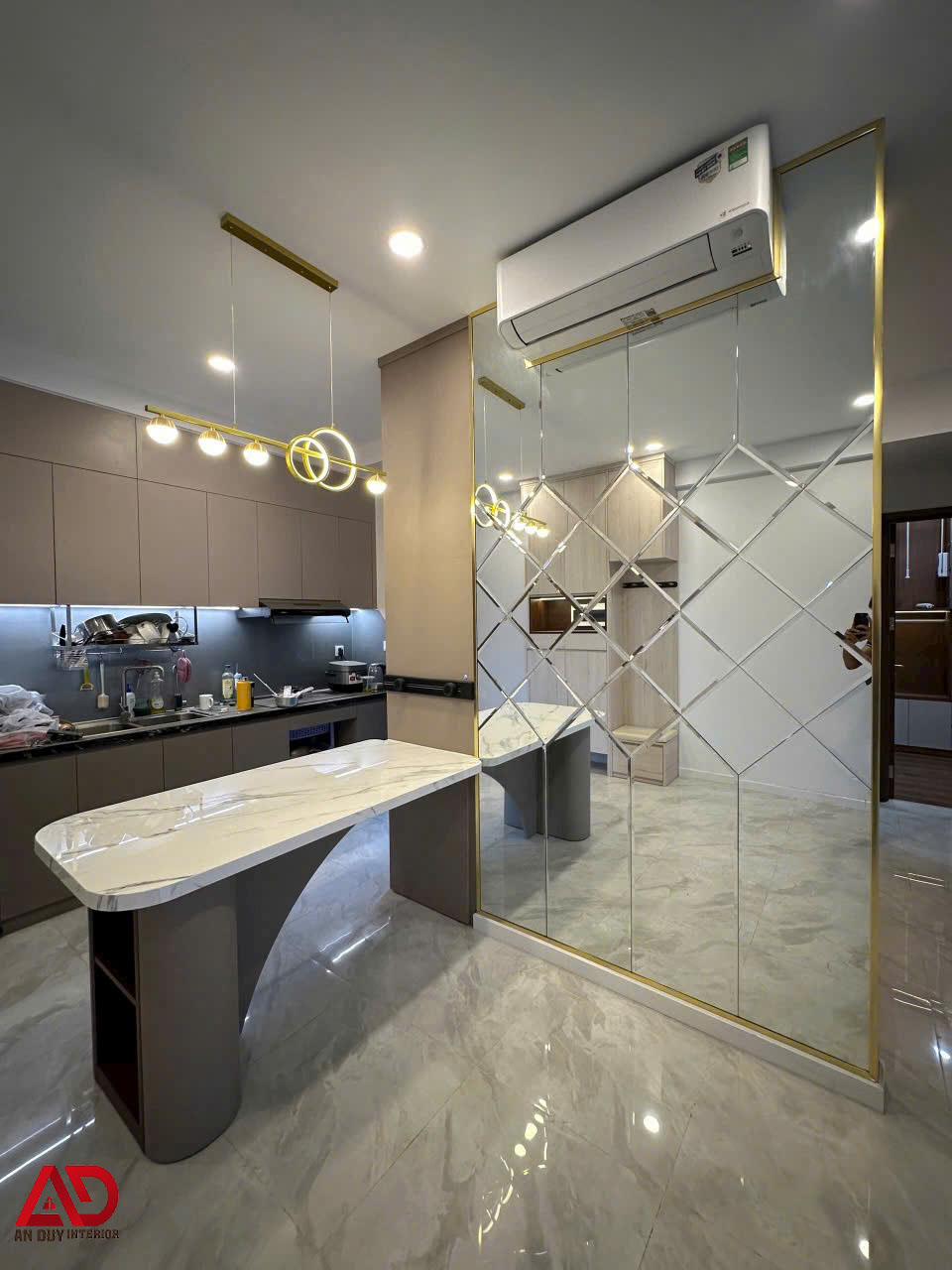 Thiết kế bàn đảo không chỉ đóng vai trò hỗ trợ sơ chế, dùng bữa nhanh mà còn trở thành điểm nhấn thẩm mỹ cho toàn bộ không gian bếp. Ngoài ra, mảng gương trang trí ghép ô với khung ánh kim giúp tăng chiều sâu thị giác, tạo hiệu ứng rộng và sang hơn cho không gian.