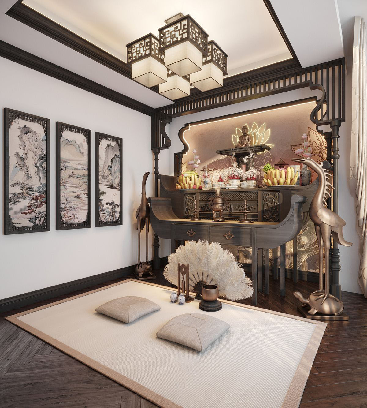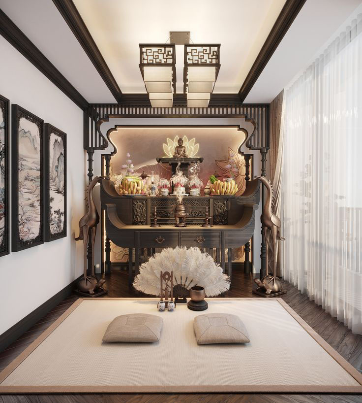 Một yếu tố giúp các mẫu phòng thờ này trở nên đặc biệt chính là việc đưa tinh thần Á Đông vào không gian một cách tinh tế. Từ họa tiết vách, tranh treo tường, đèn trần, biểu tượng hoa sen đến các linh vật trang trí như hạc, tất cả đều góp phần tạo nên nét đẹp trang nhã, sâu lắng và đầy tính biểu cảm.