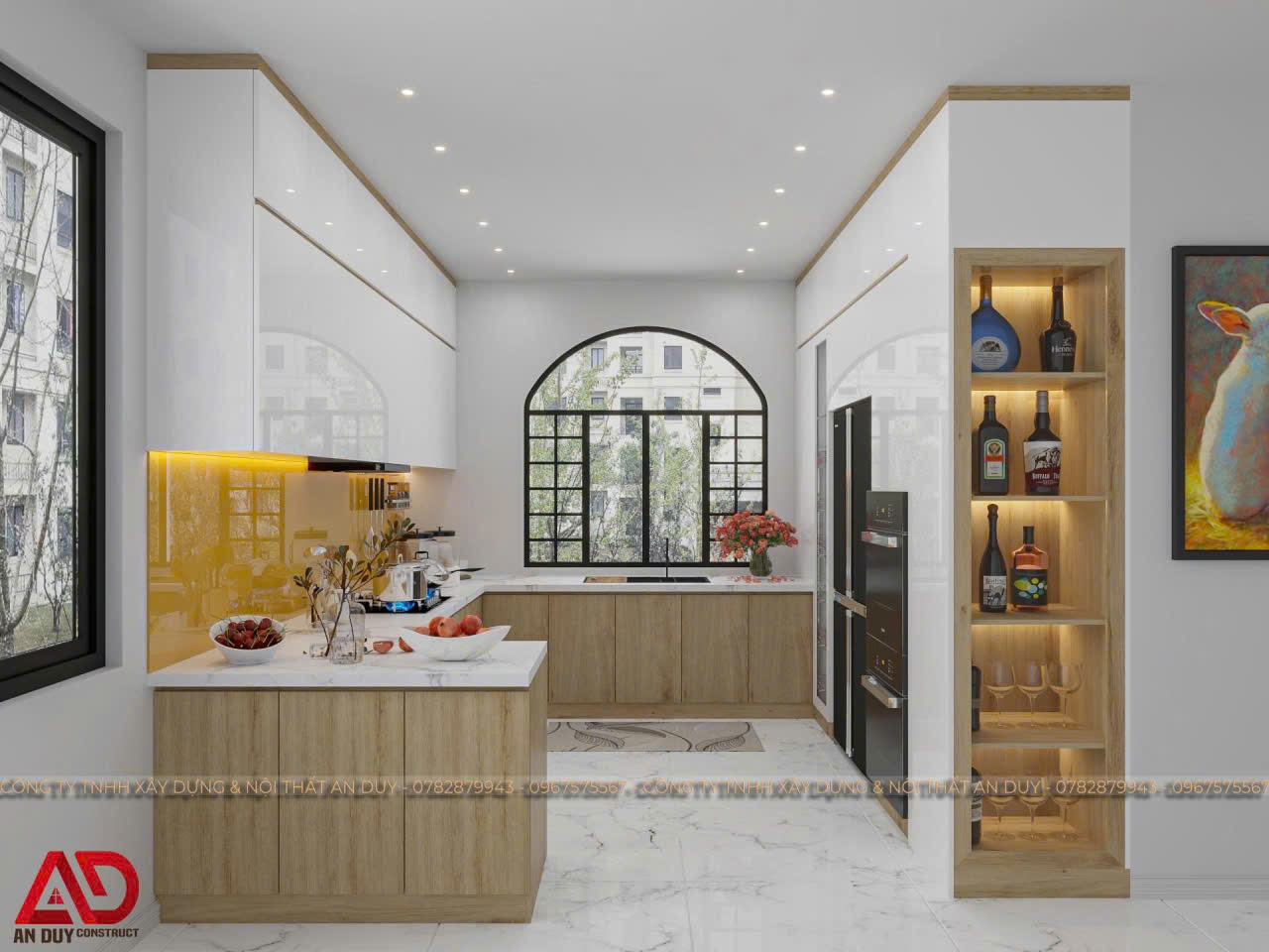 Ánh sáng là yếu tố không thể thiếu trong một không gian bếp đẹp. Các mẫu thiết kế của Nội thất An Duy đều chú trọng kết hợp giữa ánh sáng tổng thể và ánh sáng điểm nhấn. Hệ đèn trần âm, đèn hắt dưới tủ bếp, đèn trang trí tủ rượu hay đèn thả tại đảo bếp vừa tăng hiệu quả chiếu sáng, vừa nâng cao giá trị thẩm mỹ cho toàn bộ không gian.