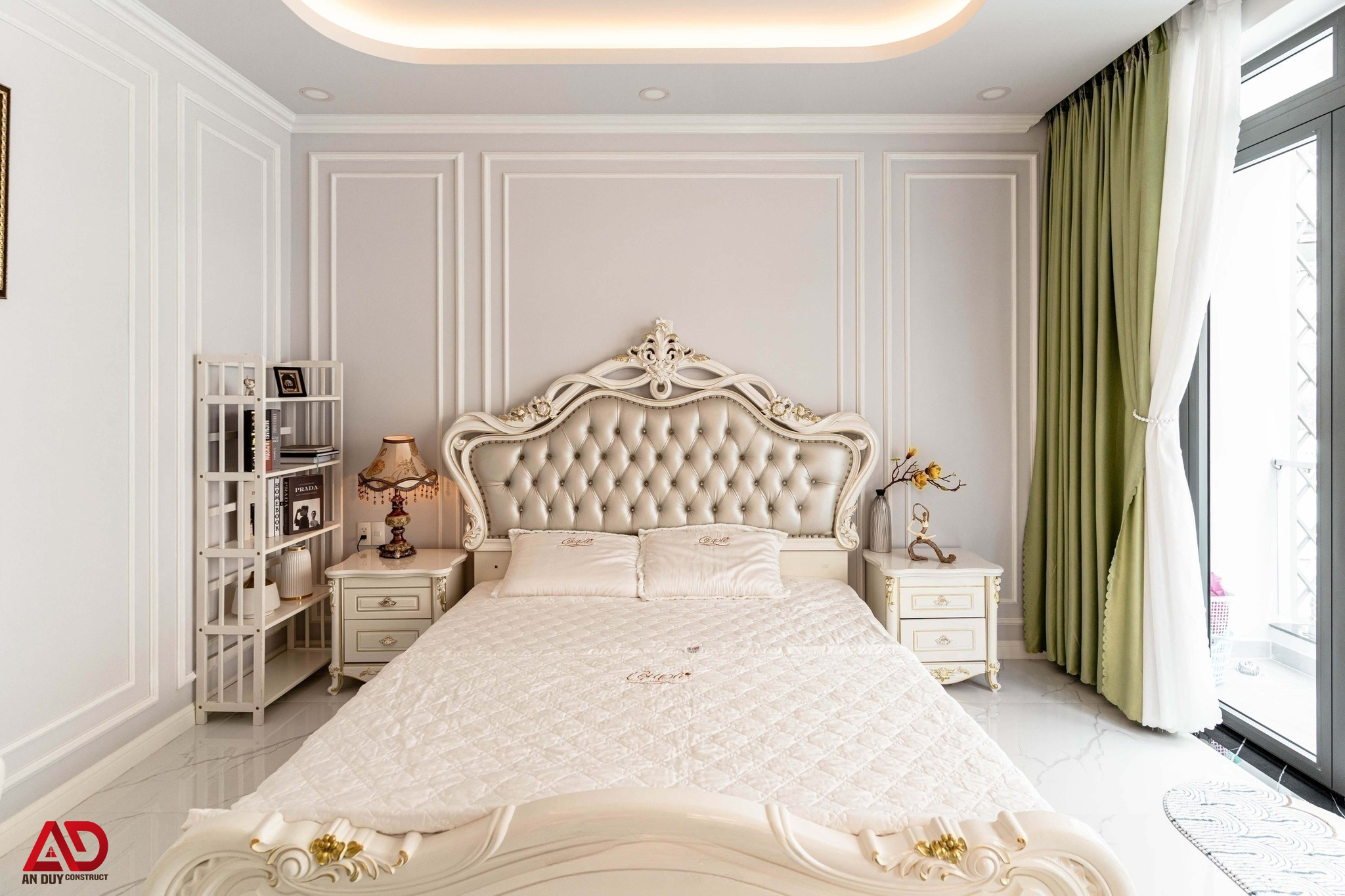 Không gian phòng ngủ master được hoàn thiện theo tinh thần sang trọng, thanh lịch với nội thất tông sáng chủ đạo. Giường ngủ kiểu tân cổ điển nhẹ nhàng kết hợp hệ rèm, ánh sáng hắt trần và các chi tiết trang trí mềm mại giúp căn phòng mang cảm giác thư giãn, dễ chịu.