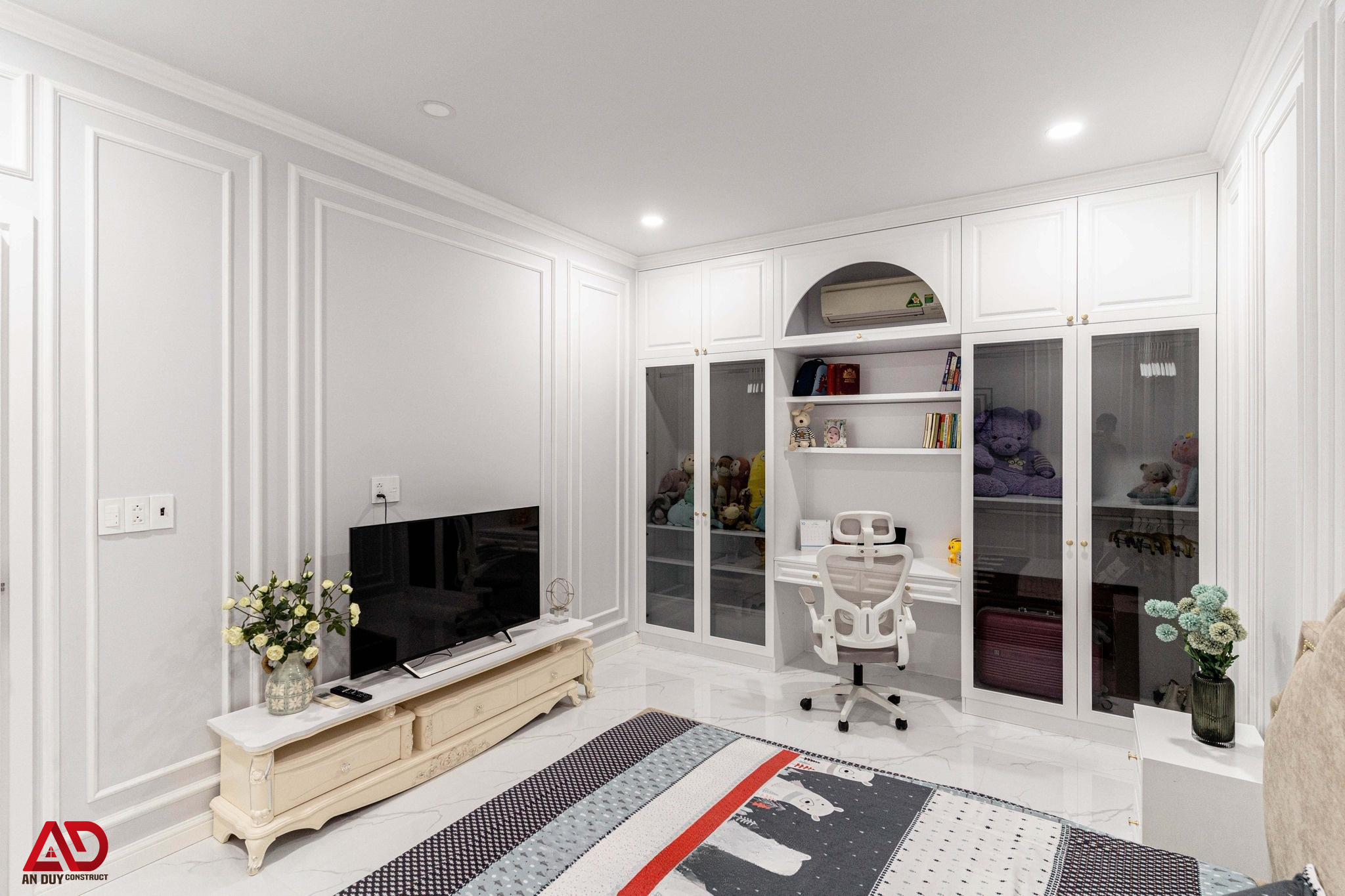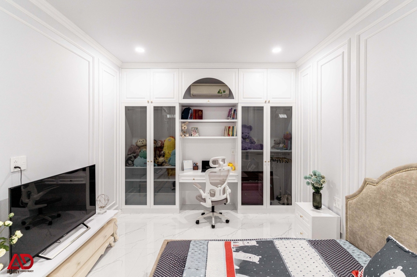Giải pháp thi công hệ tủ âm tường, kệ trưng bày và bàn học liền khối không chỉ nâng cao thẩm mỹ mà còn giúp căn phòng luôn gọn gàng, phù hợp cho trẻ nhỏ hoặc phòng ngủ phụ trong biệt thự.