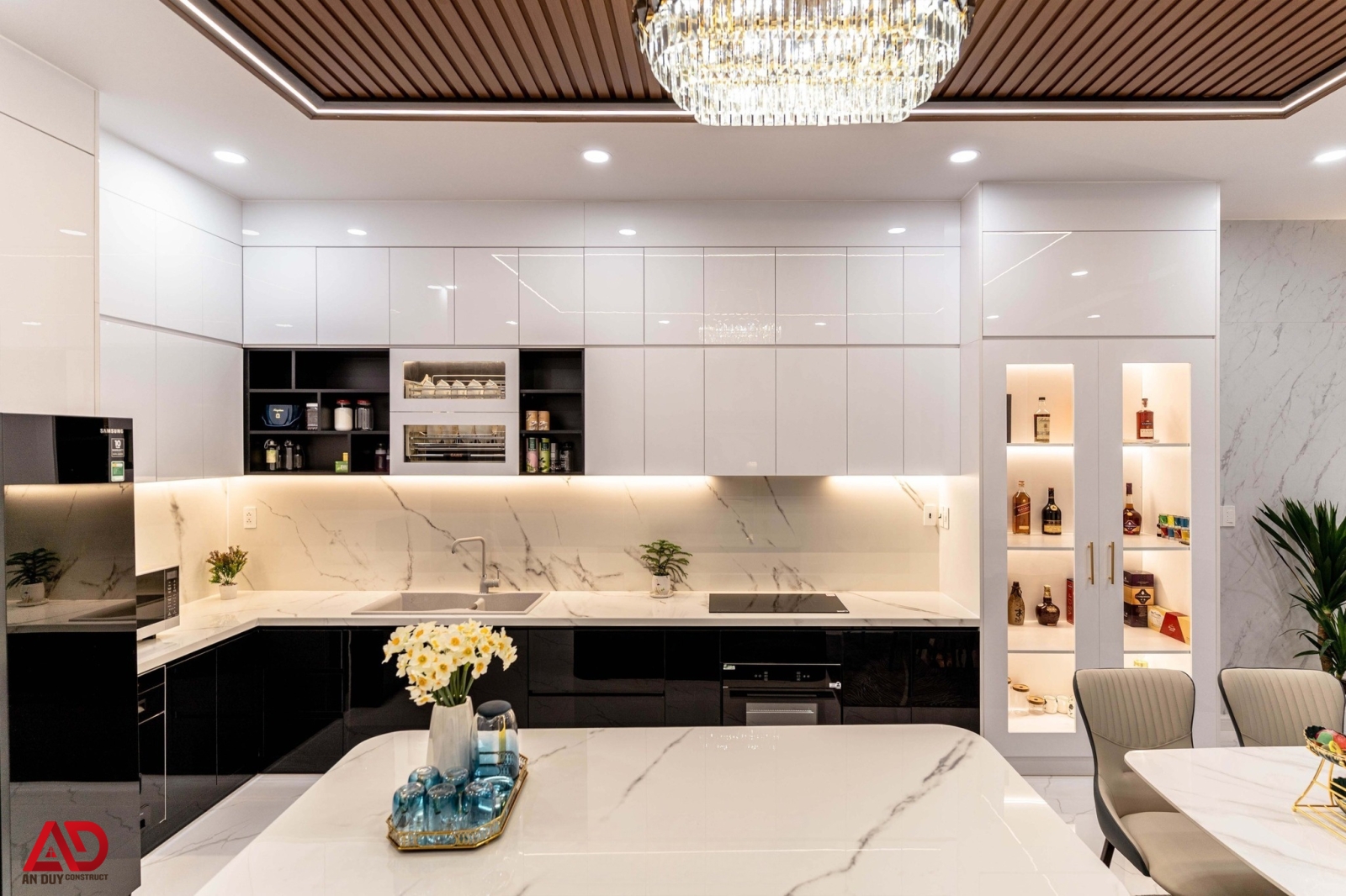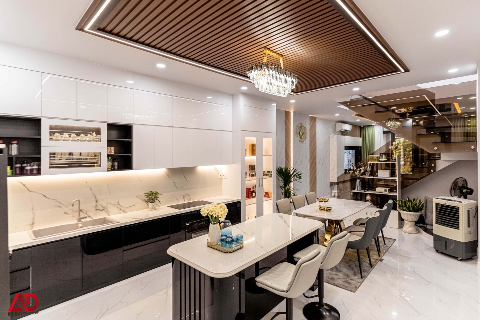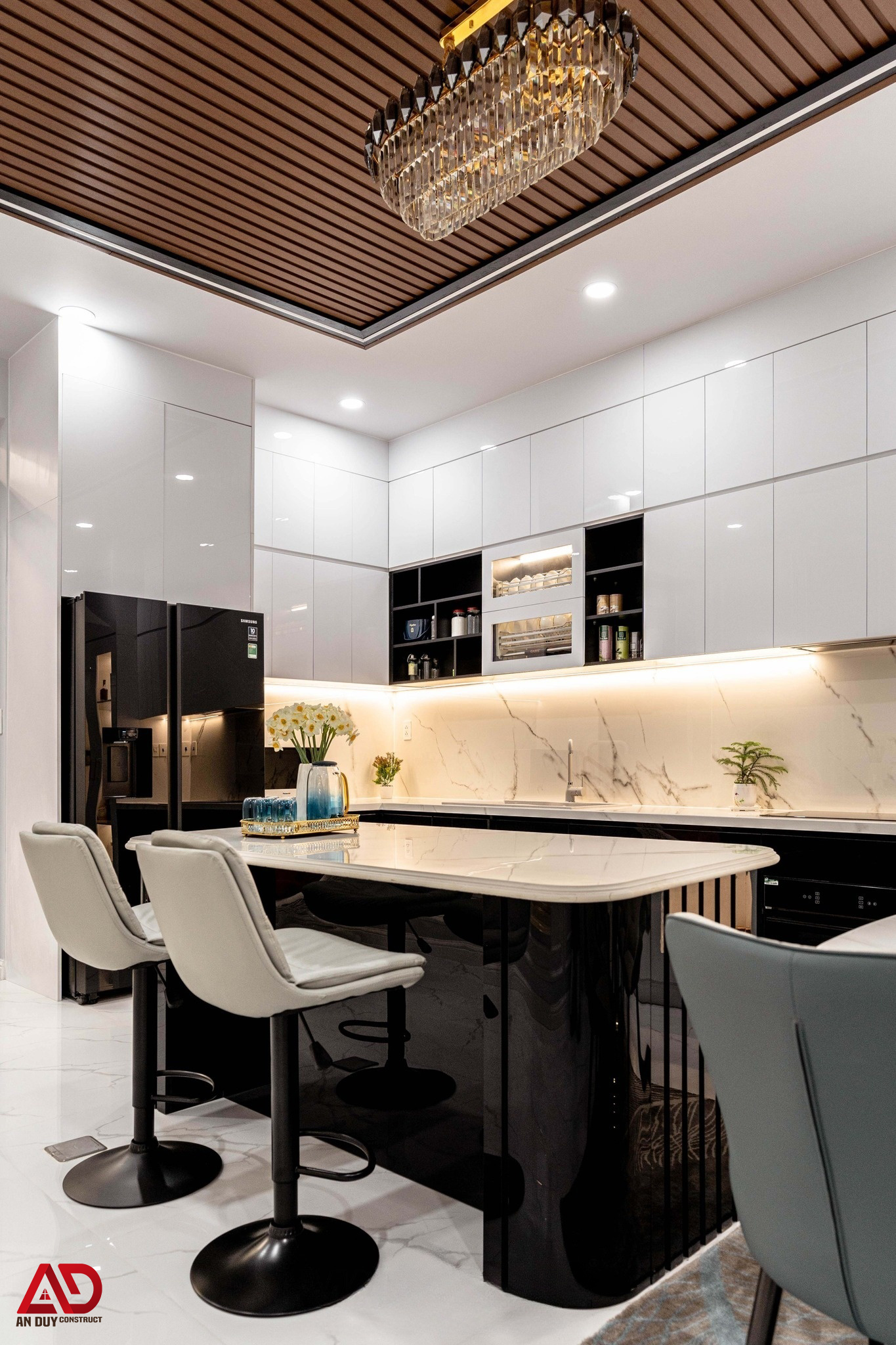 Khu bếp sử dụng hệ tủ cao kịch trần với bề mặt bóng hiện đại, kết hợp sắc trắng – đen tương phản giúp không gian vừa sạch sẽ vừa sang trọng. Đảo bếp và bàn ăn được bố trí khoa học, tạo thêm khu vực chuẩn bị, thưởng thức bữa ăn và gắn kết các thành viên trong gia đình.