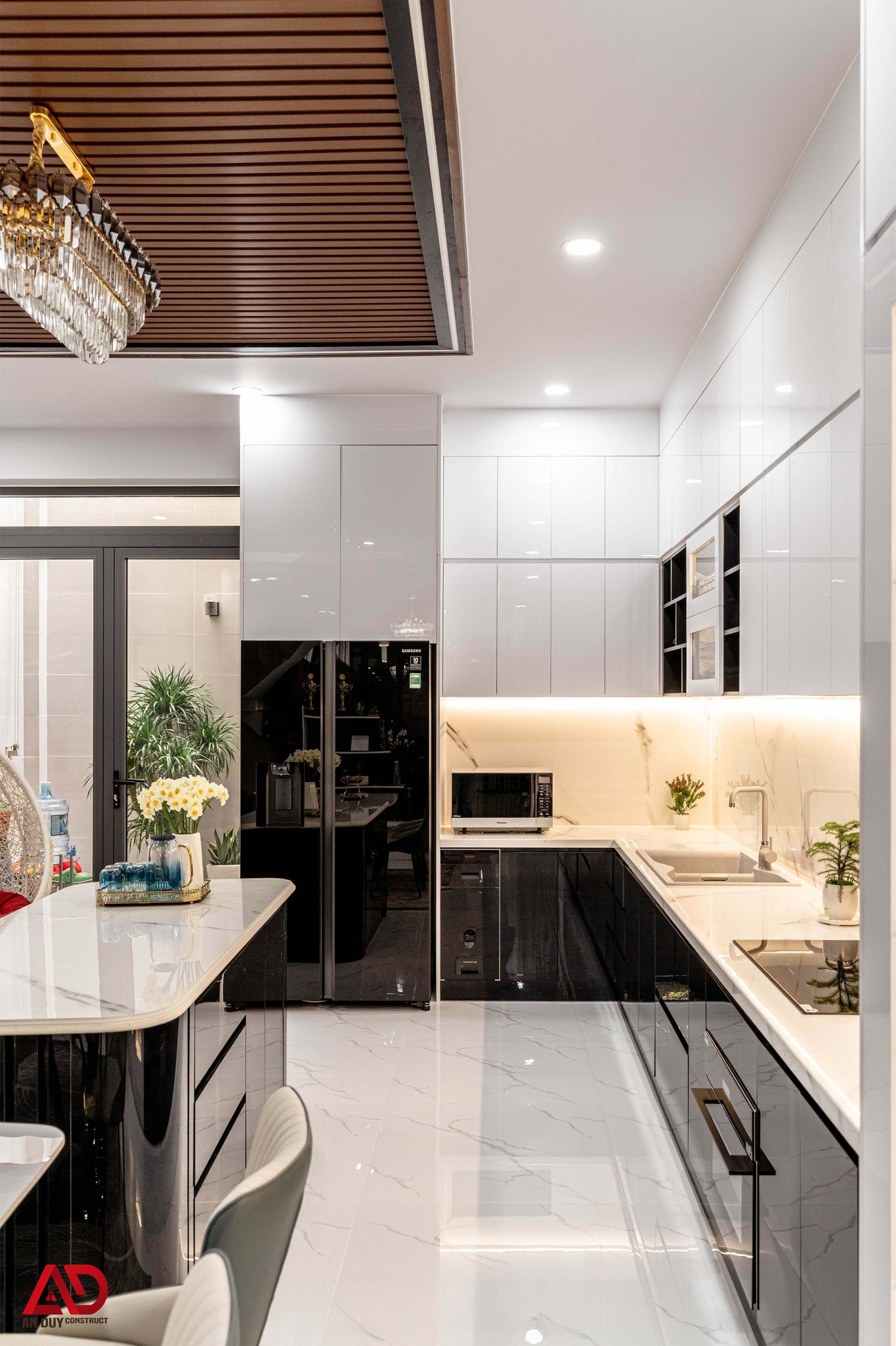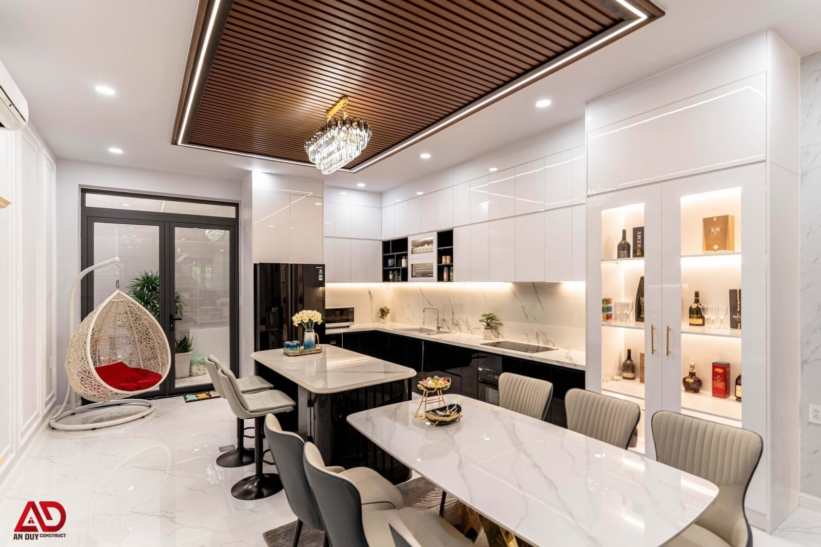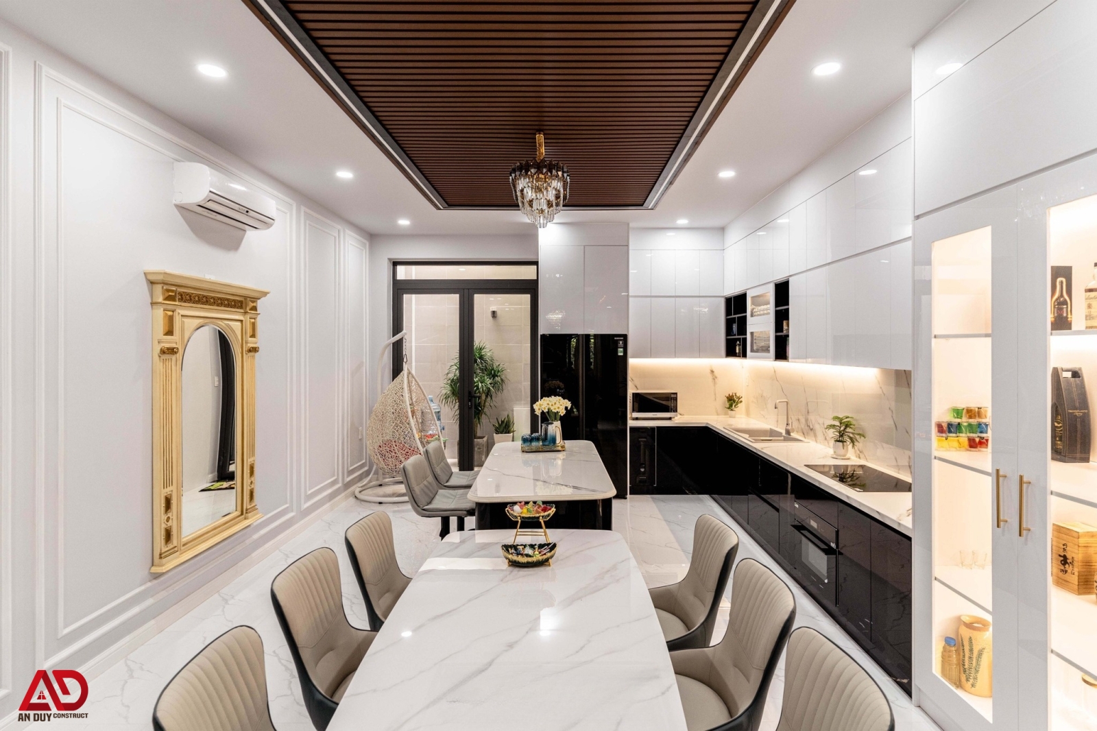 Khu bếp sử dụng hệ tủ cao kịch trần với bề mặt bóng hiện đại, kết hợp sắc trắng – đen tương phản giúp không gian vừa sạch sẽ vừa sang trọng. Đảo bếp và bàn ăn được bố trí khoa học, tạo thêm khu vực chuẩn bị, thưởng thức bữa ăn và gắn kết các thành viên trong gia đình.