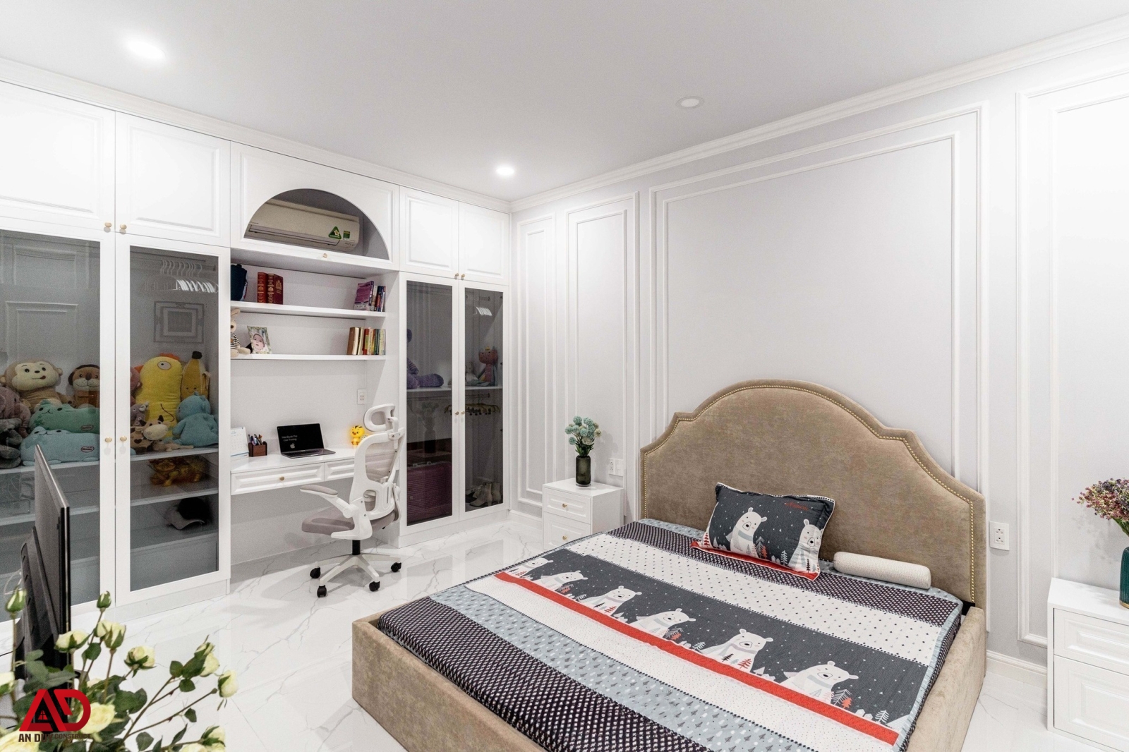 Không gian phòng ngủ phụ được bố trí hệ tủ kết hợp bàn học thông minh, giúp tối ưu diện tích và đáp ứng nhu cầu sử dụng thực tế. Tông màu sáng tiếp tục được duy trì để giữ sự đồng bộ với toàn bộ ngôi nhà, đồng thời tạo cảm giác sạch sẽ, rộng rãi và hiện đại.