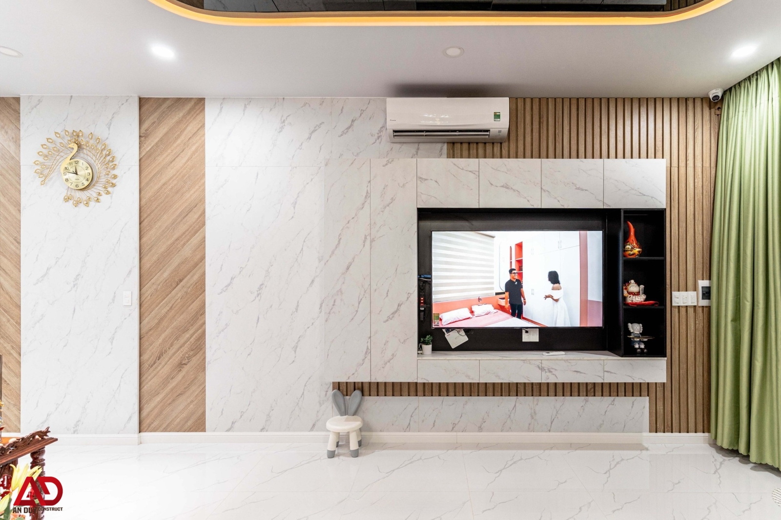 Công trình lần này mang phong cách hiện đại sang trọng, nổi bật với gam màu sáng chủ đạo, kết hợp chất liệu đá vân mây, gỗ, kính và hệ tủ thiết kế âm tường tinh gọn. Không gian được xử lý theo hướng mở, tạo cảm giác rộng rãi, thông thoáng nhưng vẫn giữ được vẻ ấm cúng và đẳng cấp cho tổng thể biệt thự.