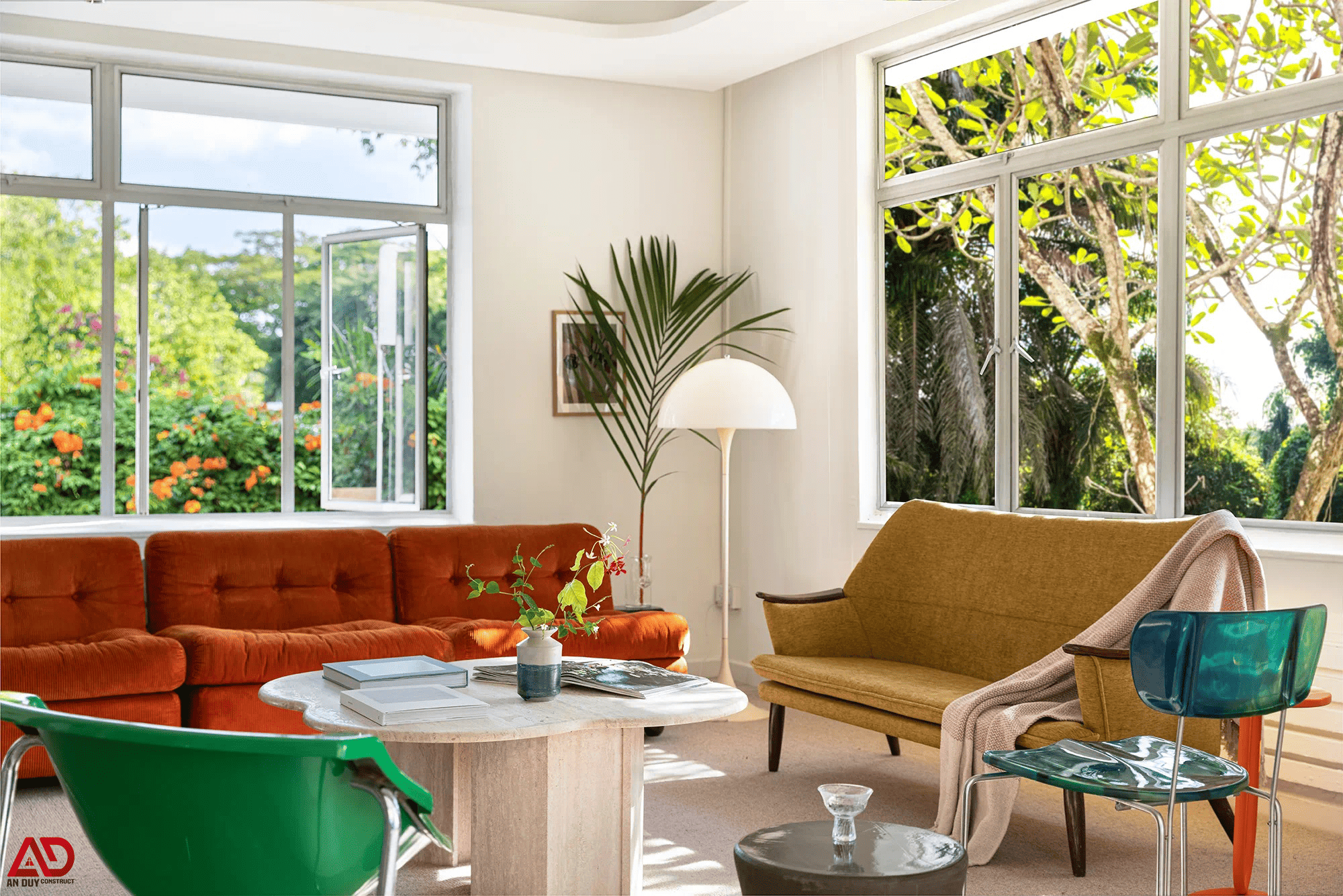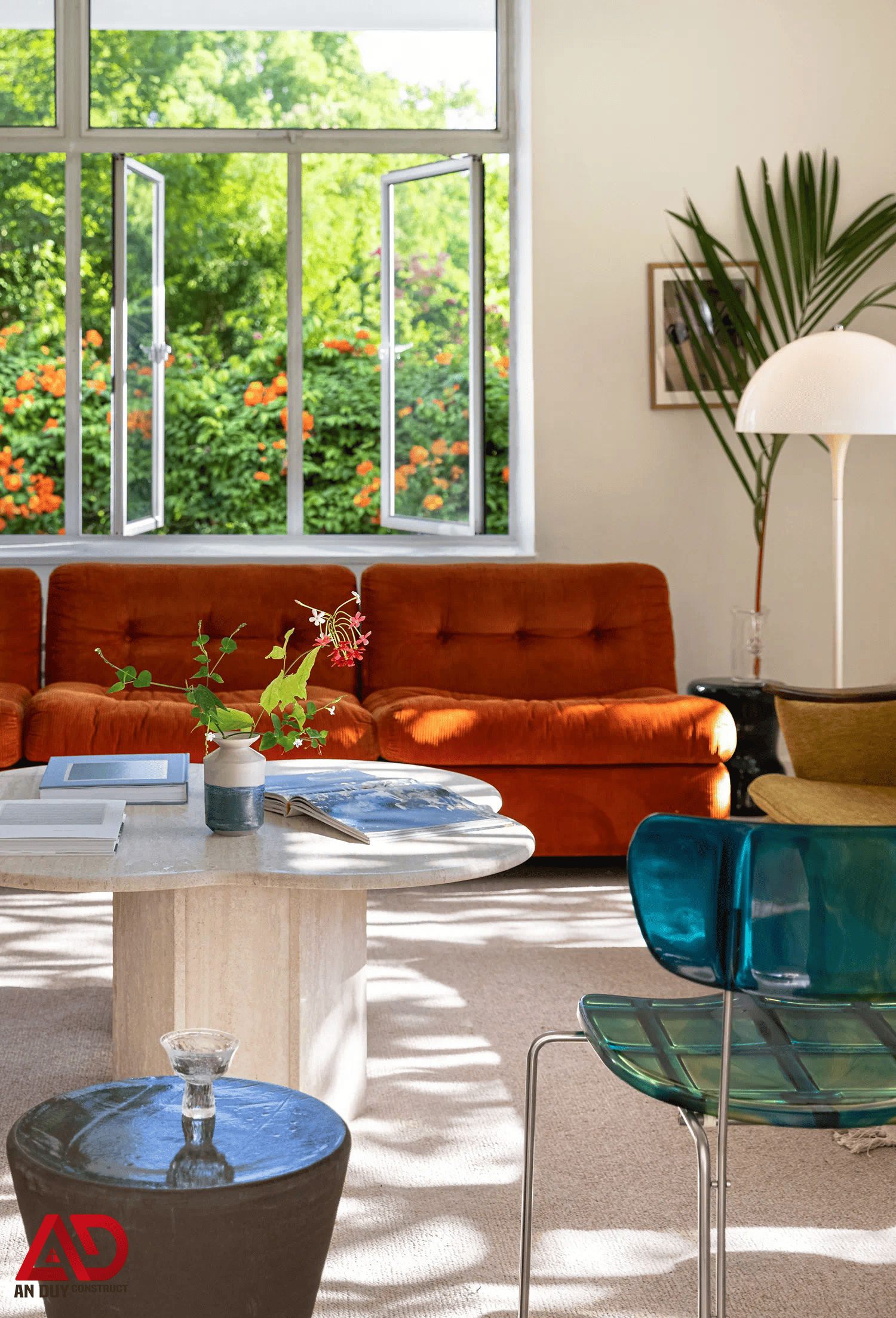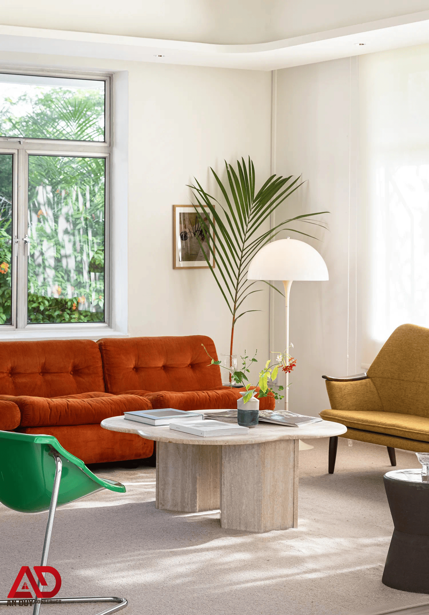 Phòng khách sử dụng sofa tông cam đất làm điểm nhấn chính, kết hợp cùng ghế đơn kiểu dáng độc bản, bàn trà đá sáng màu và các chi tiết decor tối giản. Sự phối hợp giữa hình khối, vật liệu và màu sắc tạo nên một không gian tiếp khách tinh tế, hiện đại nhưng vẫn rất thân thiện.