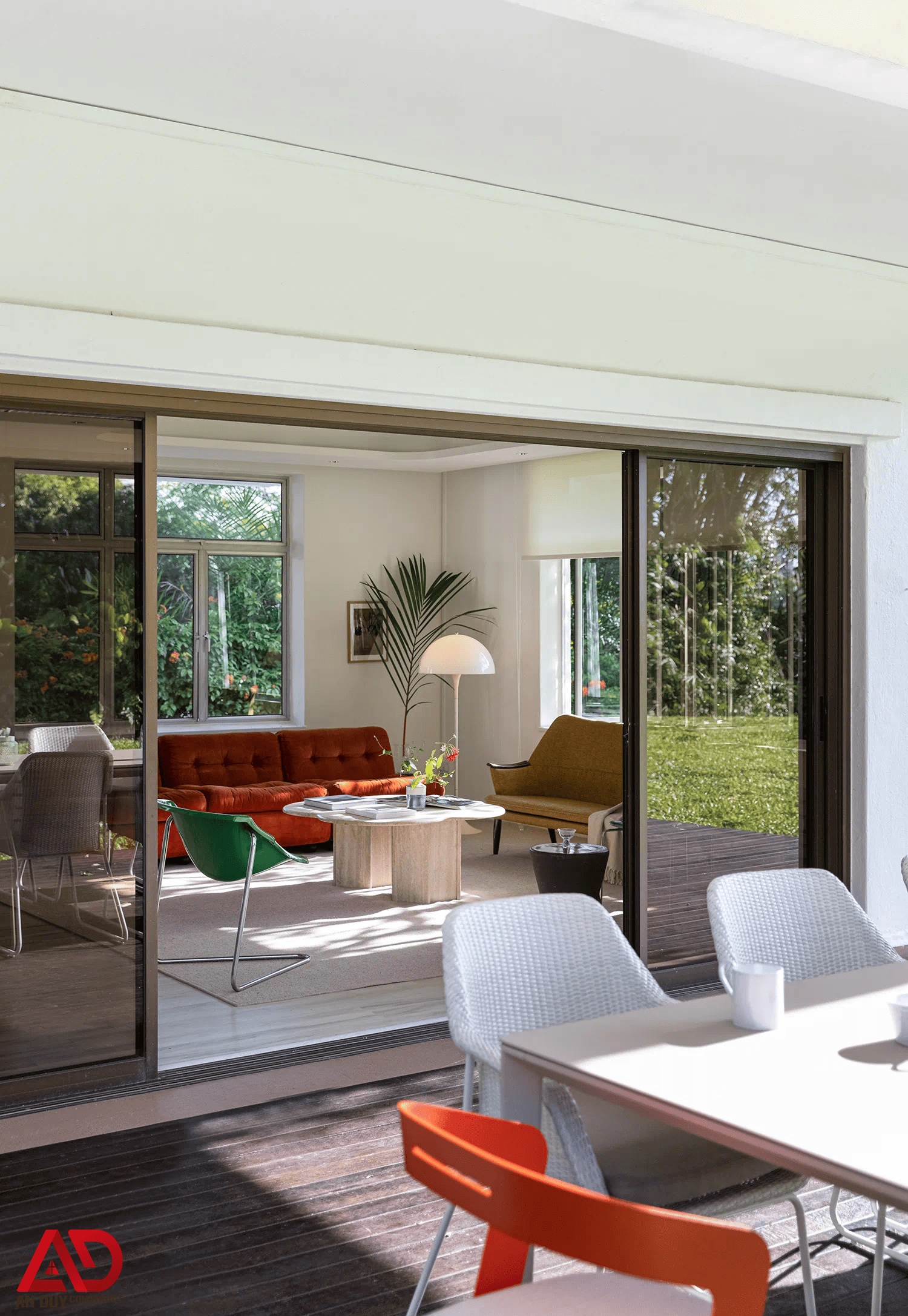 Hệ cửa sổ lớn và cửa trượt kính giúp kết nối trực tiếp giữa không gian trong nhà với sân vườn, hiên ngoài trời và khu vực thư giãn. Cách tổ chức này không chỉ làm tăng giá trị thẩm mỹ mà còn tạo cảm giác sống gần gũi thiên nhiên, thoải mái và dễ chịu hơn mỗi ngày.