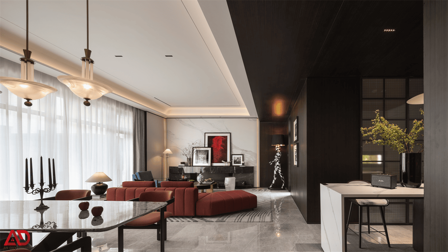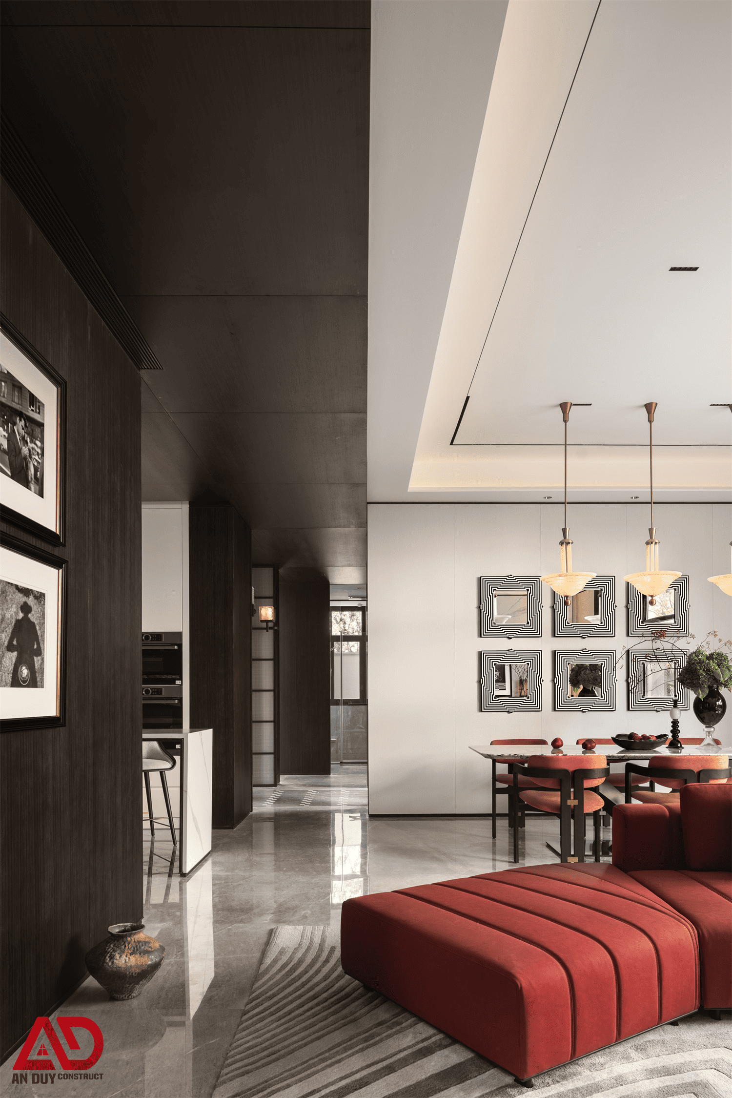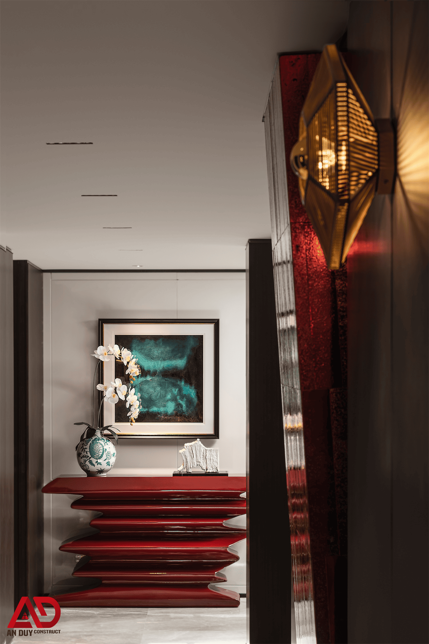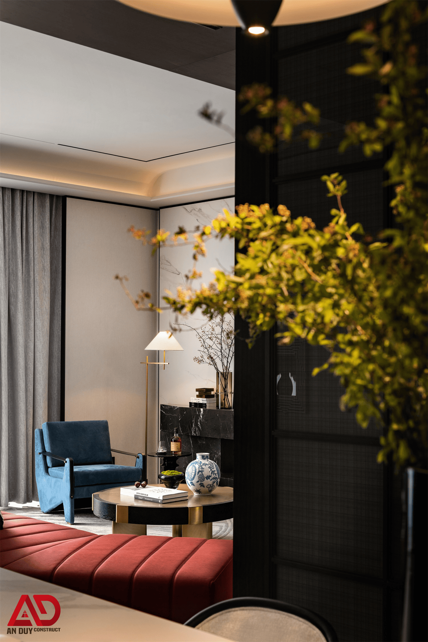 Dự án do An Duy thực hiện là một ví dụ nổi bật cho tinh thần đó. Toàn bộ không gian được xây dựng trên nền màu trung tính kết hợp gỗ tối, đá sáng, ánh kim và các mảng màu nhấn như đỏ rượu, xanh dương, cam đất. Cách phối hợp này giúp công trình vừa sang trọng, vừa có chất riêng, vừa tạo nên trải nghiệm thị giác rất cuốn hút.