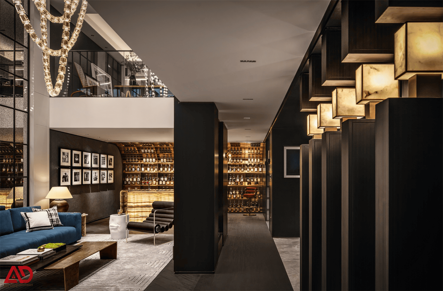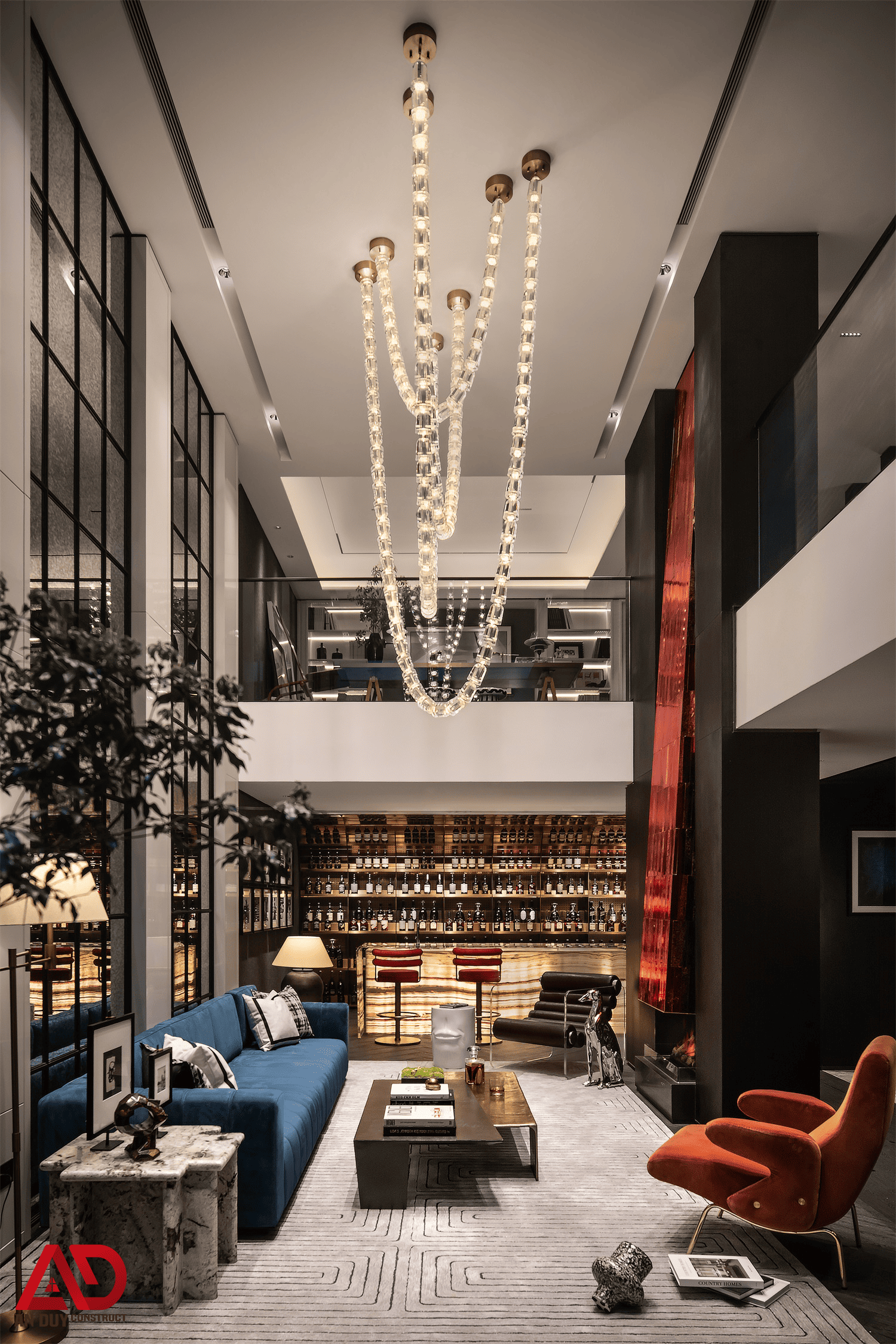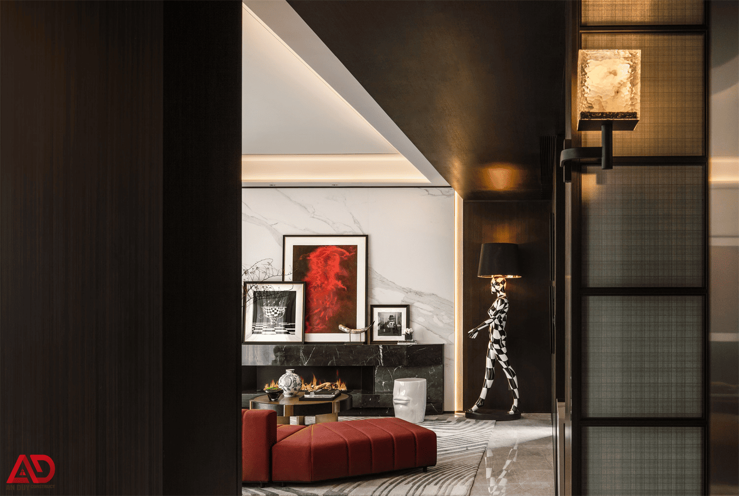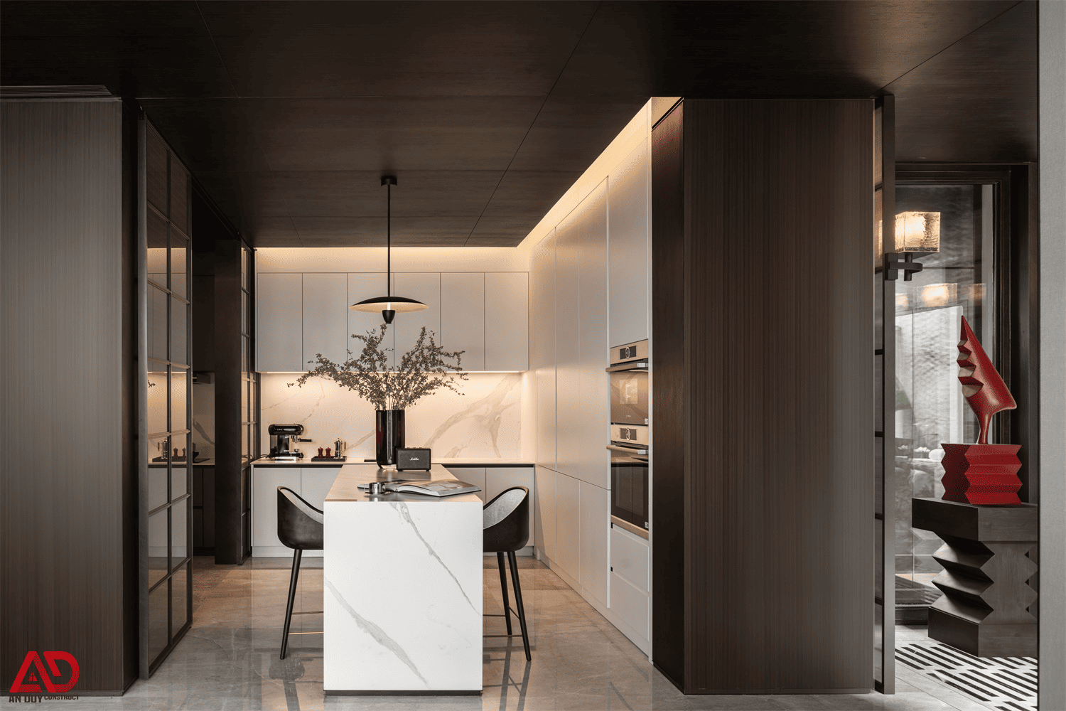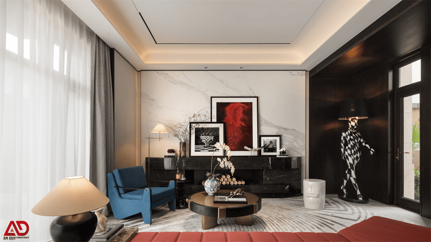 Dự án do An Duy thực hiện là một ví dụ nổi bật cho tinh thần đó. Toàn bộ không gian được xây dựng trên nền màu trung tính kết hợp gỗ tối, đá sáng, ánh kim và các mảng màu nhấn như đỏ rượu, xanh dương, cam đất. Cách phối hợp này giúp công trình vừa sang trọng, vừa có chất riêng, vừa tạo nên trải nghiệm thị giác rất cuốn hút.