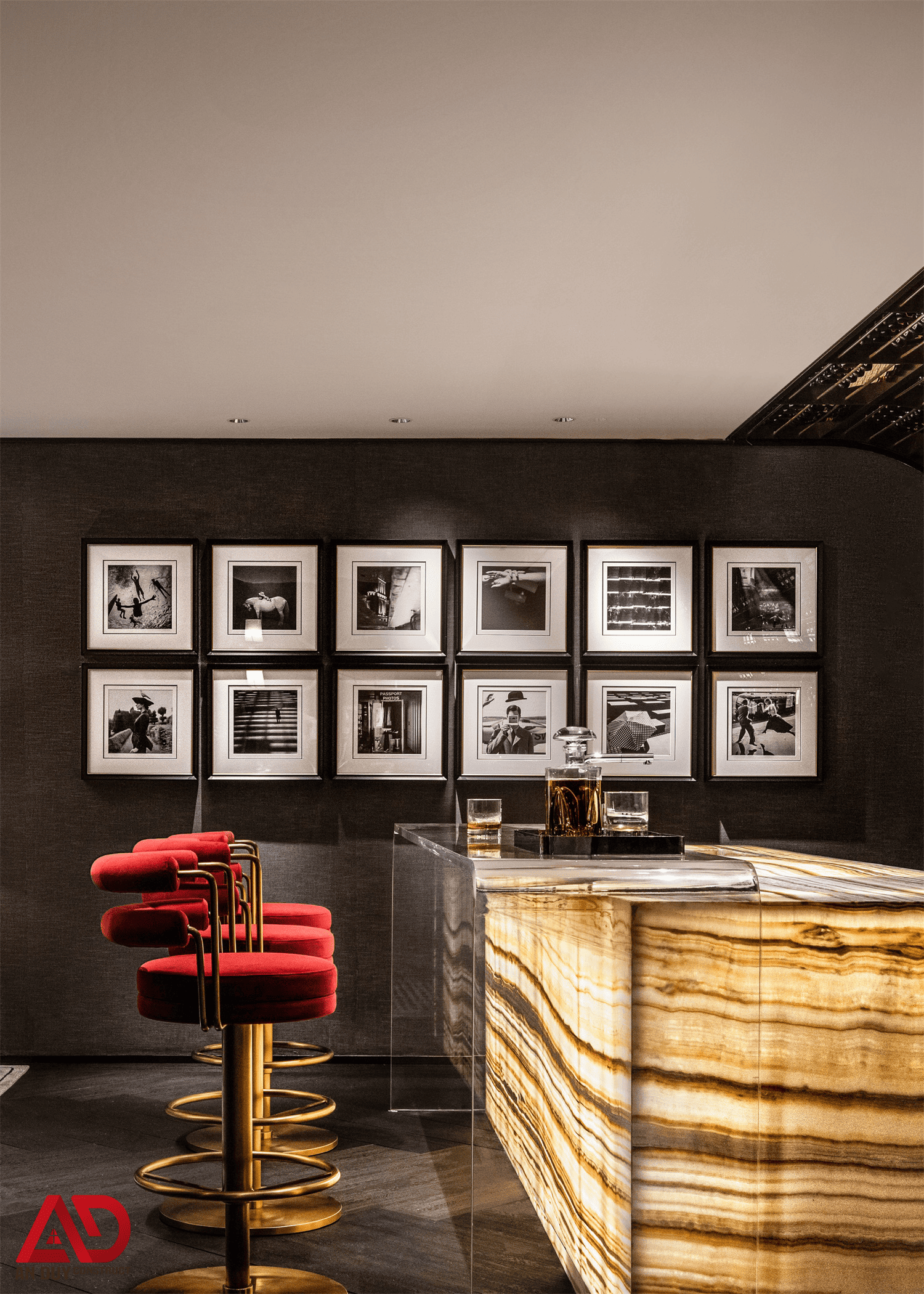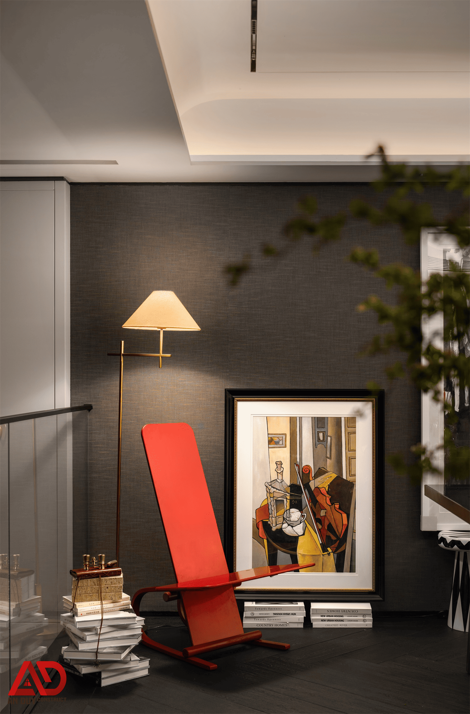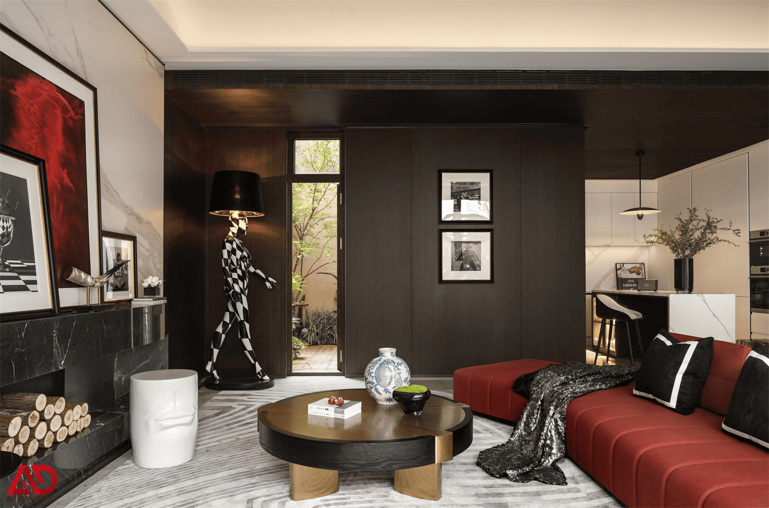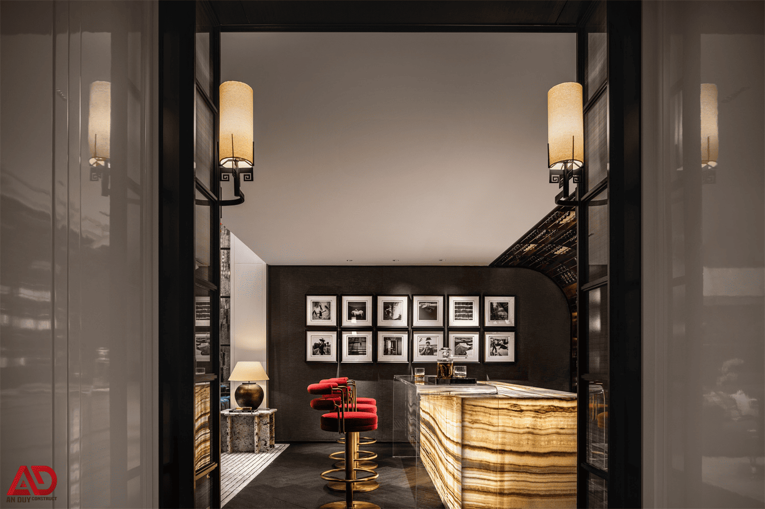 Dự án do An Duy thực hiện là một ví dụ nổi bật cho tinh thần đó. Toàn bộ không gian được xây dựng trên nền màu trung tính kết hợp gỗ tối, đá sáng, ánh kim và các mảng màu nhấn như đỏ rượu, xanh dương, cam đất. Cách phối hợp này giúp công trình vừa sang trọng, vừa có chất riêng, vừa tạo nên trải nghiệm thị giác rất cuốn hút.