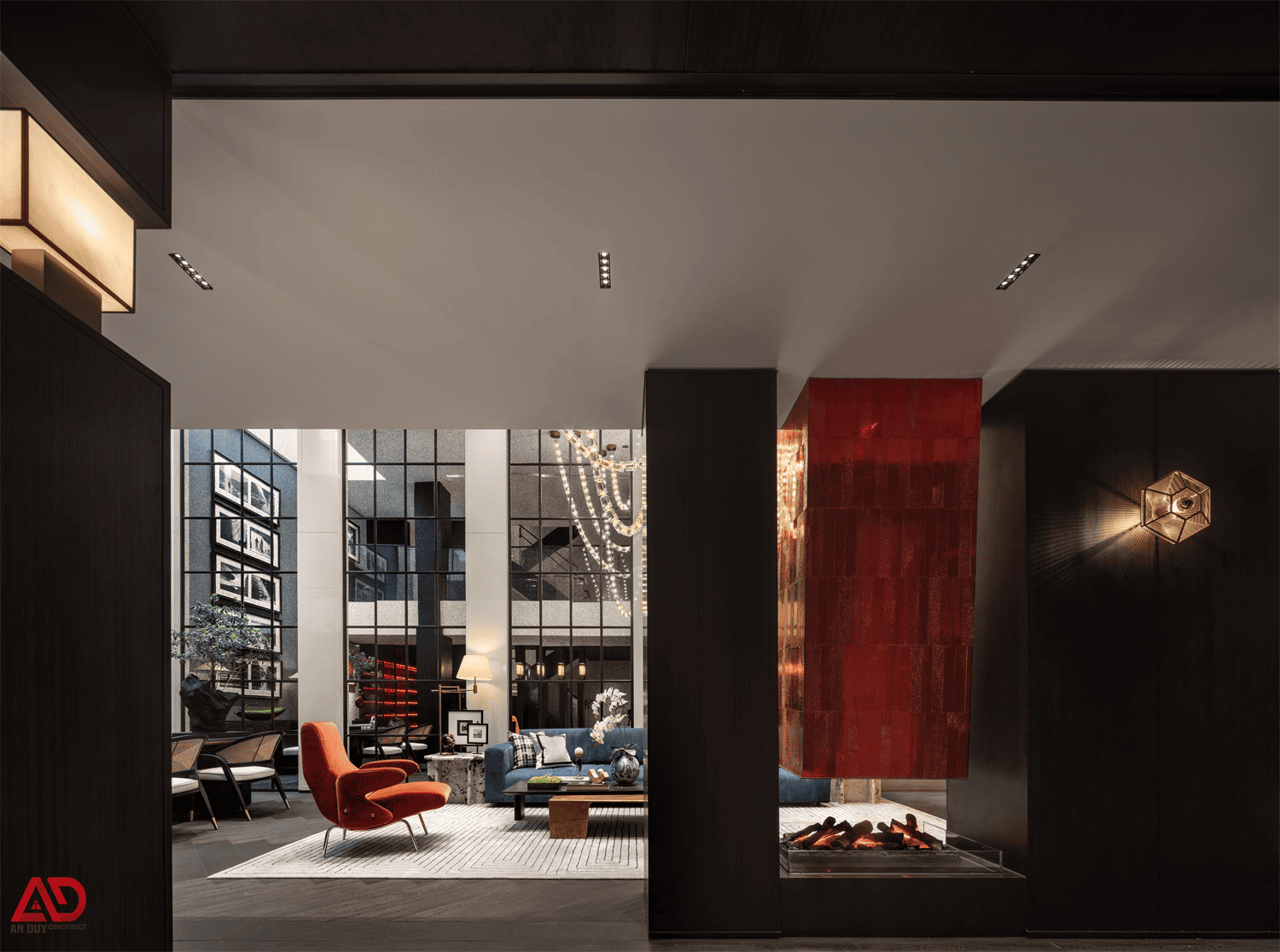 Một chi tiết đặc biệt trong hạng mục thi công phòng khách biệt thự là khu vực lò sưởi trung tâm với mảng nhấn đỏ nổi bật. Khi kết hợp cùng ánh sáng vàng ấm và nền vật liệu tối, không gian có được chiều sâu rất riêng, khác biệt hoàn toàn so với các mẫu biệt thự thông thường. Đây là kiểu xử lý đòi hỏi đơn vị thi công phải có kinh nghiệm về tỷ lệ, vật liệu và cảm quan thẩm mỹ rất tốt.