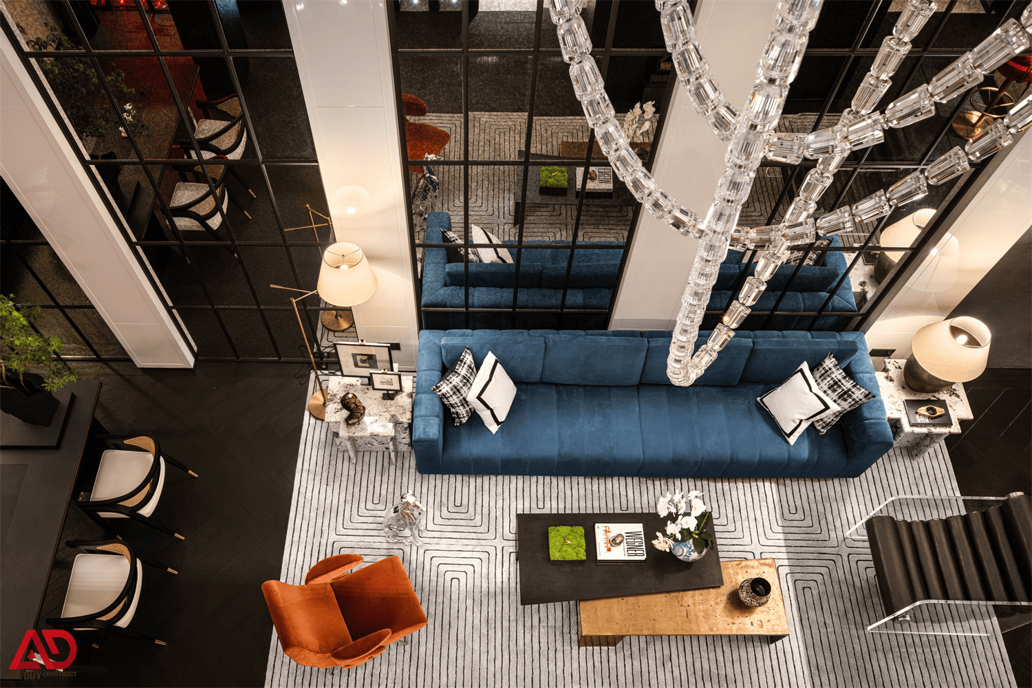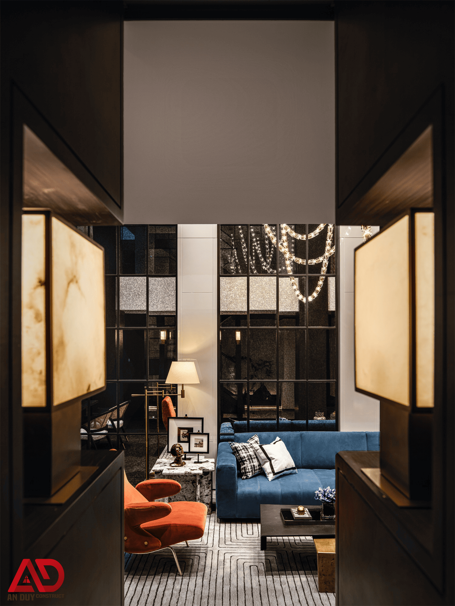 Khu vực phòng khách là điểm nhấn lớn nhất của công trình. Trần cao, hệ cửa kính lớn, vách tối màu và đèn chùm thả dài giúp không gian trở nên bề thế, sang trọng và giàu cảm xúc. Bộ sofa xanh đậm kết hợp ghế đơn cam cháy trên nền thảm họa tiết hình học tạo nên tổng thể vừa hiện đại vừa cá tính.