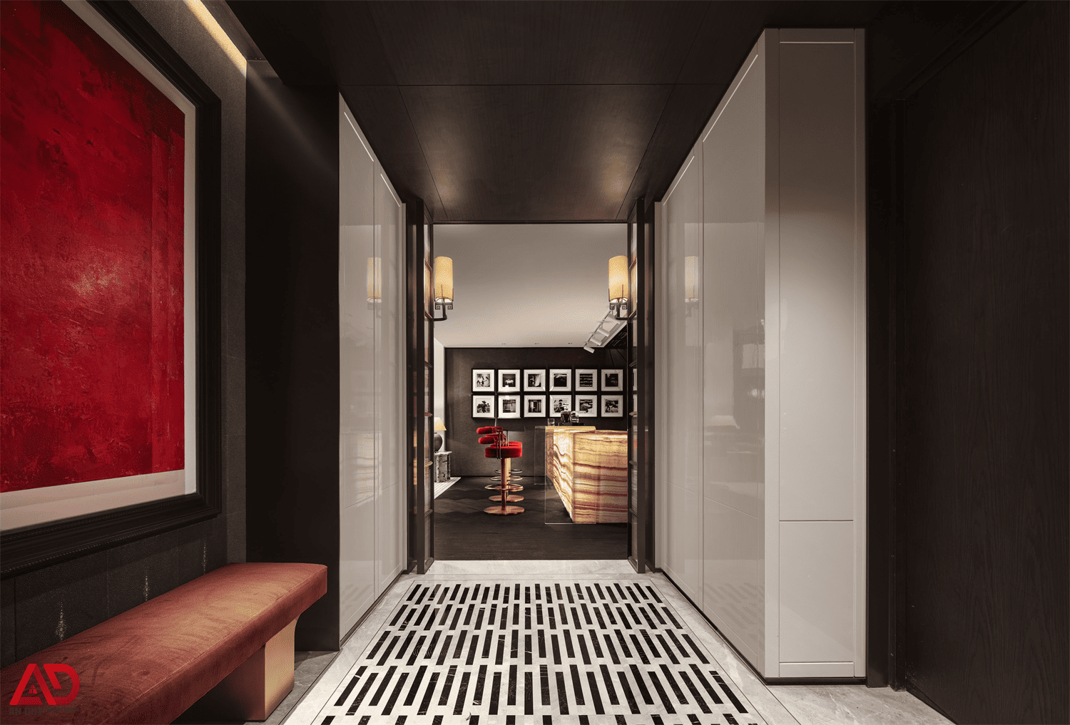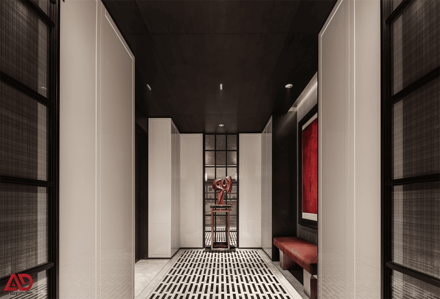 Trong bộ ảnh này, các góc chuyển tiếp được xử lý rất tinh tế: ánh sáng đèn tường, trần ốp gỗ tối, vật dụng trang trí điêu khắc và những điểm nhấn màu đỏ nghệ thuật giúp toàn bộ biệt thự giữ được mạch cảm xúc xuyên suốt. Đây là lợi thế của một đơn vị thi công nội thất biệt thự trọn gói có khả năng kiểm soát tổng thể từ chi tiết nhỏ đến bố cục lớn.