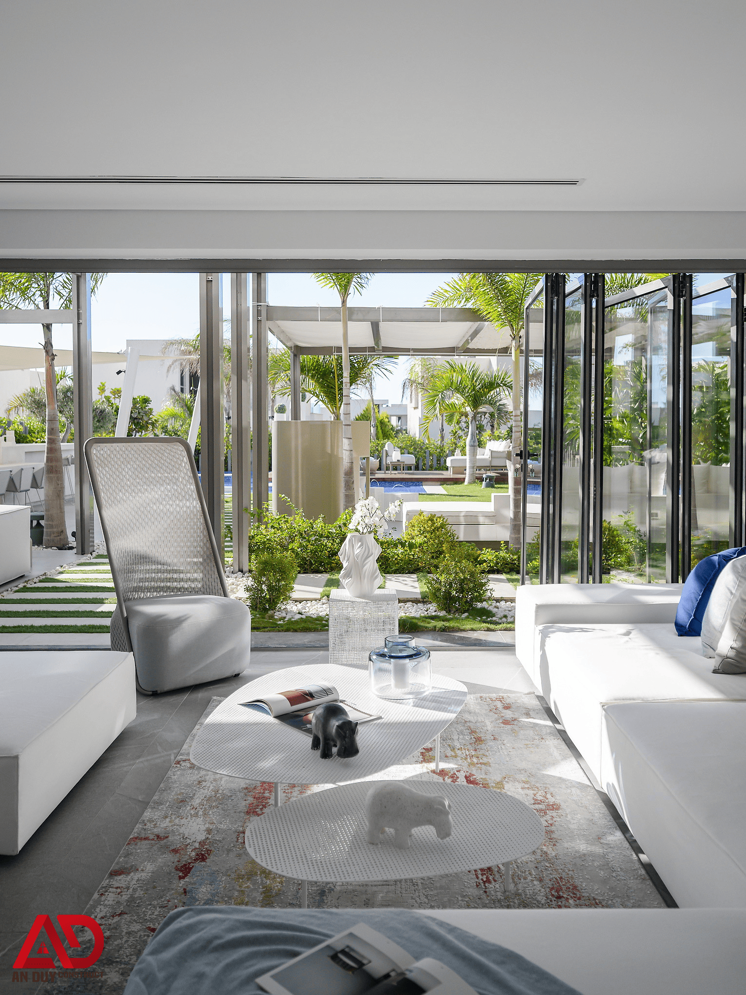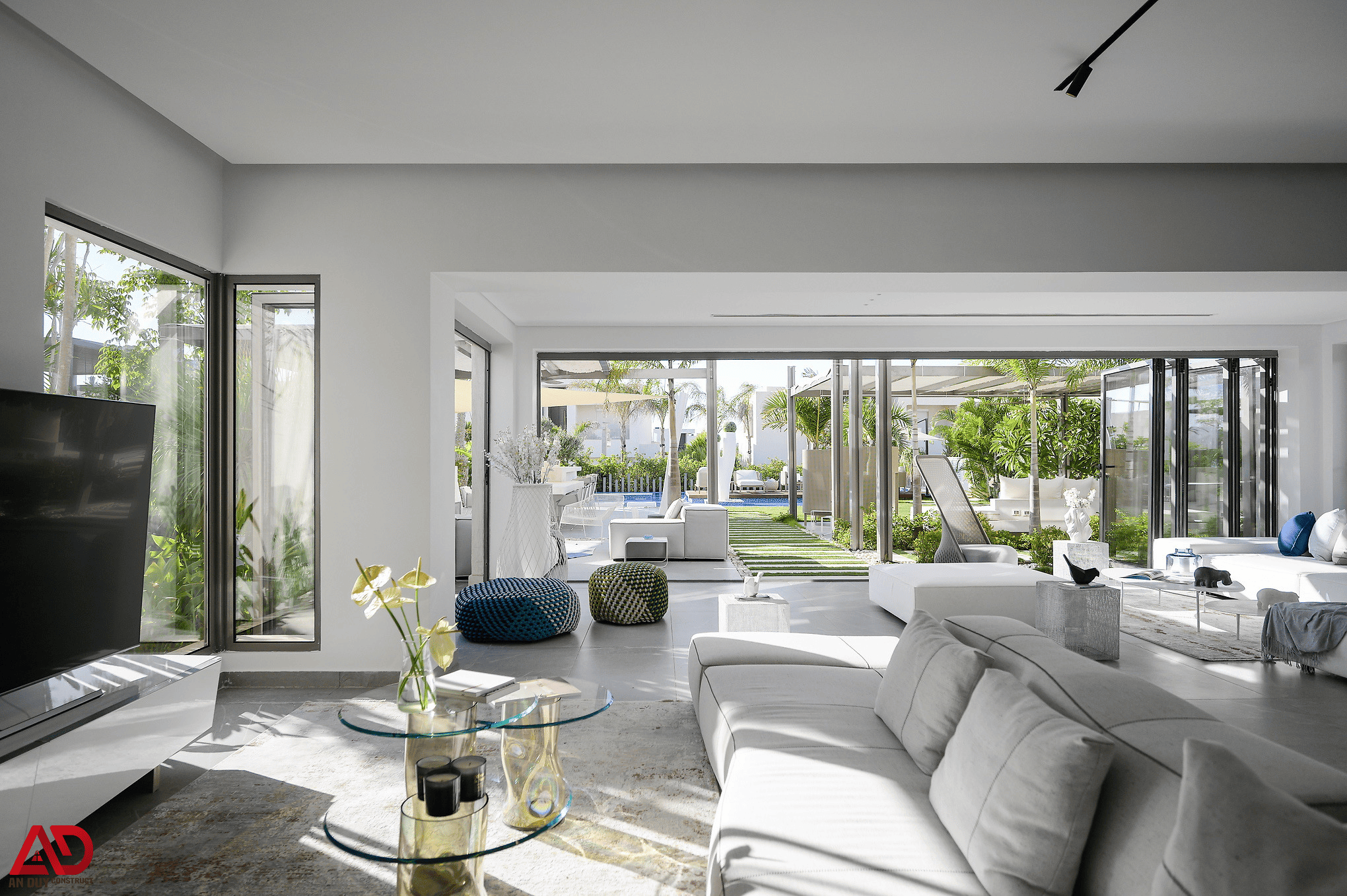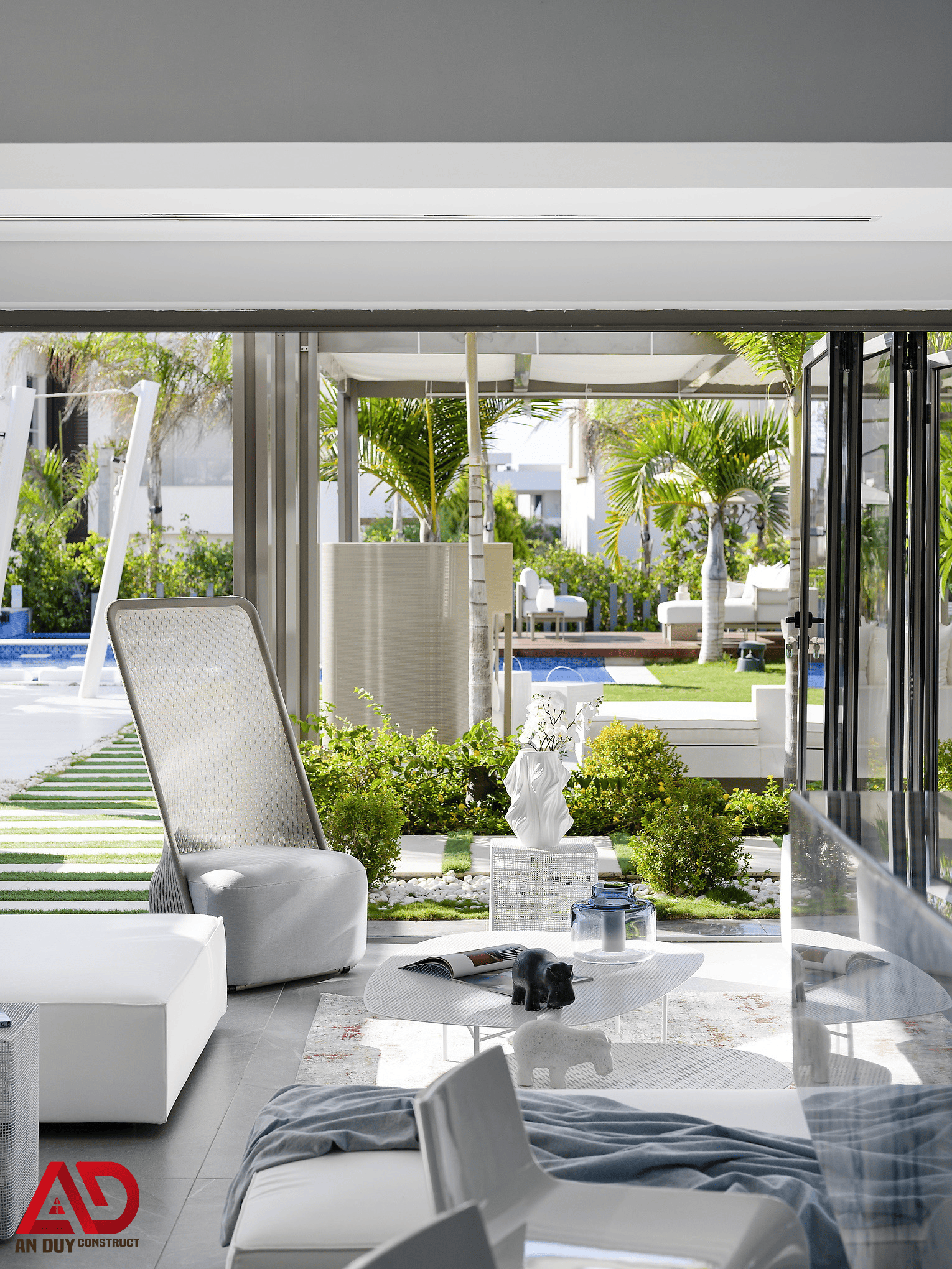 Một trong những giá trị nổi bật nhất của dự án là khả năng kết nối mạnh mẽ giữa nội thất bên trong và cảnh quan bên ngoài. Từ phòng khách, gia chủ có thể dễ dàng phóng tầm mắt ra khu sân vườn xanh mát, hồ bơi và khu thư giãn ngoài trời. Thiết kế này không chỉ nâng cao giá trị thẩm mỹ mà còn mang lại chất lượng sống tốt hơn, gần gũi với thiên nhiên hơn.