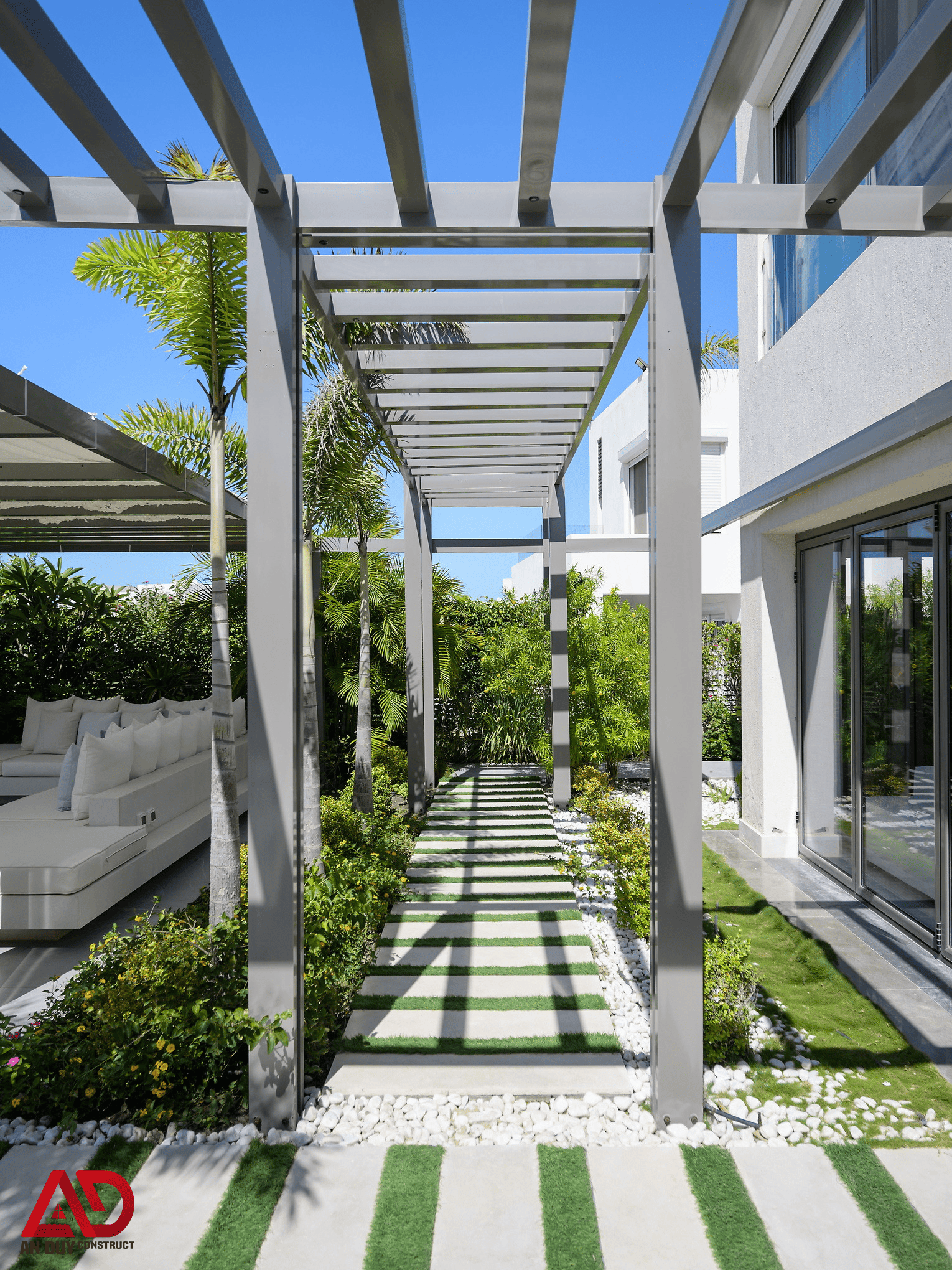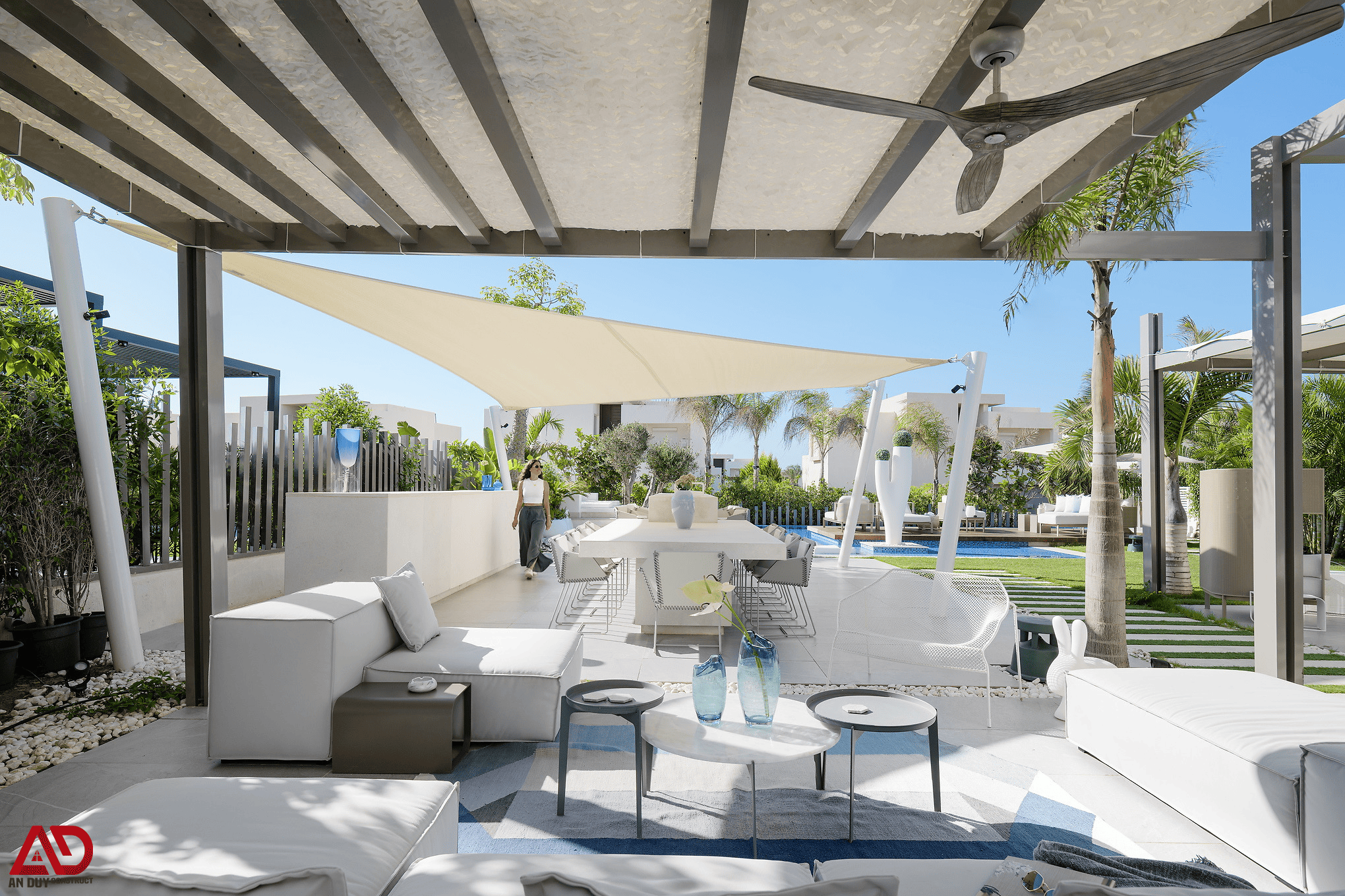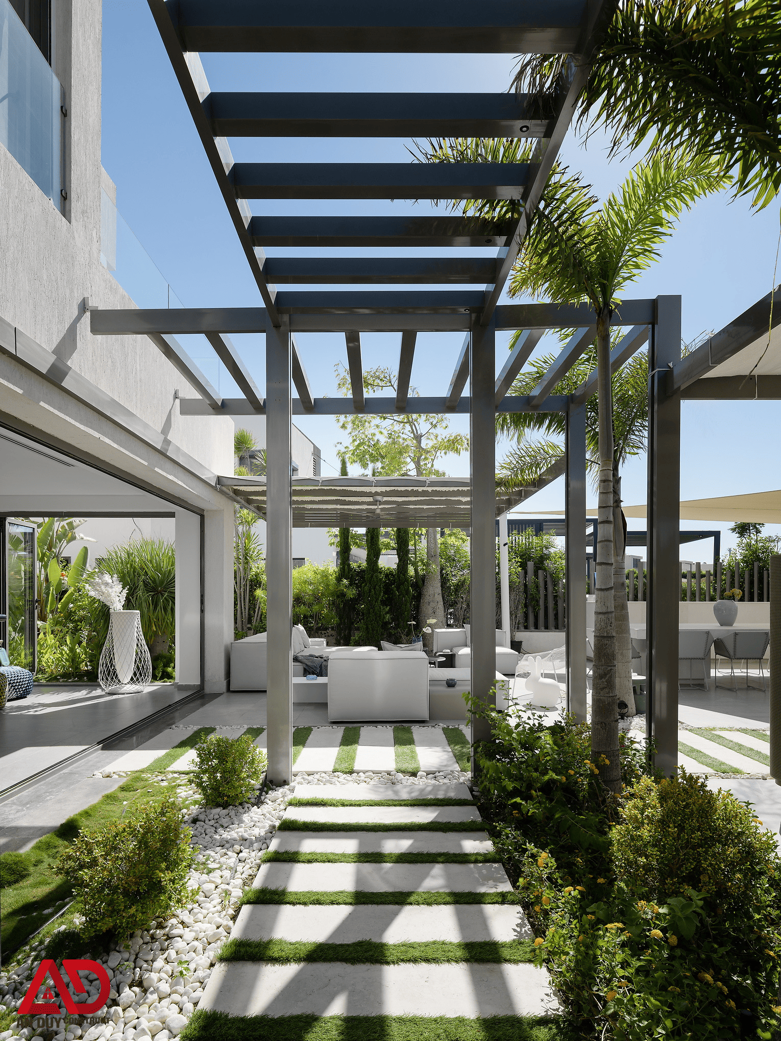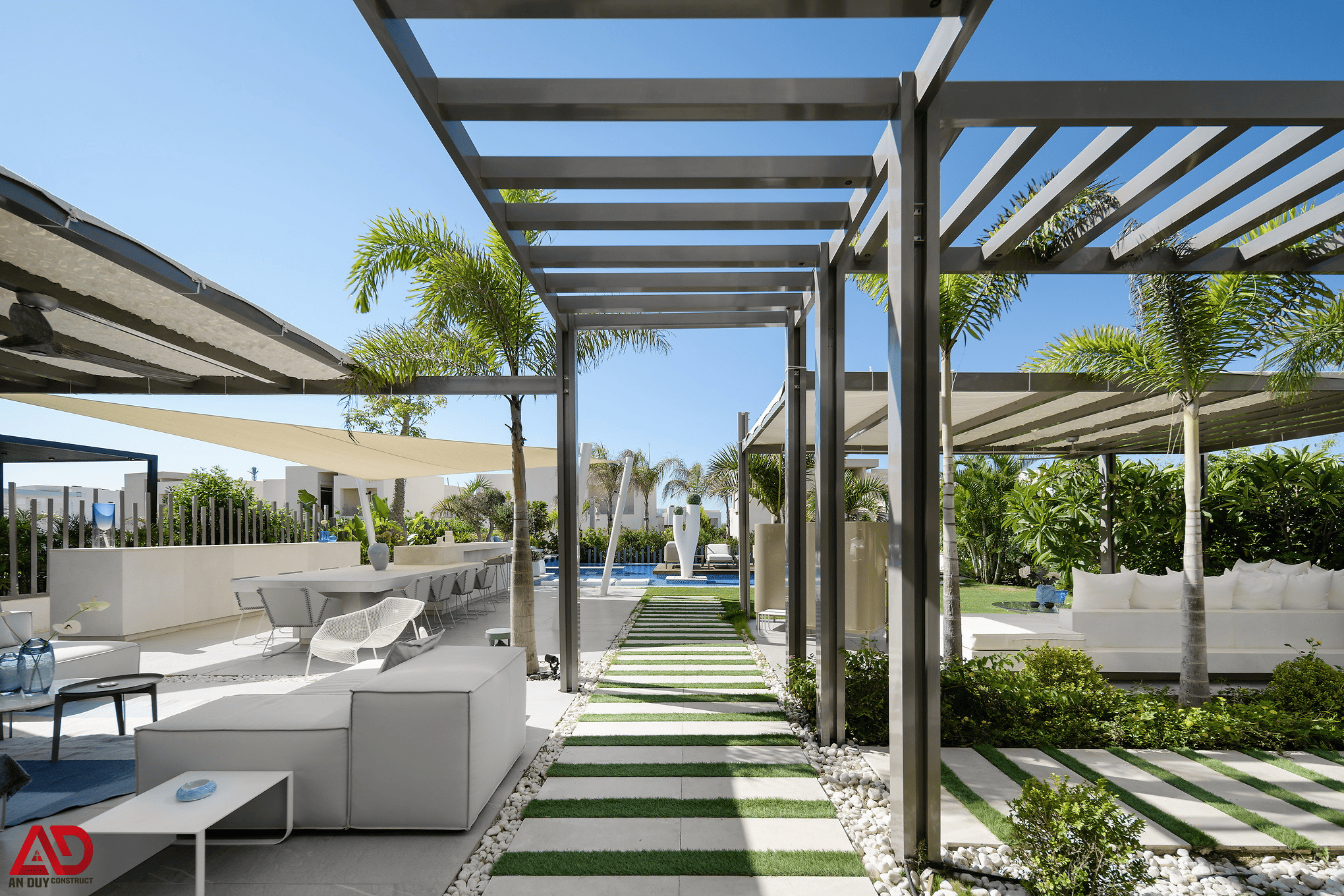 Một trong những giá trị nổi bật nhất của dự án là khả năng kết nối mạnh mẽ giữa nội thất bên trong và cảnh quan bên ngoài. Từ phòng khách, gia chủ có thể dễ dàng phóng tầm mắt ra khu sân vườn xanh mát, hồ bơi và khu thư giãn ngoài trời. Thiết kế này không chỉ nâng cao giá trị thẩm mỹ mà còn mang lại chất lượng sống tốt hơn, gần gũi với thiên nhiên hơn.