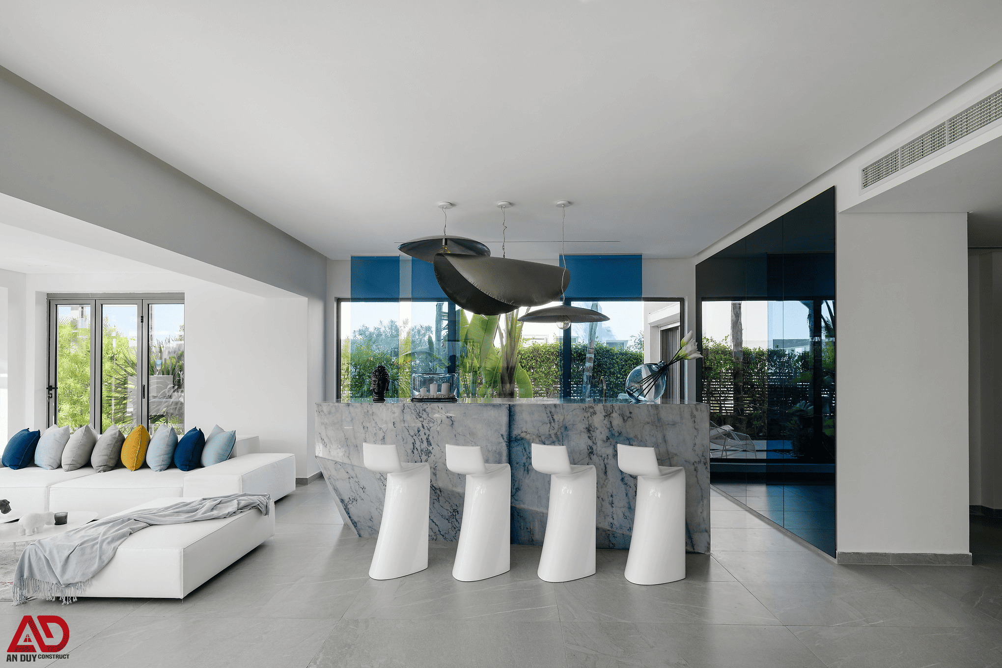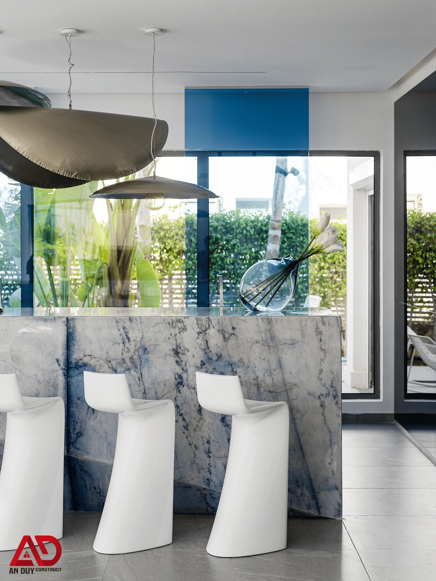 Ngoài phòng khách, khu vực quầy bar được xử lý như một điểm nhấn đắt giá của toàn bộ công trình. Chất liệu đá vân mây sang trọng kết hợp ghế bar tạo hình độc đáo và hệ đèn thả trần cá tính giúp không gian trở nên nổi bật, đậm chất nghệ thuật nhưng không hề rối mắt.