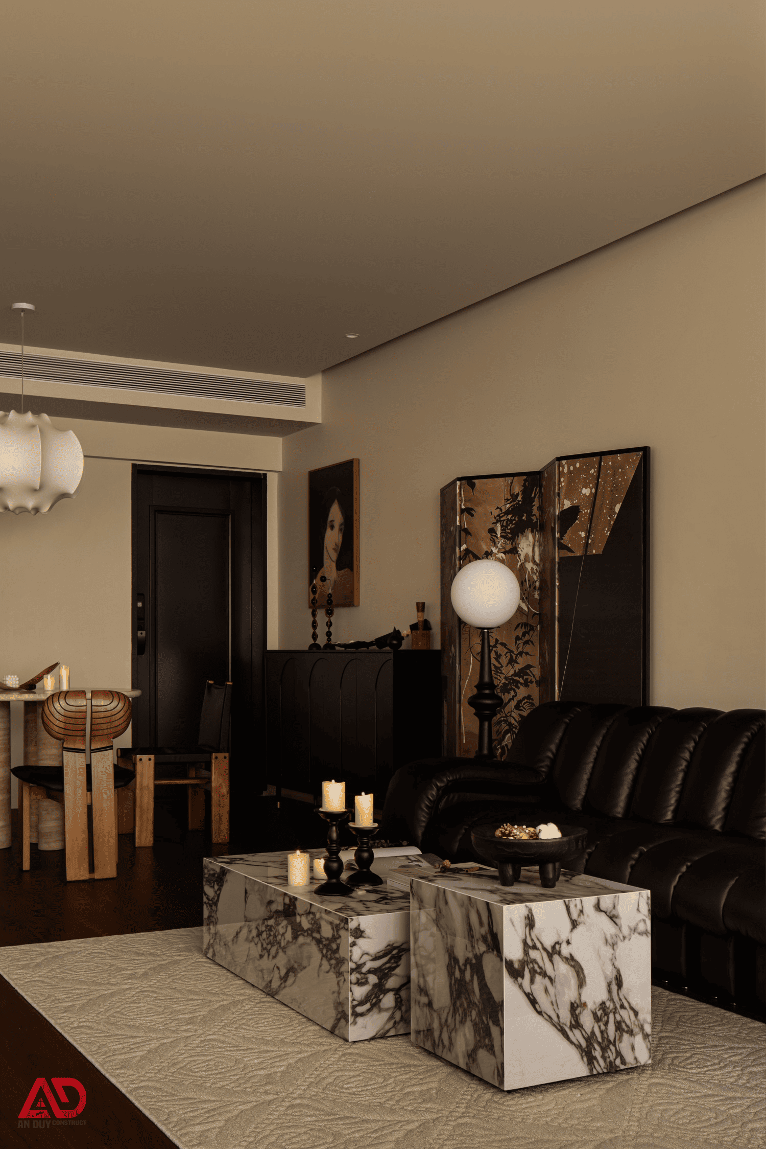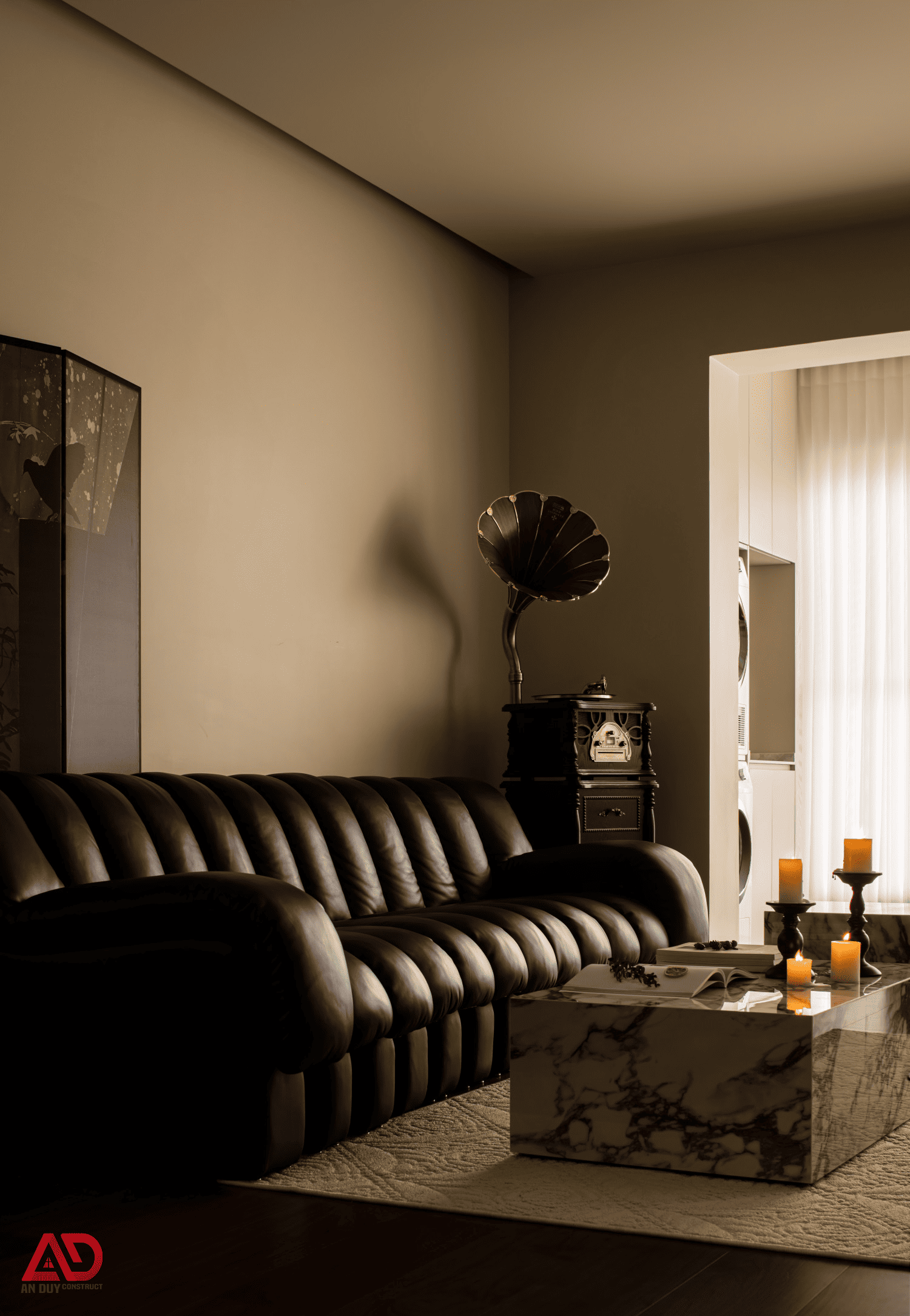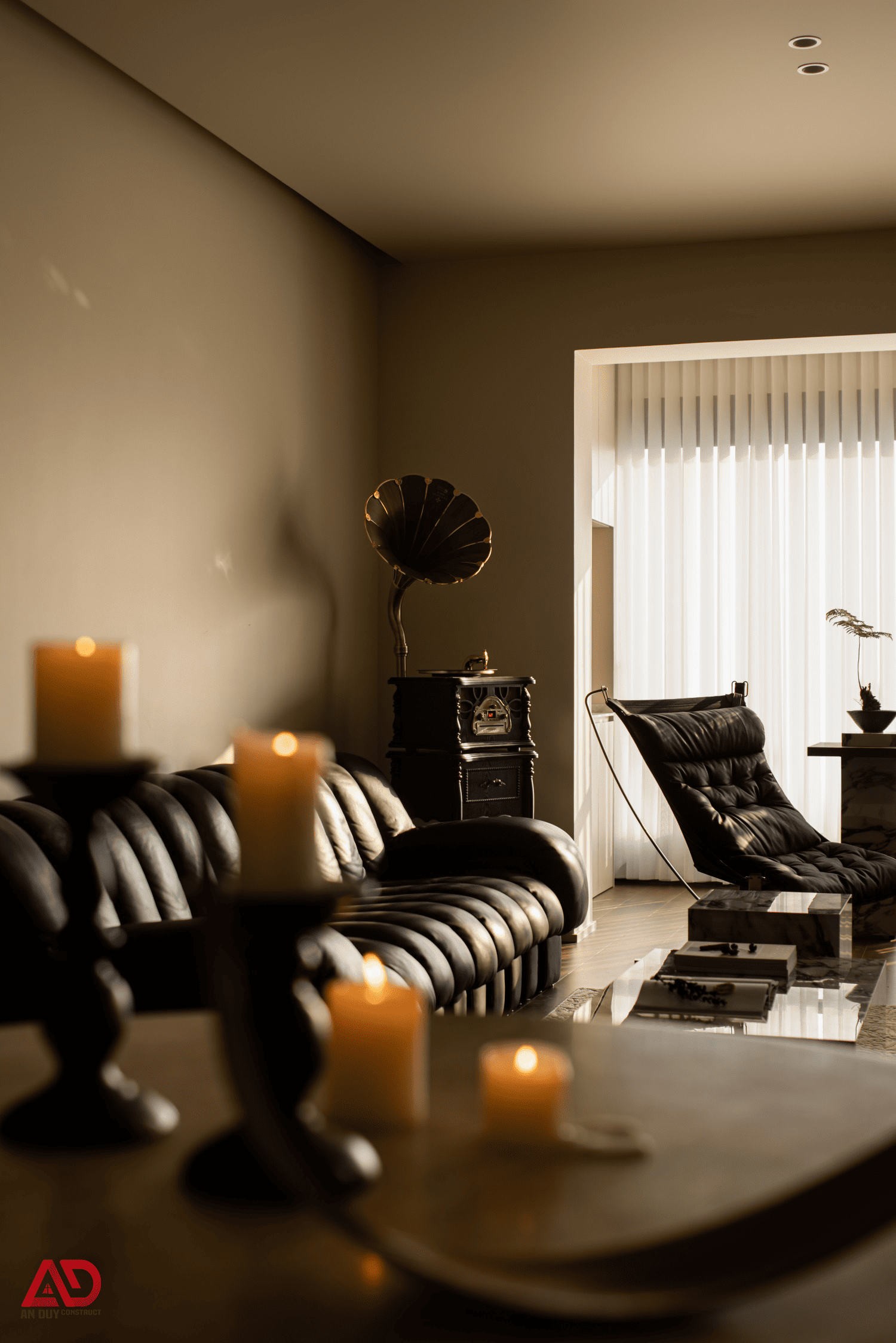 Khu vực phòng khách là điểm nhấn nổi bật của toàn bộ công trình. Bộ sofa da đen với hình khối mềm, bàn trà đá vân mây, đèn cây, bình phong nghệ thuật và những chi tiết decor được chọn lọc kỹ tạo nên một không gian tiếp khách rất có gu. Ánh sáng tự nhiên được làm mềm qua lớp rèm trắng, kết hợp cùng ánh sáng vàng dịu từ nến và đèn trang trí, giúp phòng khách trở nên sâu lắng và giàu cảm xúc hơn.