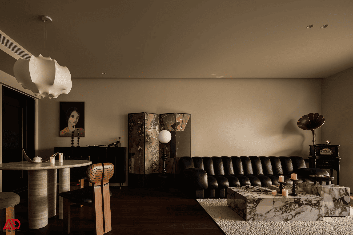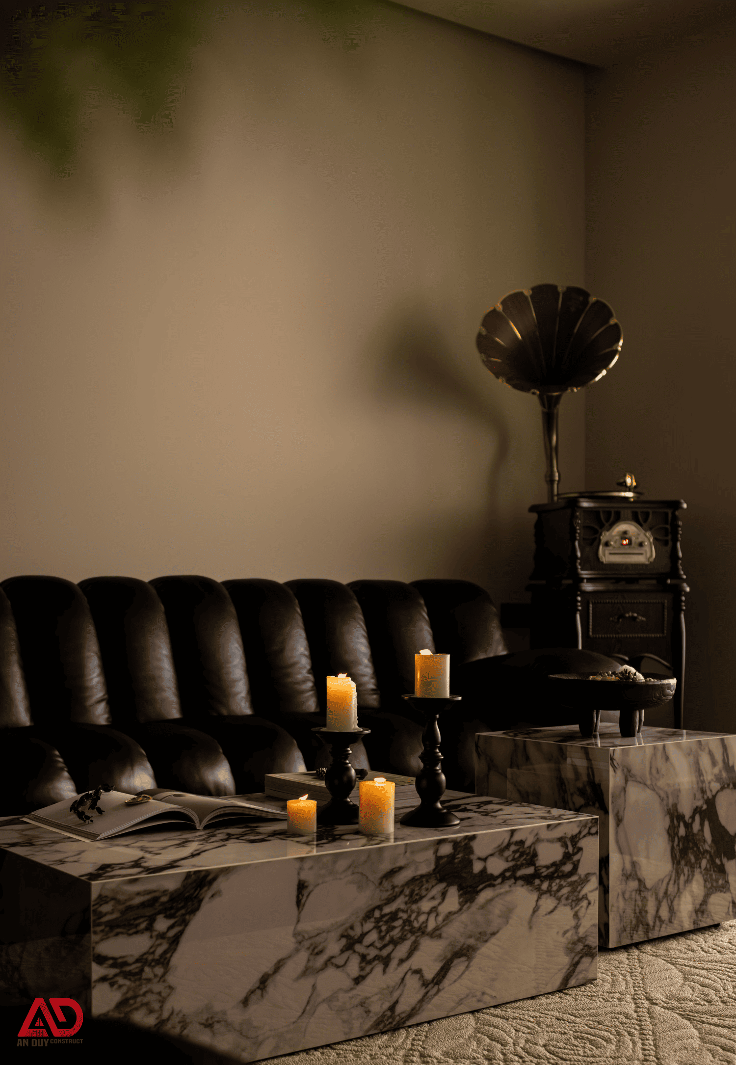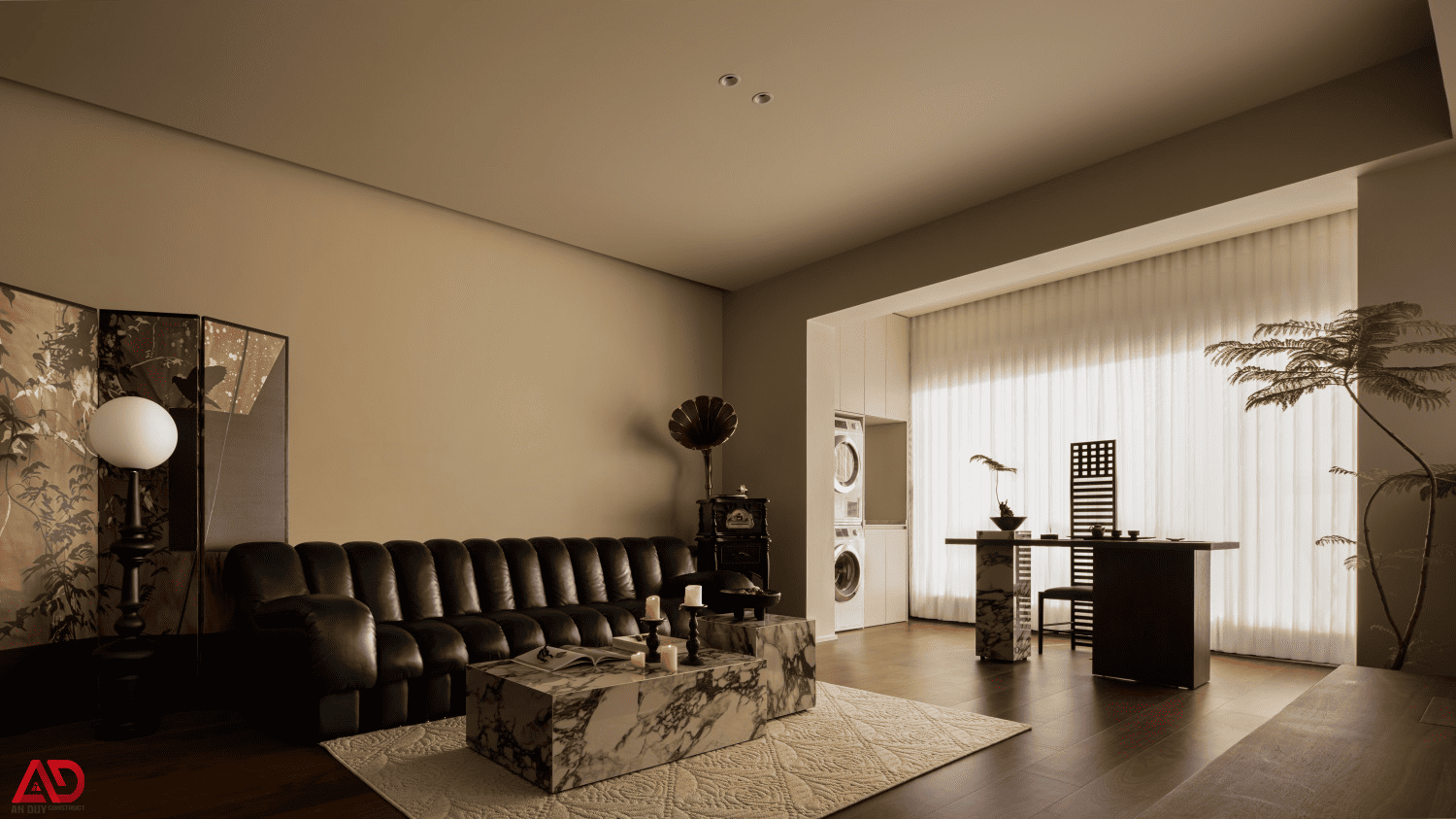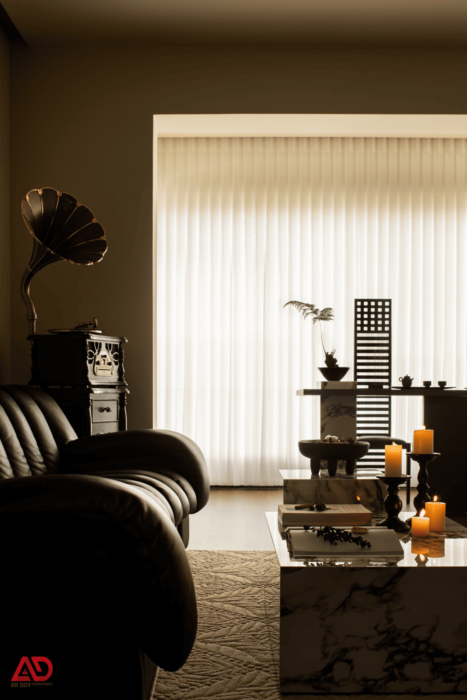 Khu vực phòng khách là điểm nhấn nổi bật của toàn bộ công trình. Bộ sofa da đen với hình khối mềm, bàn trà đá vân mây, đèn cây, bình phong nghệ thuật và những chi tiết decor được chọn lọc kỹ tạo nên một không gian tiếp khách rất có gu. Ánh sáng tự nhiên được làm mềm qua lớp rèm trắng, kết hợp cùng ánh sáng vàng dịu từ nến và đèn trang trí, giúp phòng khách trở nên sâu lắng và giàu cảm xúc hơn.