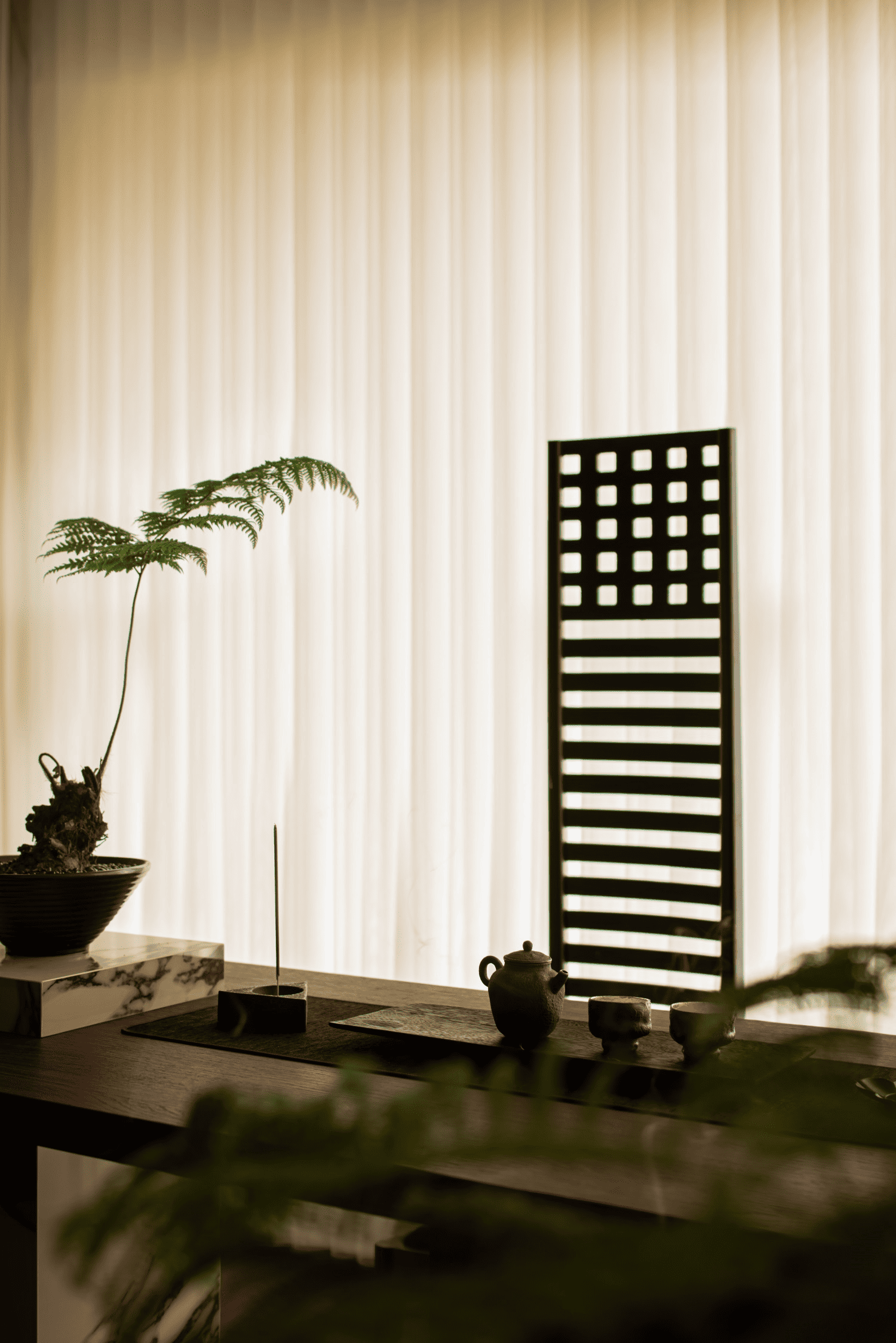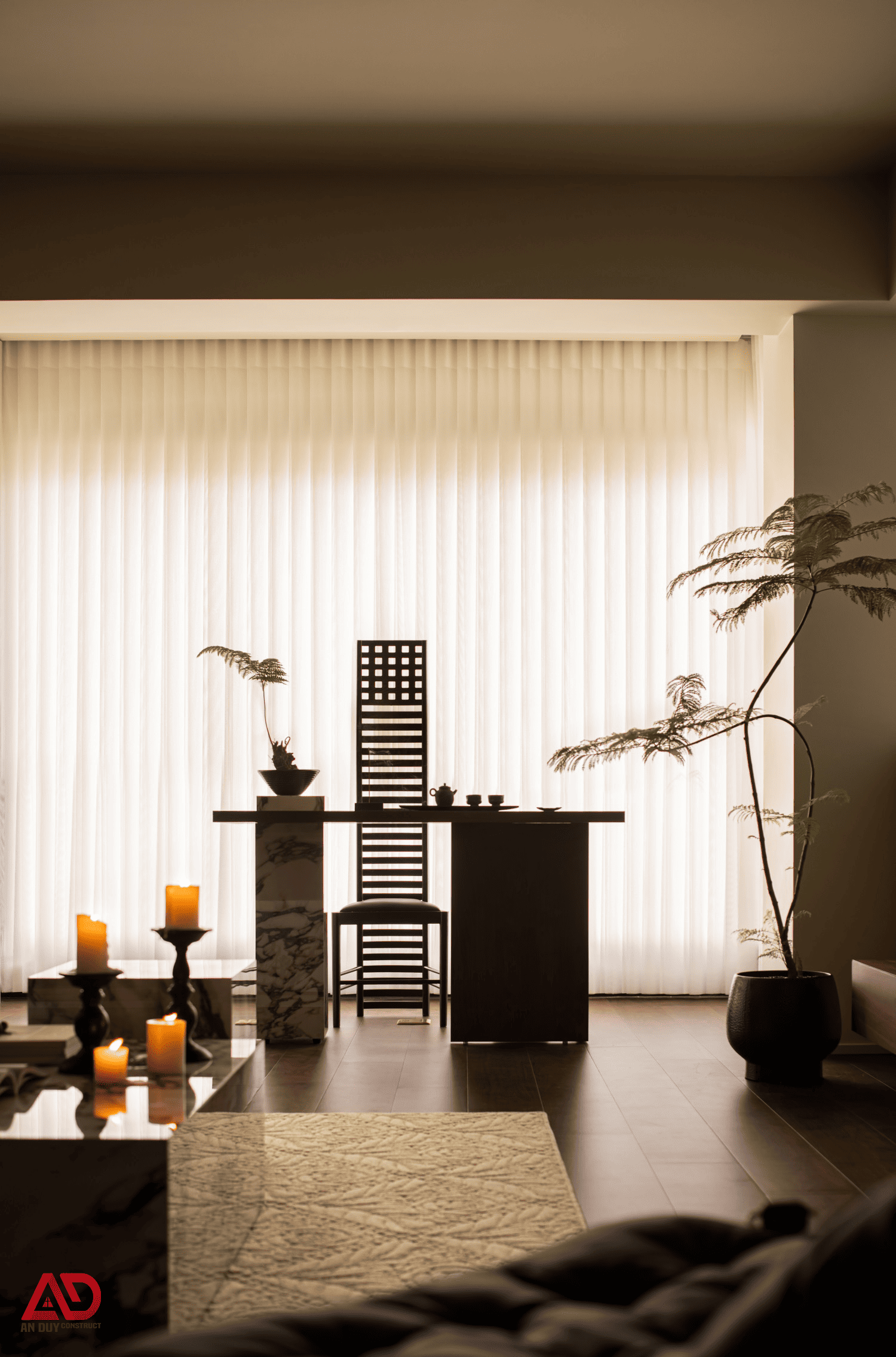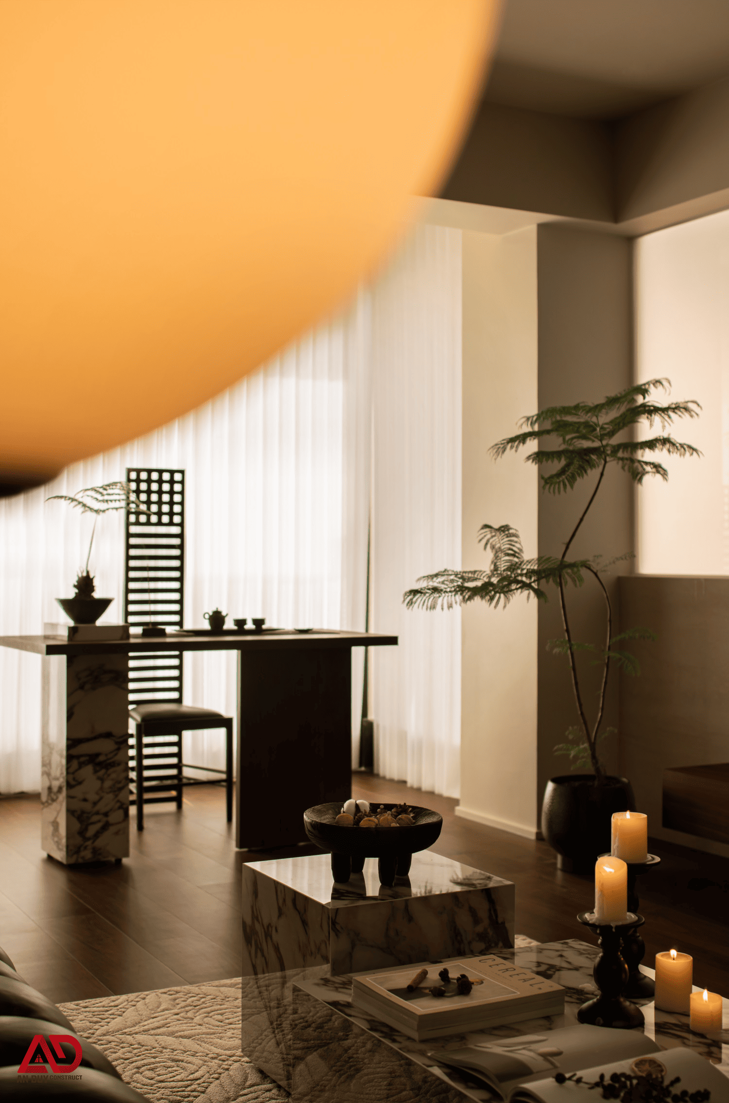 Một chi tiết đặc biệt của dự án là khu trà đạo đặt cạnh ô cửa lớn. Không gian này không chỉ là điểm nhấn thị giác mà còn góp phần định hình phong cách sống của gia chủ. Bàn trà tối giản, ghế tựa cao, cây xanh và những khoảng trống được giữ vừa đủ tạo nên một góc thư giãn đậm chất thiền, cân bằng hoàn hảo với vẻ sang trọng của khu sinh hoạt chính.