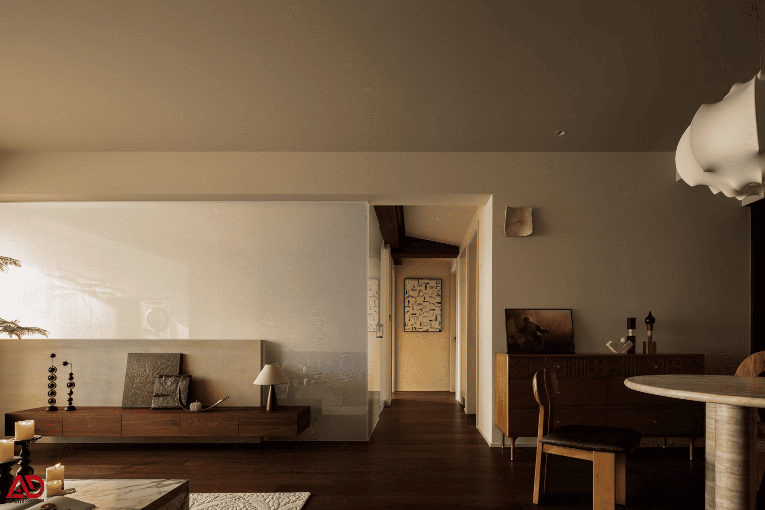 Tổng thể căn hộ sử dụng bảng màu trung tính thiên tối với các sắc kem, nâu gỗ đậm, đen và trắng ngà. Cách phối màu này giúp không gian vừa sang trọng, vừa tạo cảm giác yên tĩnh và riêng tư. Chất liệu chủ đạo như gỗ tối màu, đá vân mây, da và kính mờ được kết hợp khéo léo để tạo nên một tổng thể hài hòa, đậm tính thẩm mỹ nhưng không phô trương.