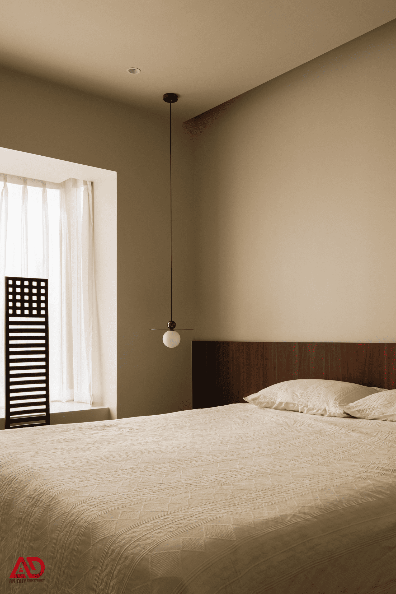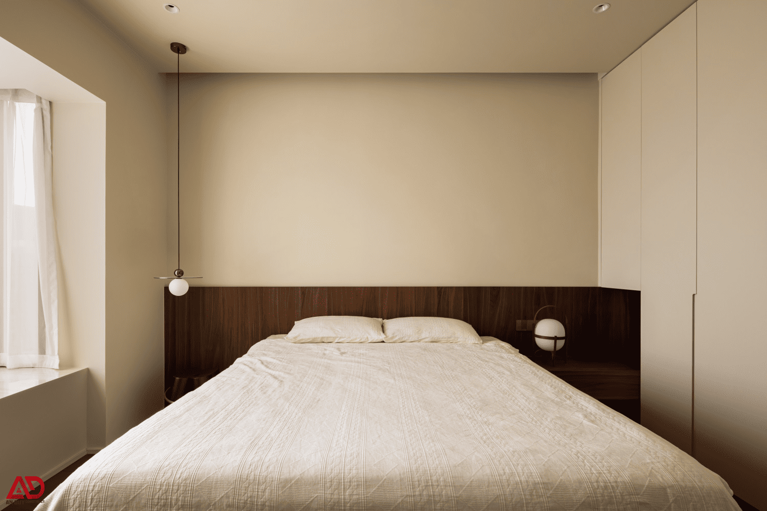Phòng ngủ tiếp tục nối dài tinh thần thiết kế chung với bảng màu nhẹ hơn, tạo cảm giác thư giãn và ấm áp. Mảng gỗ đầu giường, hệ tủ âm tường, đèn thả nhỏ và cửa sổ đón sáng giúp không gian nghỉ ngơi trở nên tối giản nhưng vẫn đủ đầy công năng. Không có quá nhiều chi tiết, nhưng mỗi yếu tố đều được cân nhắc kỹ để tạo nên sự cân bằng và thoải mái.