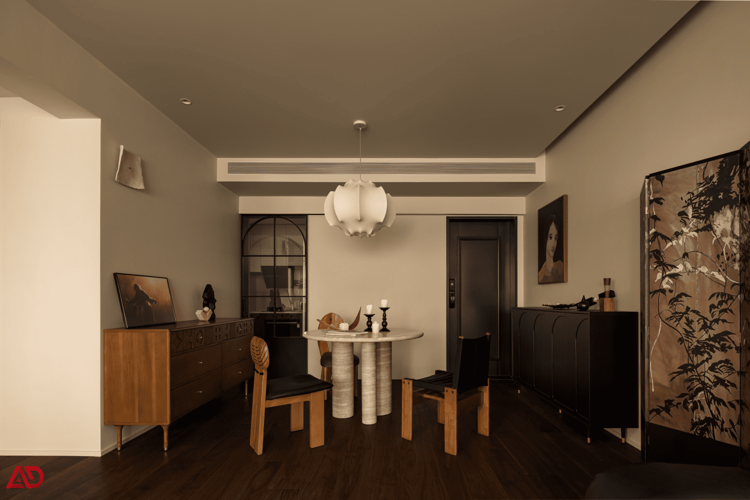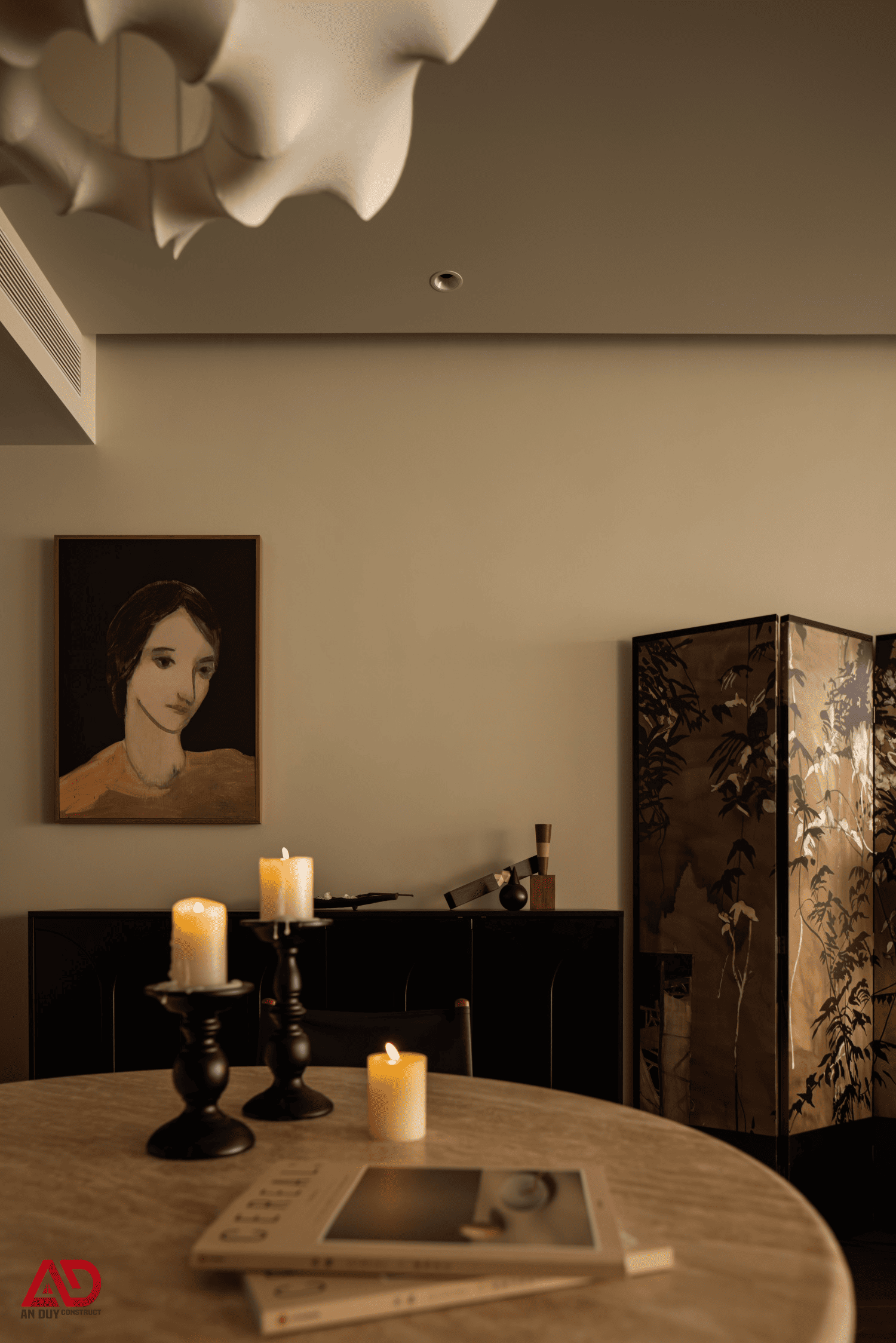Ở khu vực bàn ăn, công trình tiếp tục giữ tinh thần tối giản nhưng nâng cao cảm xúc bằng ngôn ngữ vật liệu và hình khối. Bộ bàn tròn mặt đá, ghế gỗ cá tính, đèn thả điêu khắc và tủ console gỗ tạo nên một góc ăn uống nhỏ gọn nhưng rất tinh tế. Các yếu tố nghệ thuật như tranh chân dung, decor bàn và bình phong được lồng ghép vừa phải, làm cho không gian sống trở nên cá nhân và có chiều sâu hơn.