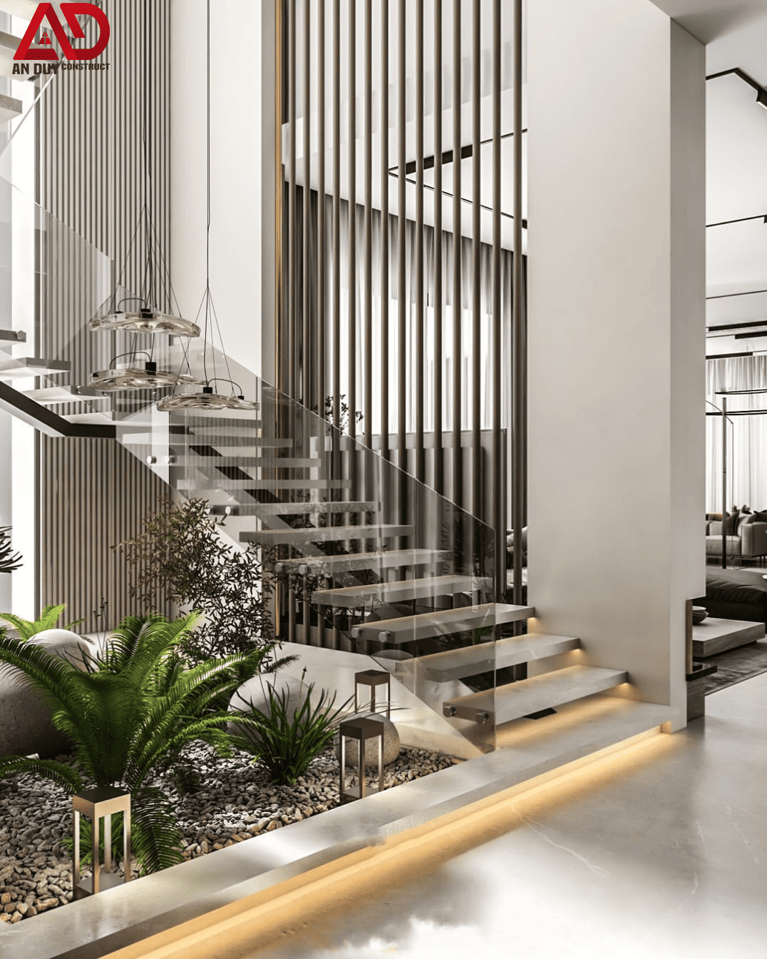 Khu vực cầu thang là một điểm nhấn rất đáng chú ý. Thiết kế bậc thang bay kết hợp lan can kính tạo cảm giác nhẹ, thanh thoát và hiện đại. Bên dưới cầu thang là tiểu cảnh xanh giúp làm mềm không gian, tăng tính thư giãn và tạo cảm giác gần gũi thiên nhiên hơn trong một bố cục nội thất sang trọng.