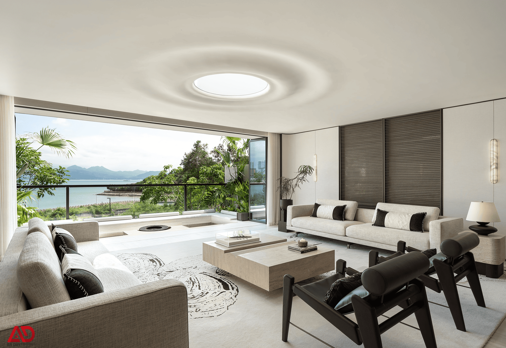 Ngay khi bước vào không gian phòng khách, công trình lập tức tạo ấn tượng bằng bố cục đối xứng, các đường nét tối giản và tầm nhìn mở rộng ra cảnh quan bên ngoài. Những mảng kính lớn giúp kéo thiên nhiên, ánh sáng và đường chân trời vào sâu bên trong nội thất, khiến không gian như rộng hơn, thoáng hơn và giàu cảm xúc hơn.