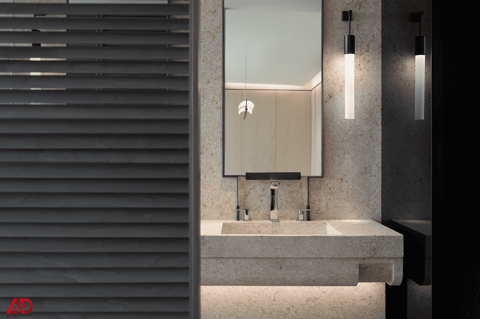 Khu vực vệ sinh tiếp tục duy trì tinh thần tối giản sang trọng với lavabo đá, gương hình chữ nhật, đèn tường thanh mảnh và hệ ánh sáng hắt chân khối. Những chi tiết nhỏ nhưng được thi công chuẩn xác đã góp phần hoàn thiện đẳng cấp chung của toàn bộ ngôi nhà.