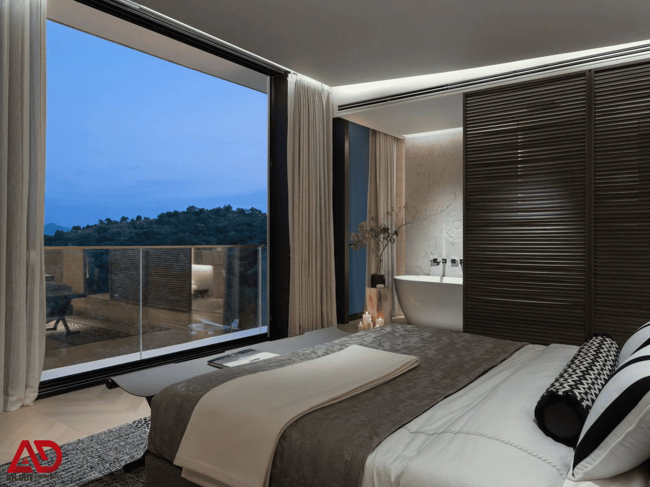 Phòng ngủ được thiết kế theo tinh thần nghỉ dưỡng với hệ tủ âm tường gọn gàng, giường thấp, ánh sáng mềm và cửa kính lớn mở ra khung cảnh thiên nhiên. Không gian này không cần nhiều chi tiết cầu kỳ, nhưng vẫn toát lên sự chỉn chu, tinh tế và đầy thư giãn.