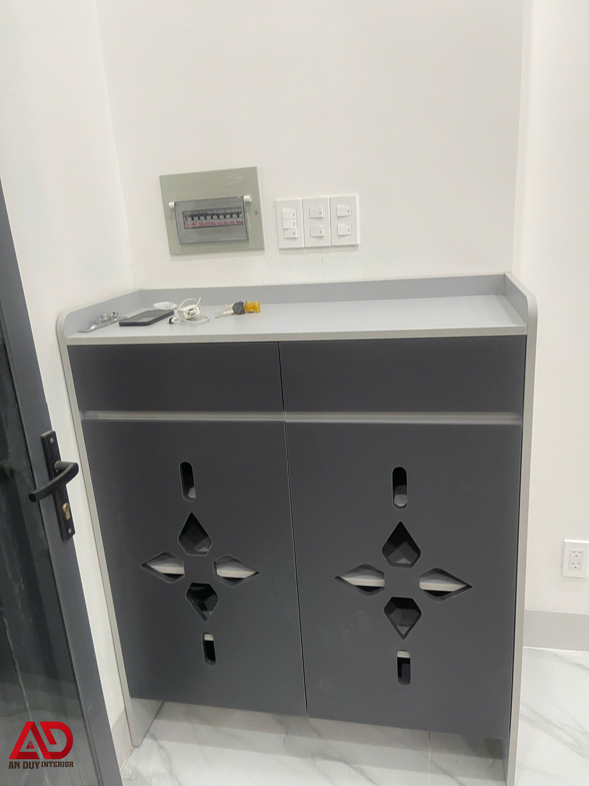 Ở các khu vực phụ trợ, nội thất được bố trí ngắn gọn nhưng vẫn đảm bảo tính tiện ích. Hệ tủ giày và các bề mặt phụ được thiết kế đồng bộ, tối ưu cho nhu cầu sử dụng hằng ngày mà không làm rối mắt tổng thể.
