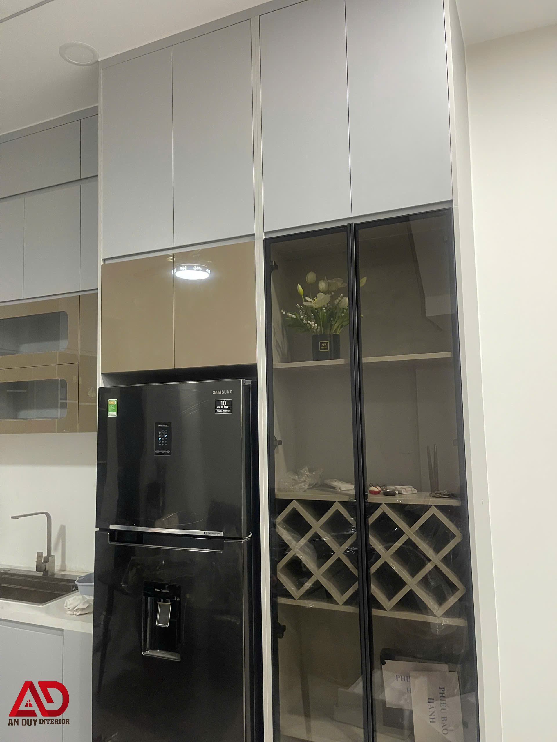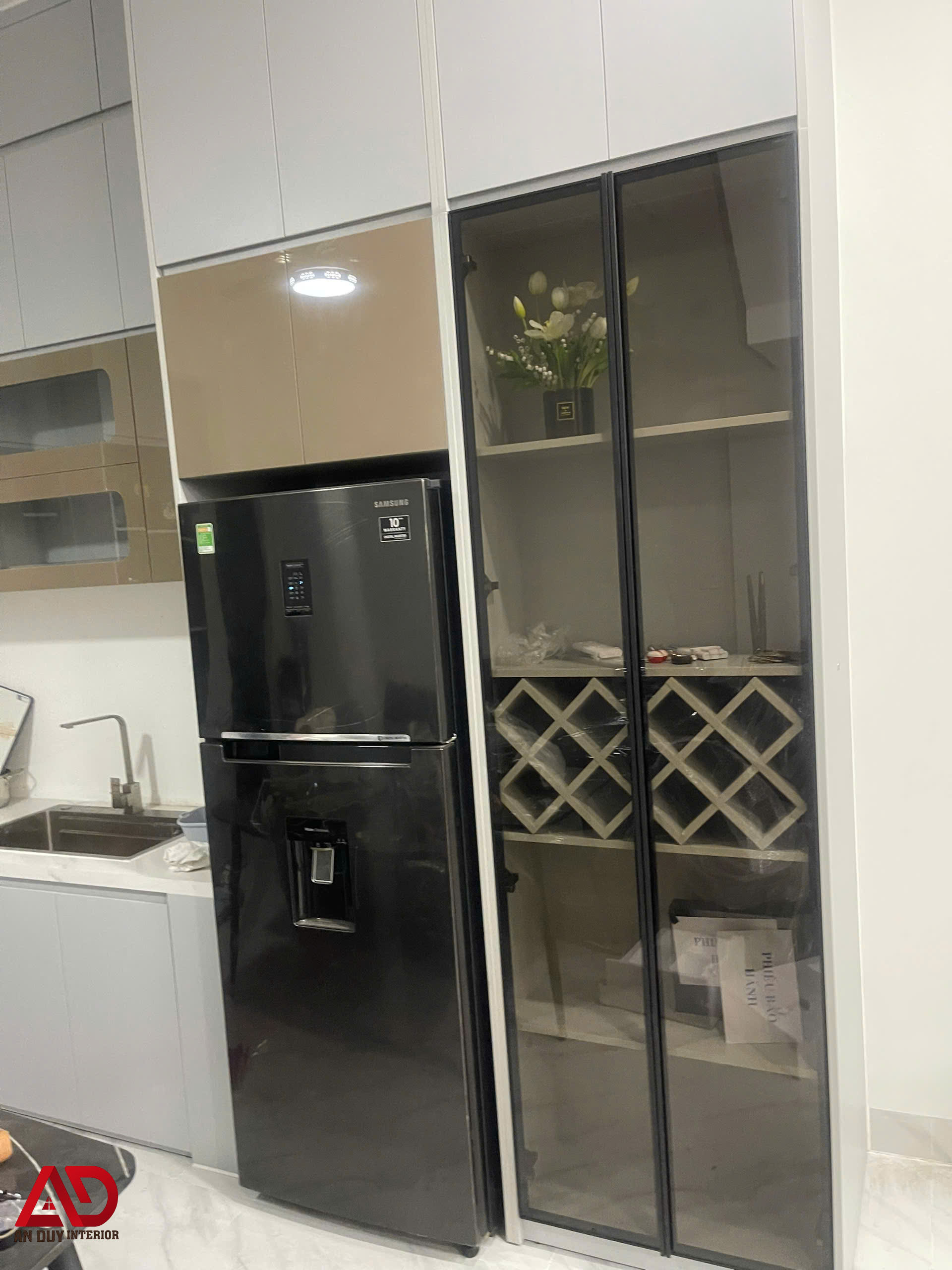 Bên cạnh hệ tủ bếp là tủ trang trí kết hợp tủ rượu và vị trí đặt tủ lạnh, vừa tăng công năng vừa hoàn thiện thẩm mỹ cho toàn bộ không gian bếp. Thiết kế kính tối màu kết hợp khung đen tạo điểm nhấn sang trọng, phù hợp với tinh thần hiện đại của ngôi nhà.