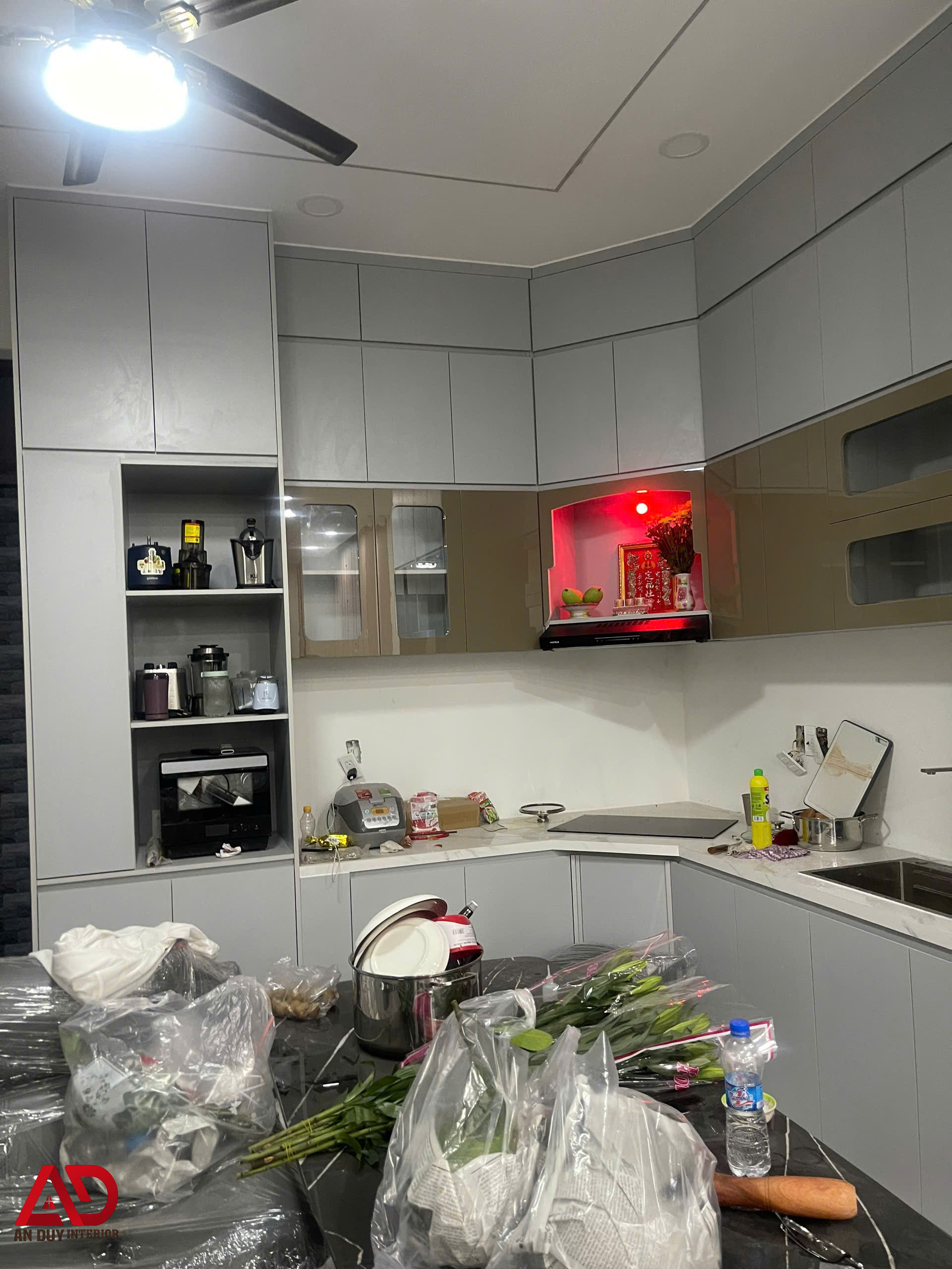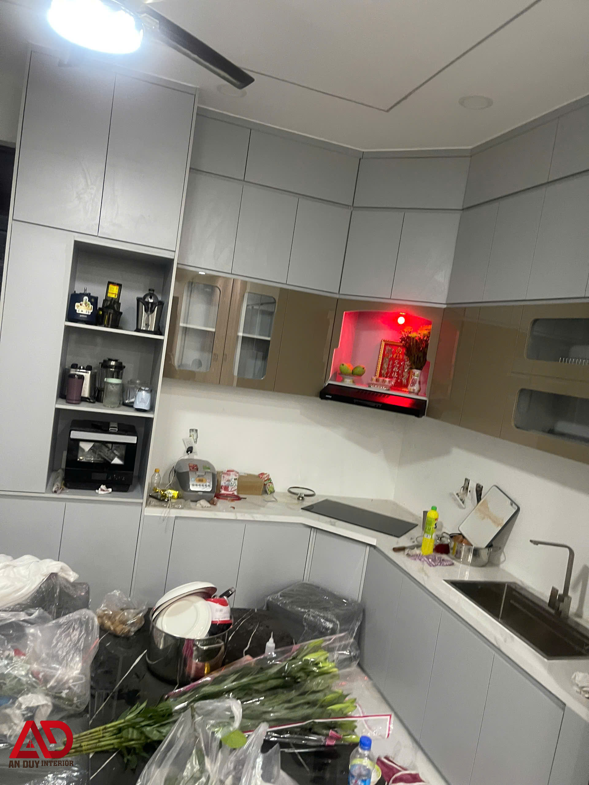Khu vực bếp được thiết kế theo dạng bếp chữ L, tối ưu luồng di chuyển và thao tác trong quá trình sử dụng. Hệ tủ bếp trên dưới cao kịch trần mang đến khả năng lưu trữ lớn, giúp căn bếp luôn gọn gàng và ngăn nắp. Bảng màu xám trung tính kết hợp kính ốp và mặt bếp sáng màu tạo nên cảm giác sạch sẽ, hiện đại và dễ bảo trì trong quá trình sử dụng lâu dài.