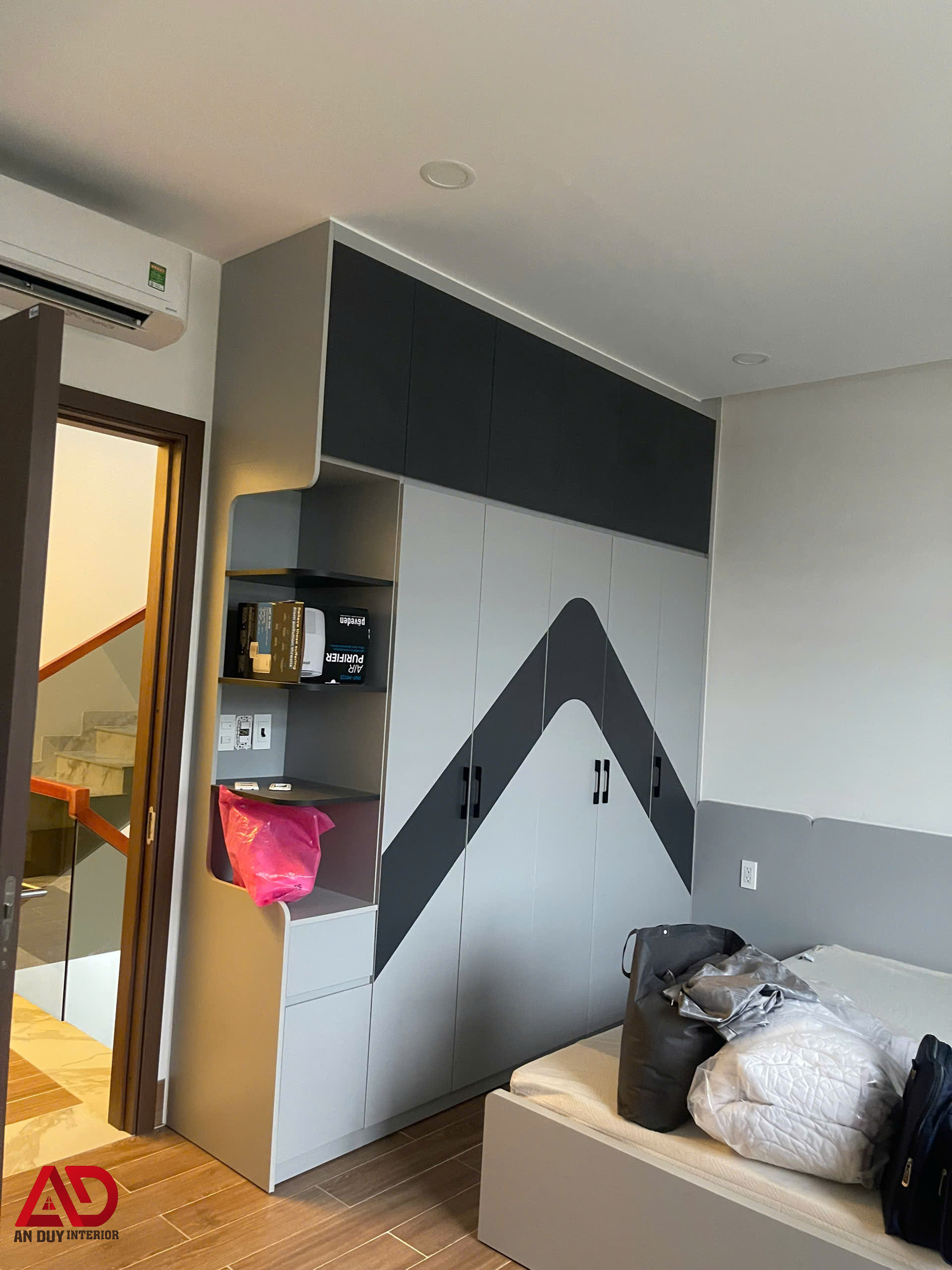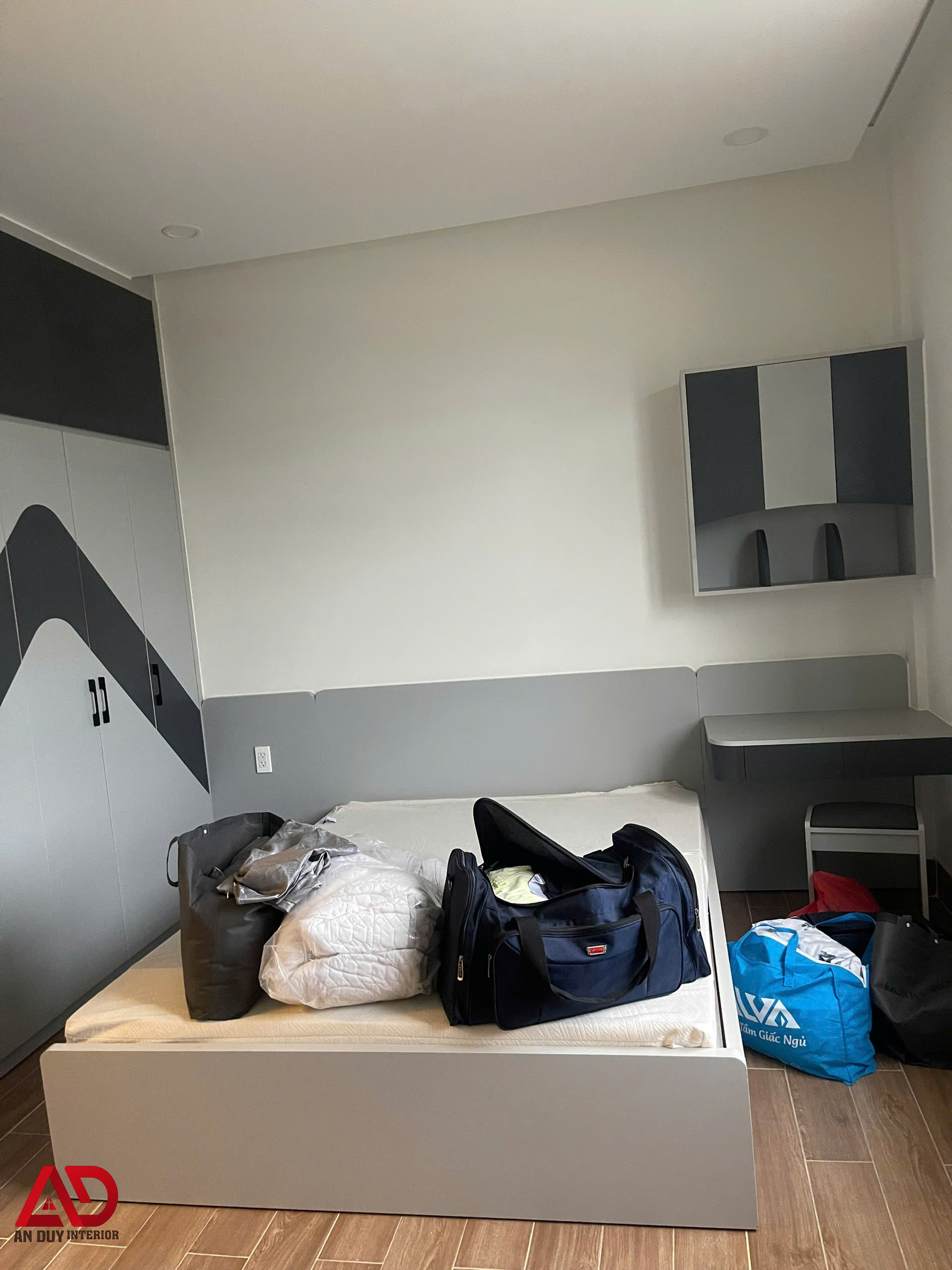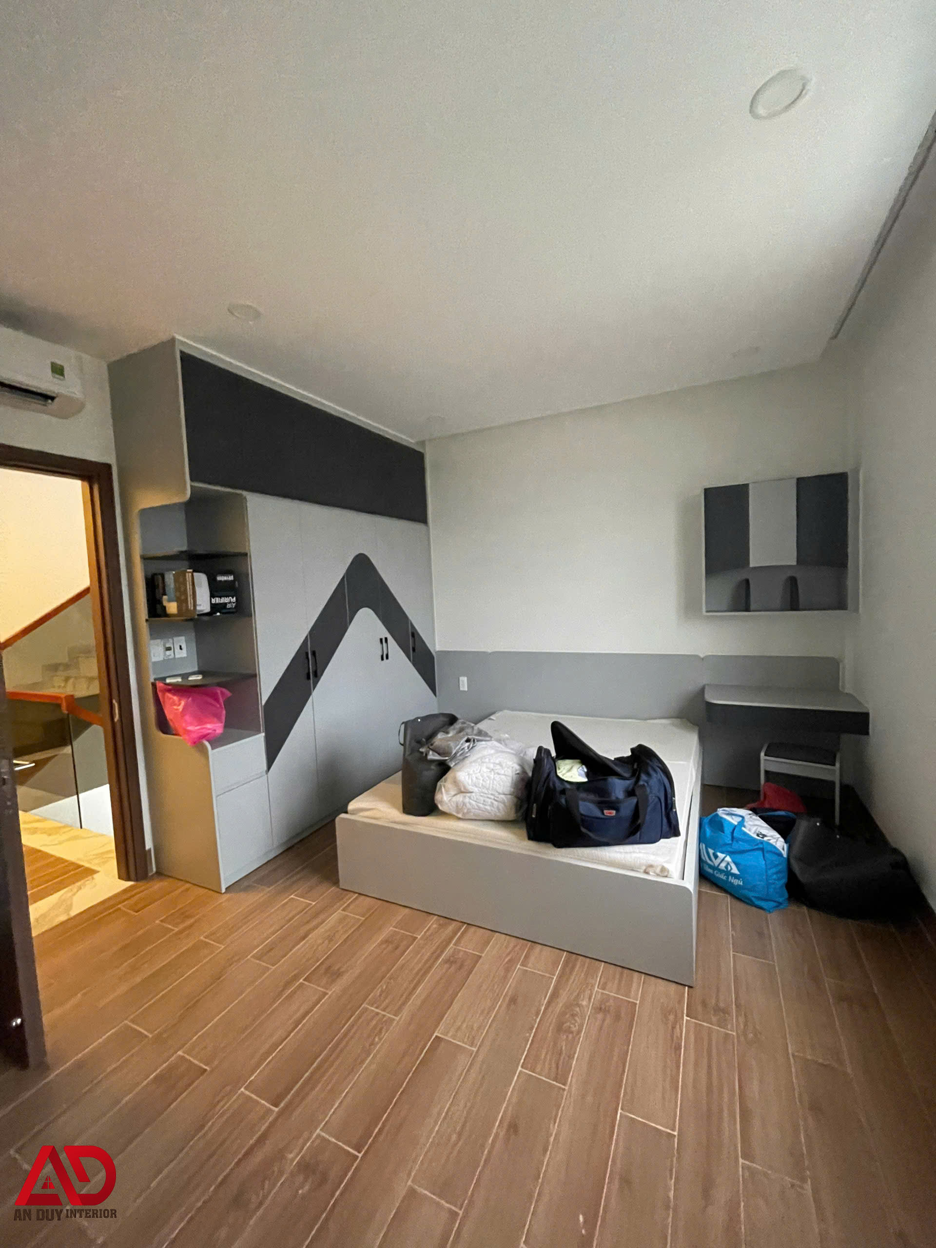 Phòng ngủ tiếp tục được triển khai theo hướng tối giản, công năng cao và có tính cá nhân hóa rõ nét. Với phòng ngủ mang tông xám, An Duy Interior sử dụng giường thấp, hệ tủ quần áo lớn, bàn học gắn tường và ghế băng cạnh cửa sổ để tạo nên không gian nghỉ ngơi tiện nghi, trẻ trung và phù hợp với nhu cầu sử dụng của người trẻ. Các mảng hình học trên cánh tủ giúp căn phòng có điểm nhấn mạnh về thị giác, hiện đại nhưng không quá nặng nề.