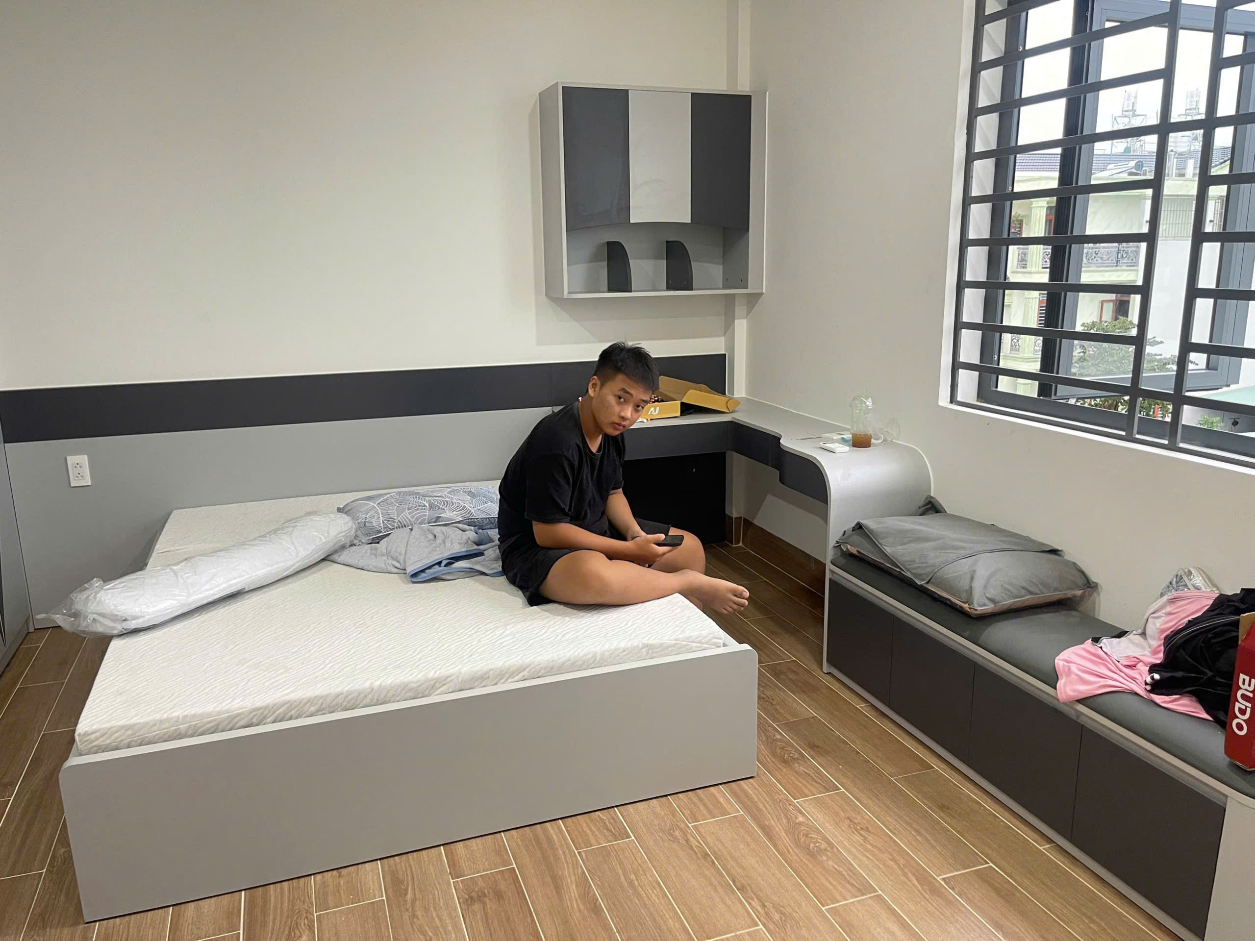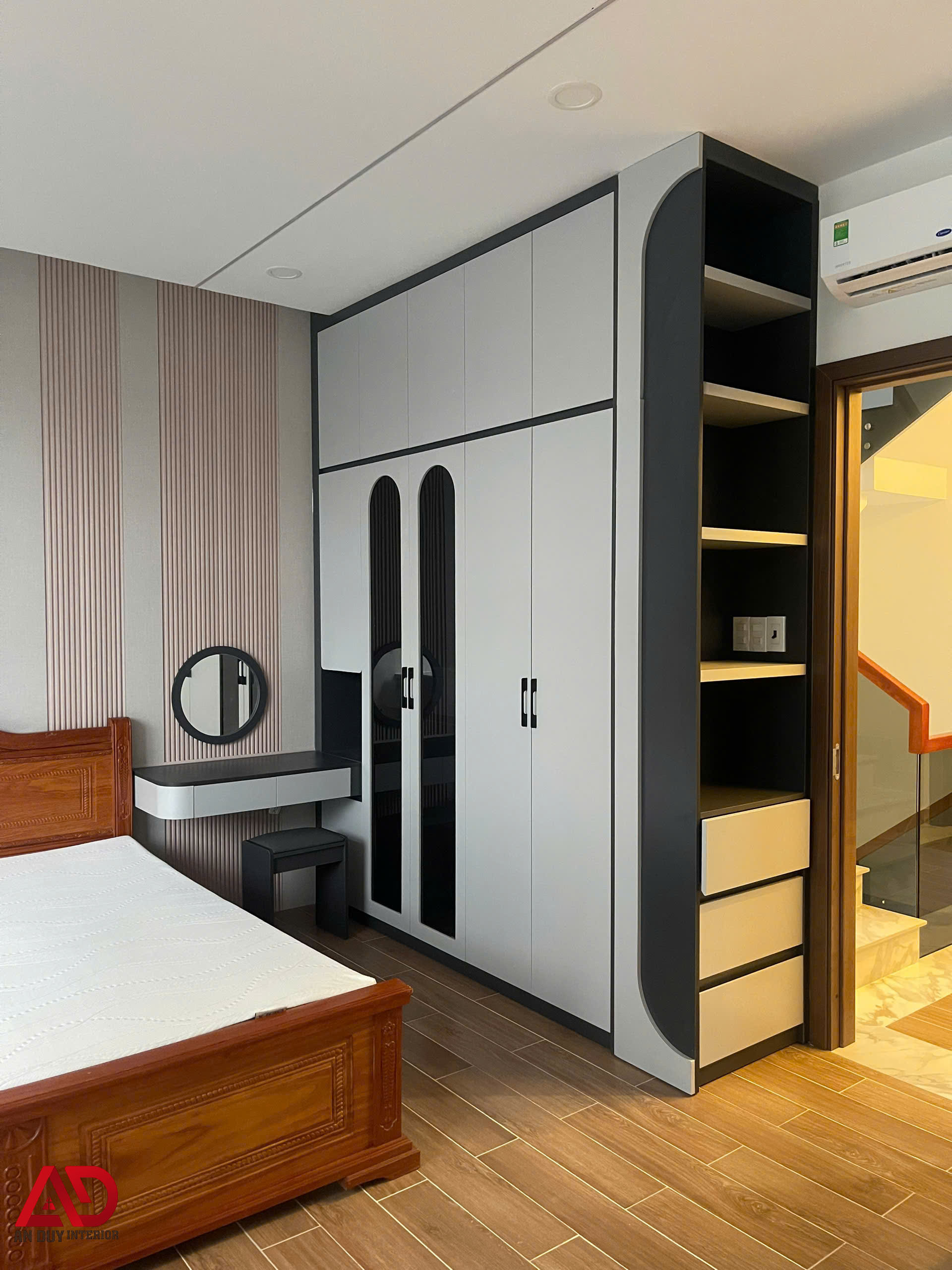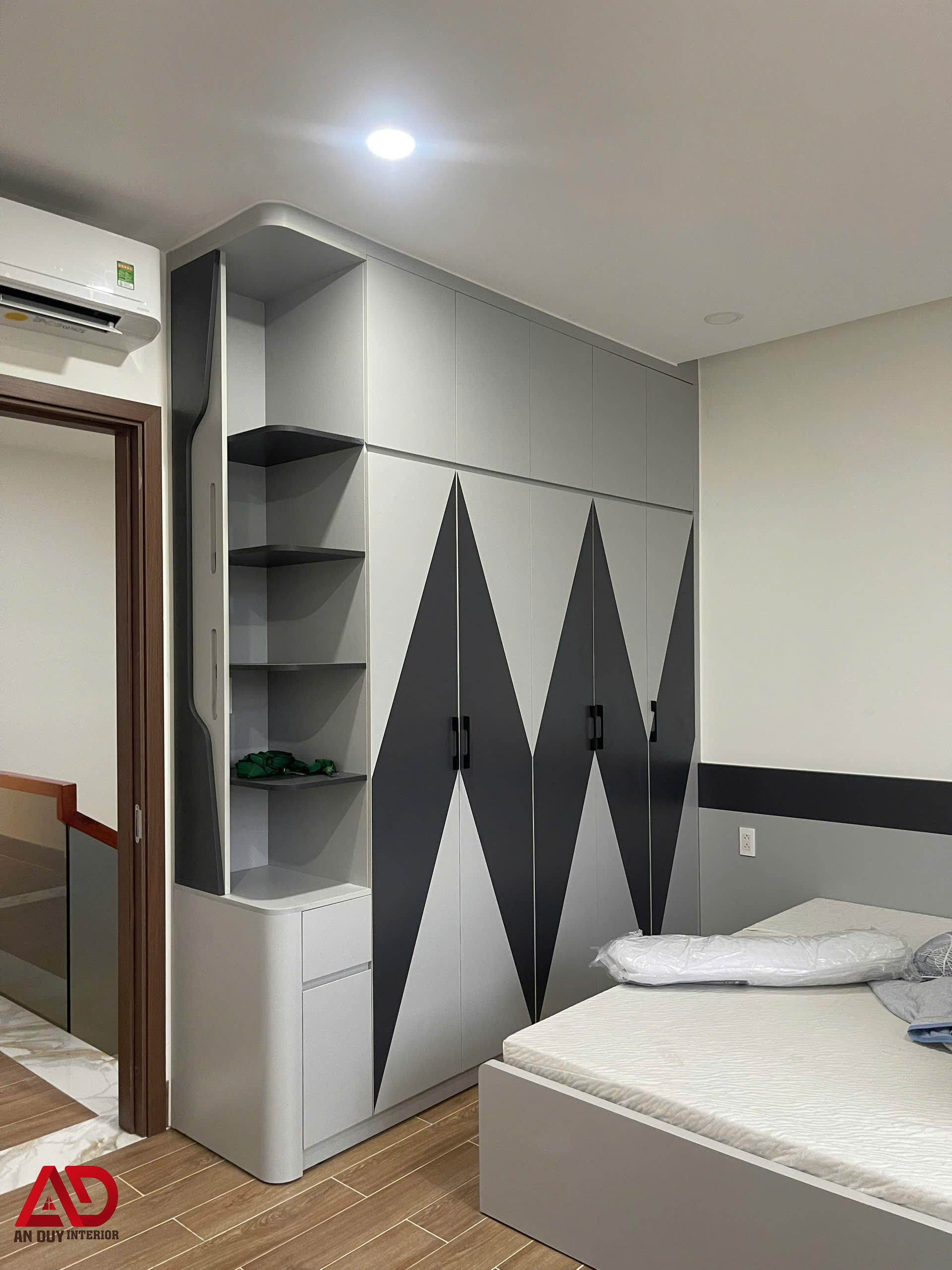 Phòng ngủ tiếp tục được triển khai theo hướng tối giản, công năng cao và có tính cá nhân hóa rõ nét. Với phòng ngủ mang tông xám, An Duy Interior sử dụng giường thấp, hệ tủ quần áo lớn, bàn học gắn tường và ghế băng cạnh cửa sổ để tạo nên không gian nghỉ ngơi tiện nghi, trẻ trung và phù hợp với nhu cầu sử dụng của người trẻ. Các mảng hình học trên cánh tủ giúp căn phòng có điểm nhấn mạnh về thị giác, hiện đại nhưng không quá nặng nề.