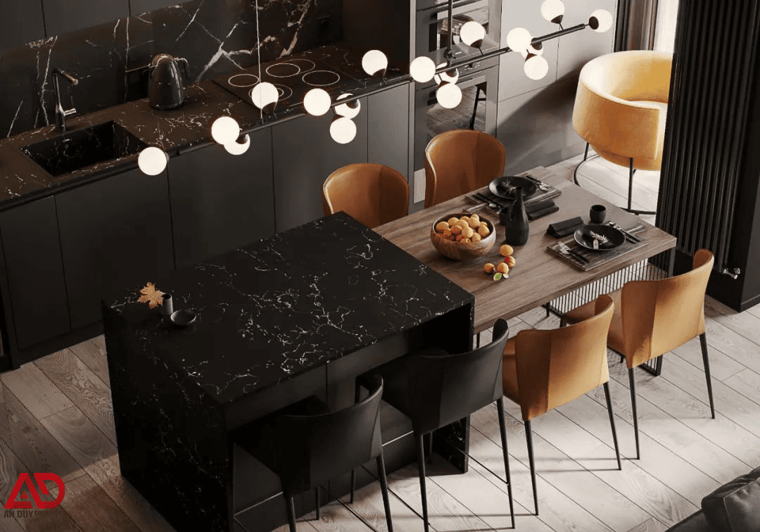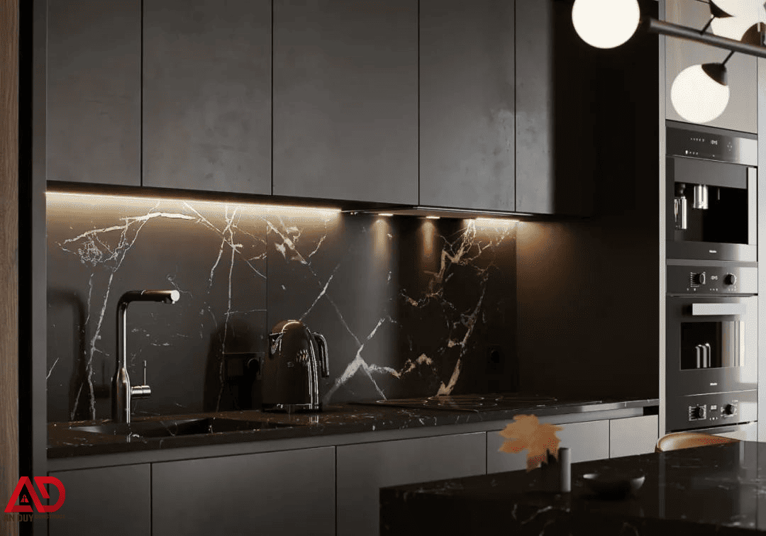 Không gian bếp trong dự án này cho thấy sự đầu tư chỉn chu về vật liệu và bố cục. Hệ tủ bếp trên dưới được thiết kế phẳng, màu đen nhám kết hợp gỗ, mang lại cảm giác sạch sẽ và tinh tế. Bề mặt đá vân trắng trên nền đen tạo hiệu ứng sang trọng rất rõ nét.